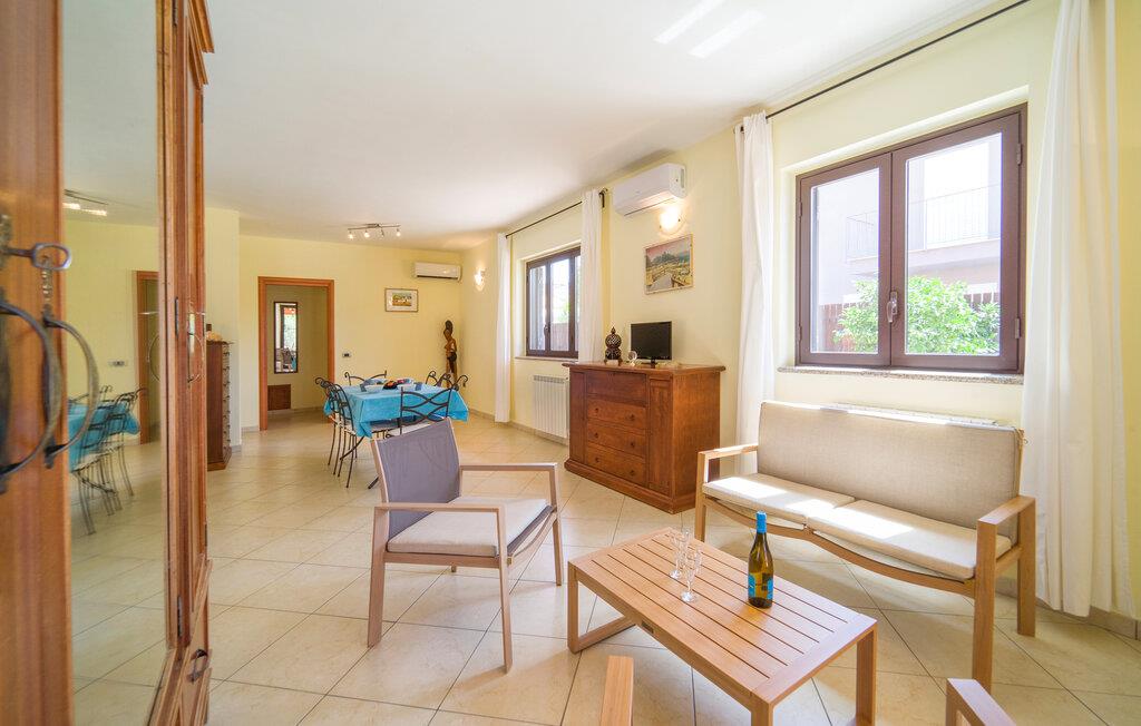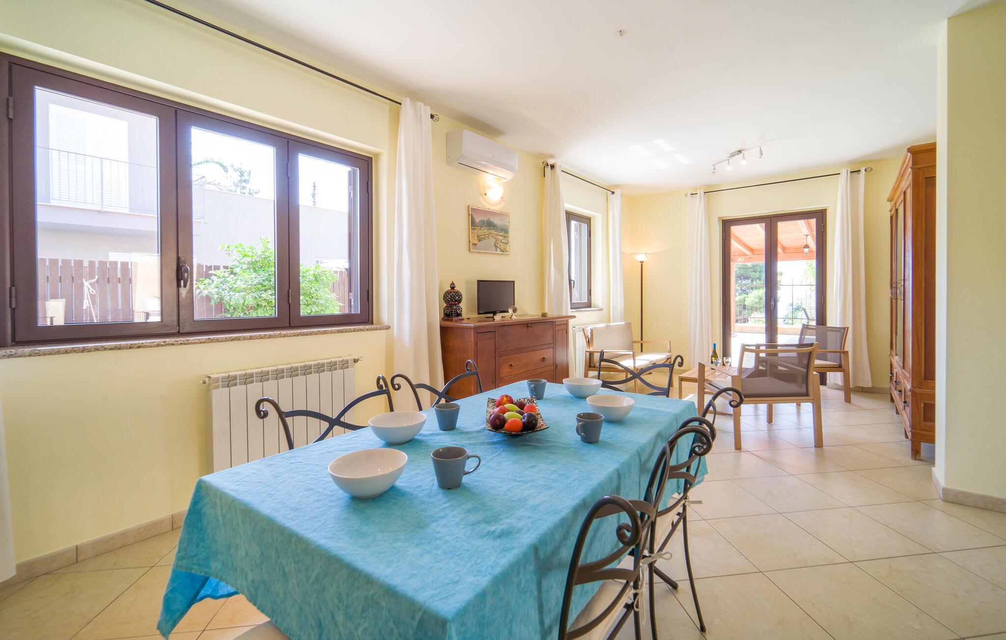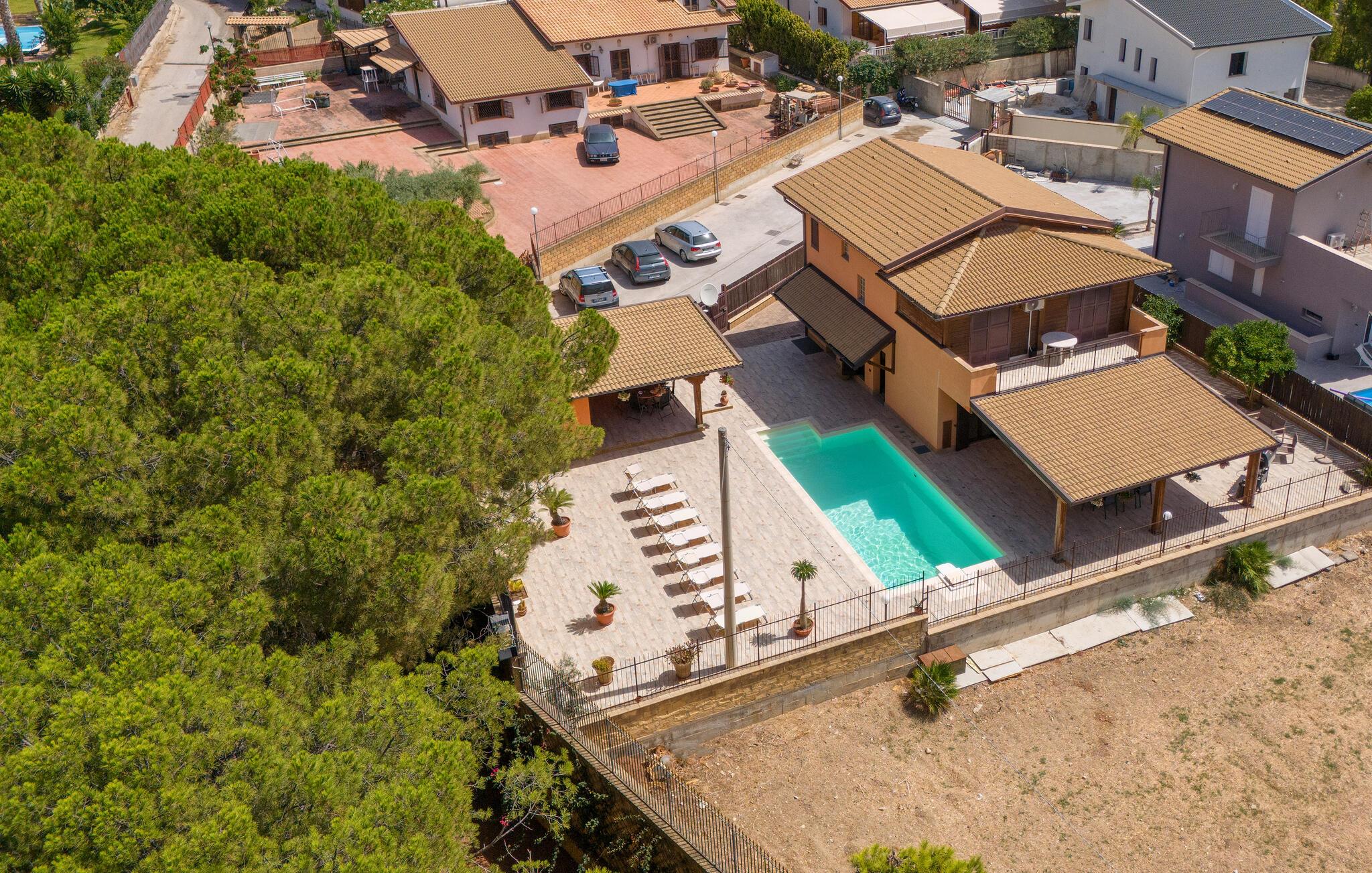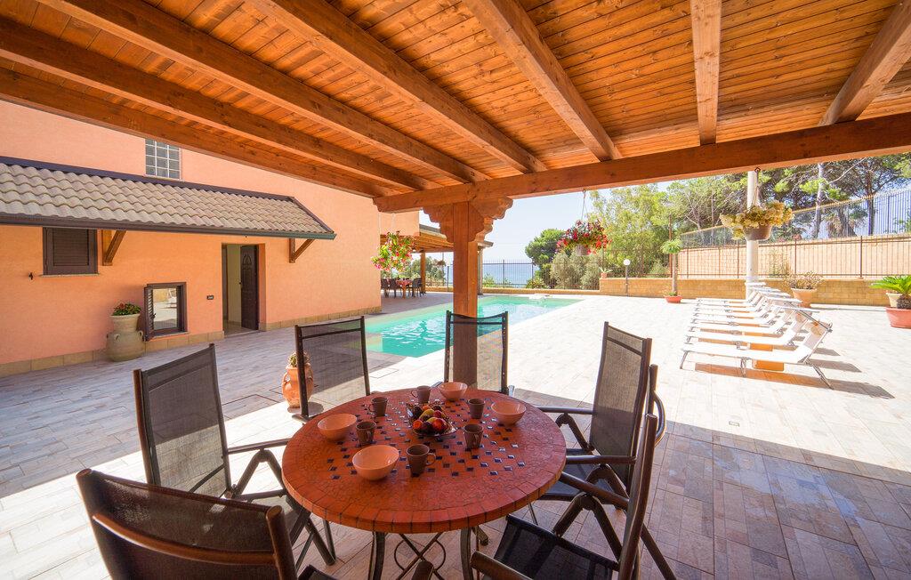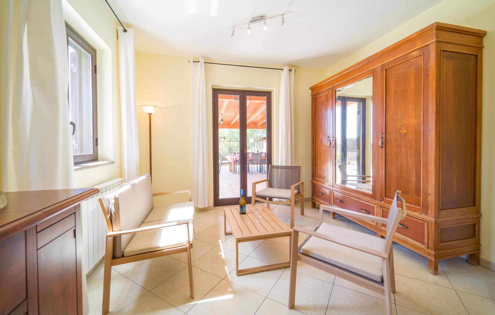 Auf Ihrer überdachten Terrasse lädt eine schöne Essgelegenheit zu stimmungsvollen Grillabenden ein. Erfrischen Sie sich nach Lust und Laune im Pool und machen Sie es sich mit einer unterhaltsamen Lektüre von Andrea Camilleri auf der einladenden Lounge bequem.