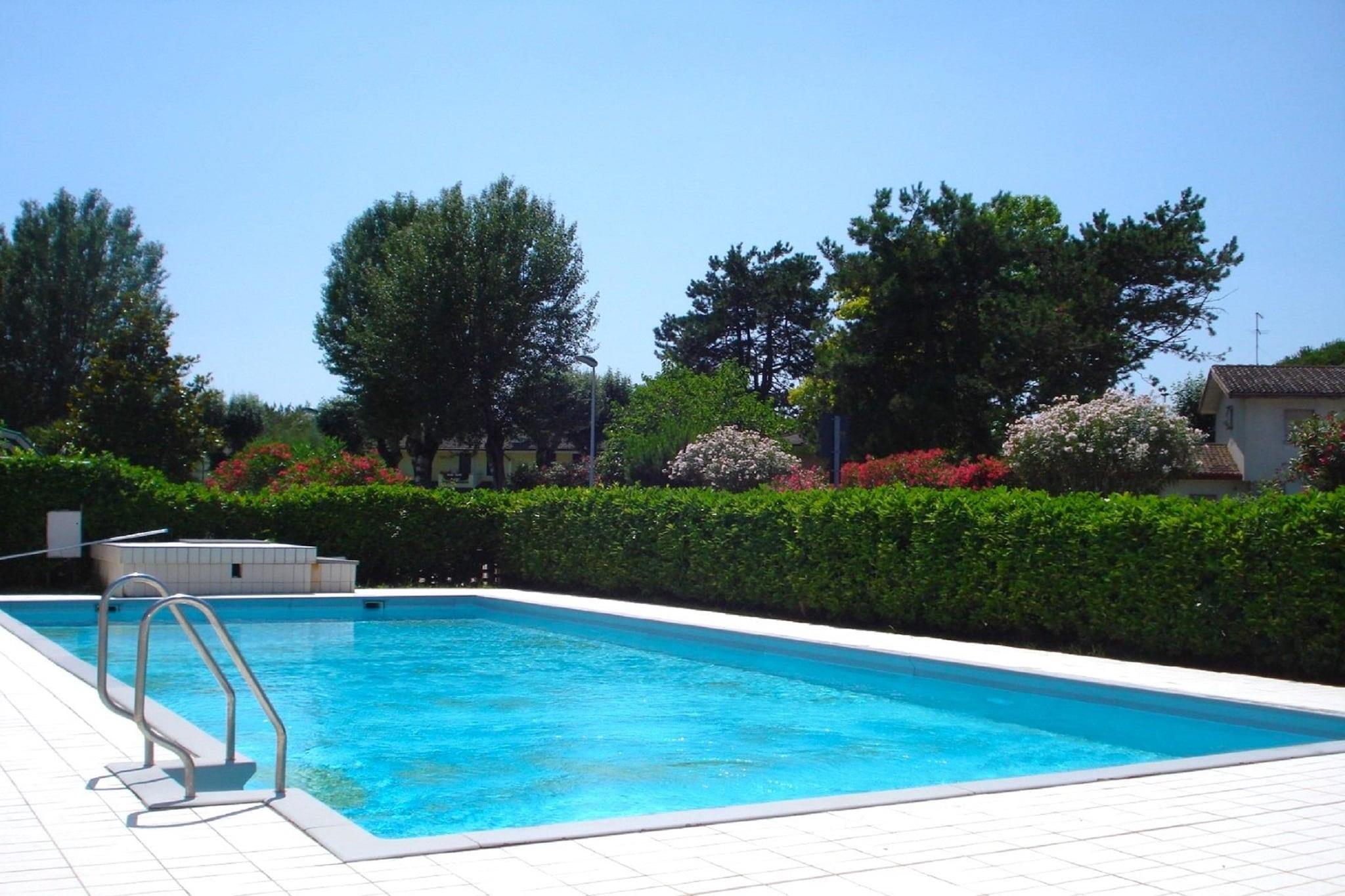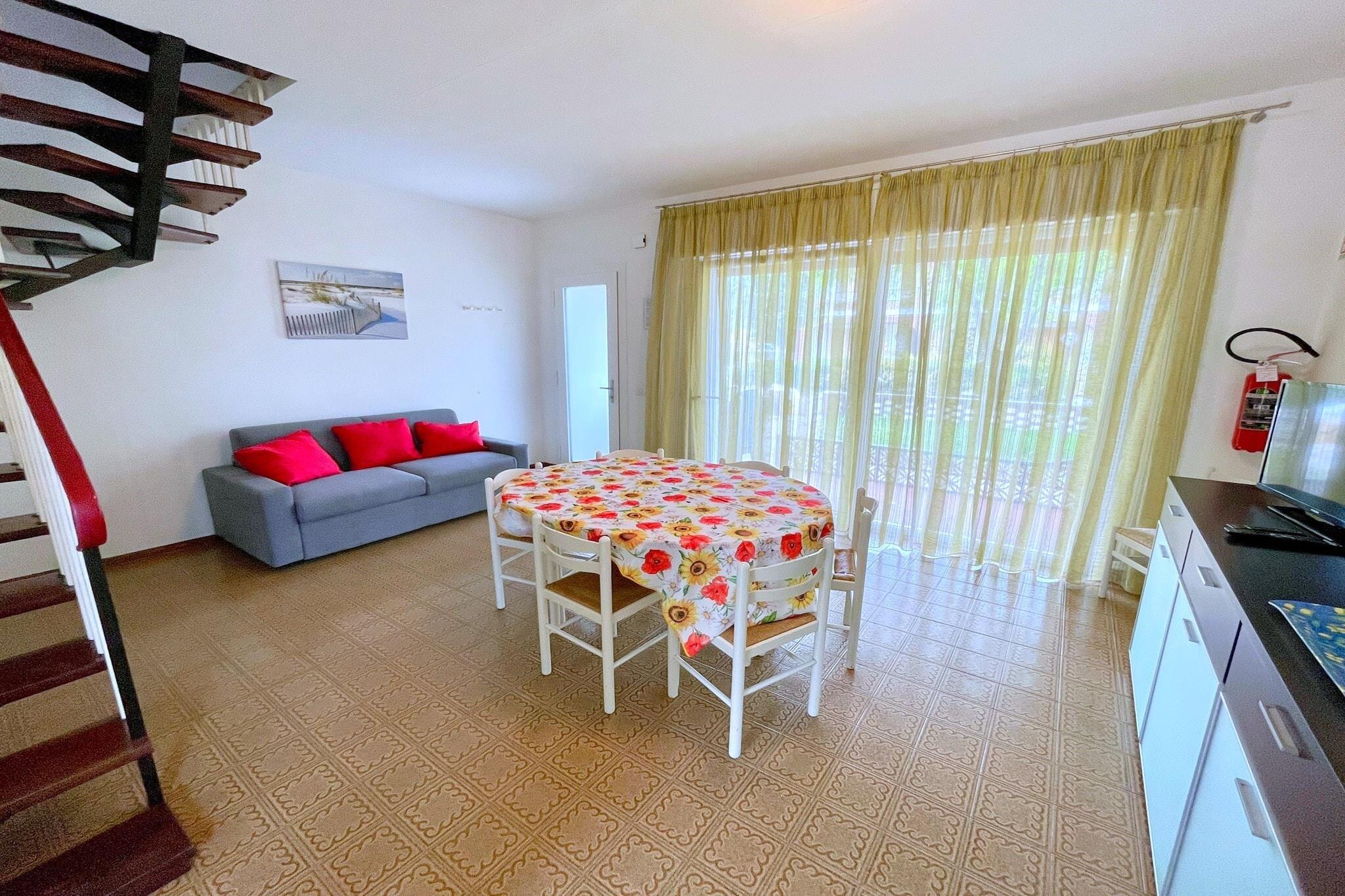 Welcome to this peaceful residential complex in Caorle - the two-level villa offers a comfortable and well-planned layout for families or small groups looking for a relaxed seaside stay with the benefit of shared pool facilities. On the ground floor, the living room features a double sofa bed, TV, and seating area where everyone can gather after a day at the beach. The open kitchen is fitted with a hob, oven, and fridge-freezer, making it easy to prepare meals at home. A fully equipped bathroom on this level adds everyday convenience. Upstairs, the sleeping area is thoughtfully arranged with two bedrooms: one with a double bed and the other with a double bed plus a bunk bed, making the villa suitable for mixed groups of adults and children. A second full bathroom serves this floor. From here, you also access the private terrace, a pleasant spot for outdoor meals or quiet evening moments. Outdoors, guests enjoy a private garden with garden furniture and a barbecue, along with access to the residence’s outdoor swimming pool. Air conditioning, a washing machine, and private parking complete the practical comforts that make longer stays easy and enjoyable. With beaches, cafés, restaurants, and Caorle’s historic centre all within easy reach, this villa provides a balanced mix of privacy, shared leisure facilities, and coastal convenience for a classic Adriatic holiday.