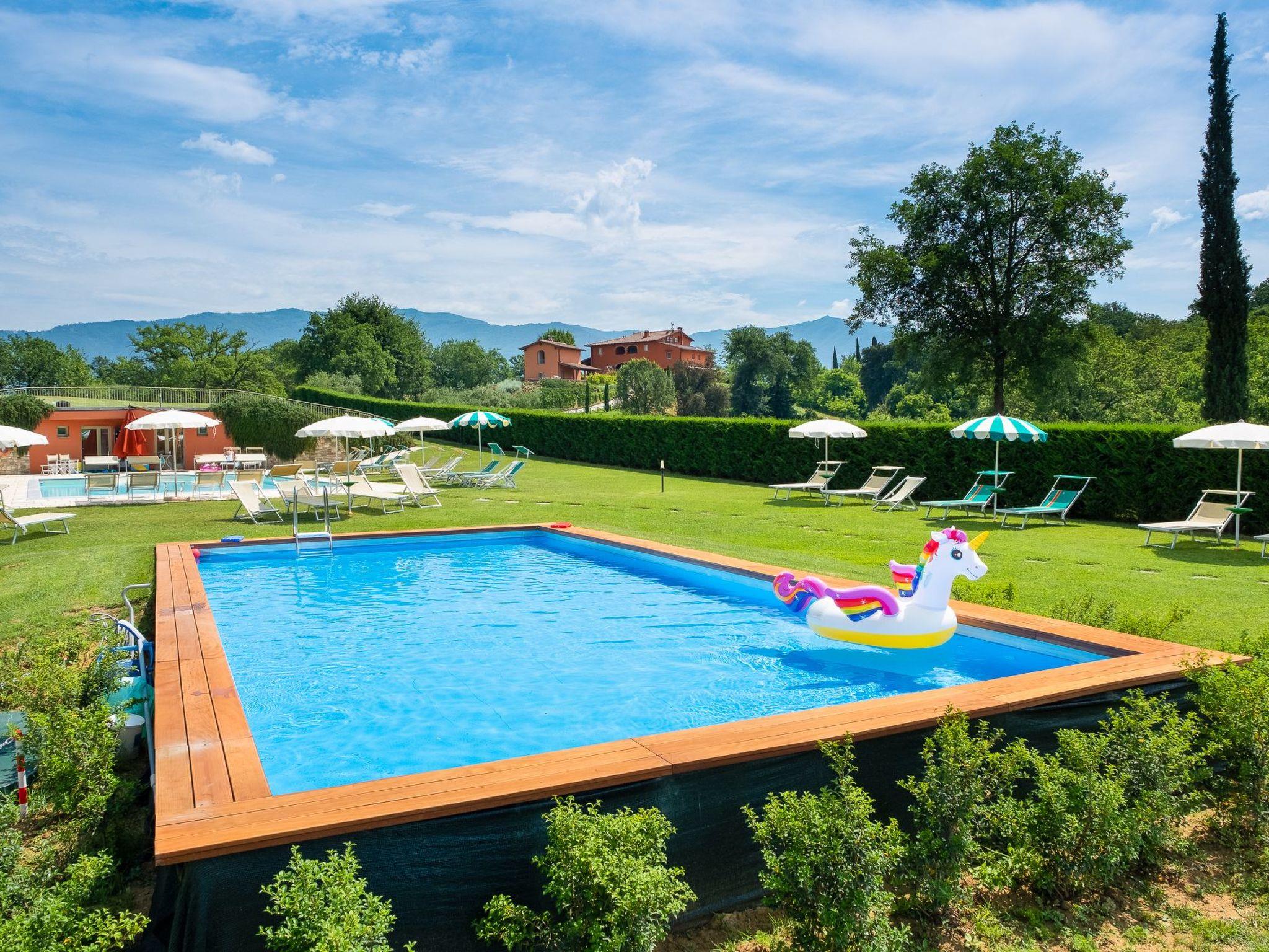 A large communal pool area includes two swimming pools (open from May to mid-October, 16x8 m, 140 cm deep, with salt water and 12x6 m, 60 cm deep) surrounded by deck chairs, sun loungers, garden umbrellas and a small children's area with sandpit and swing.