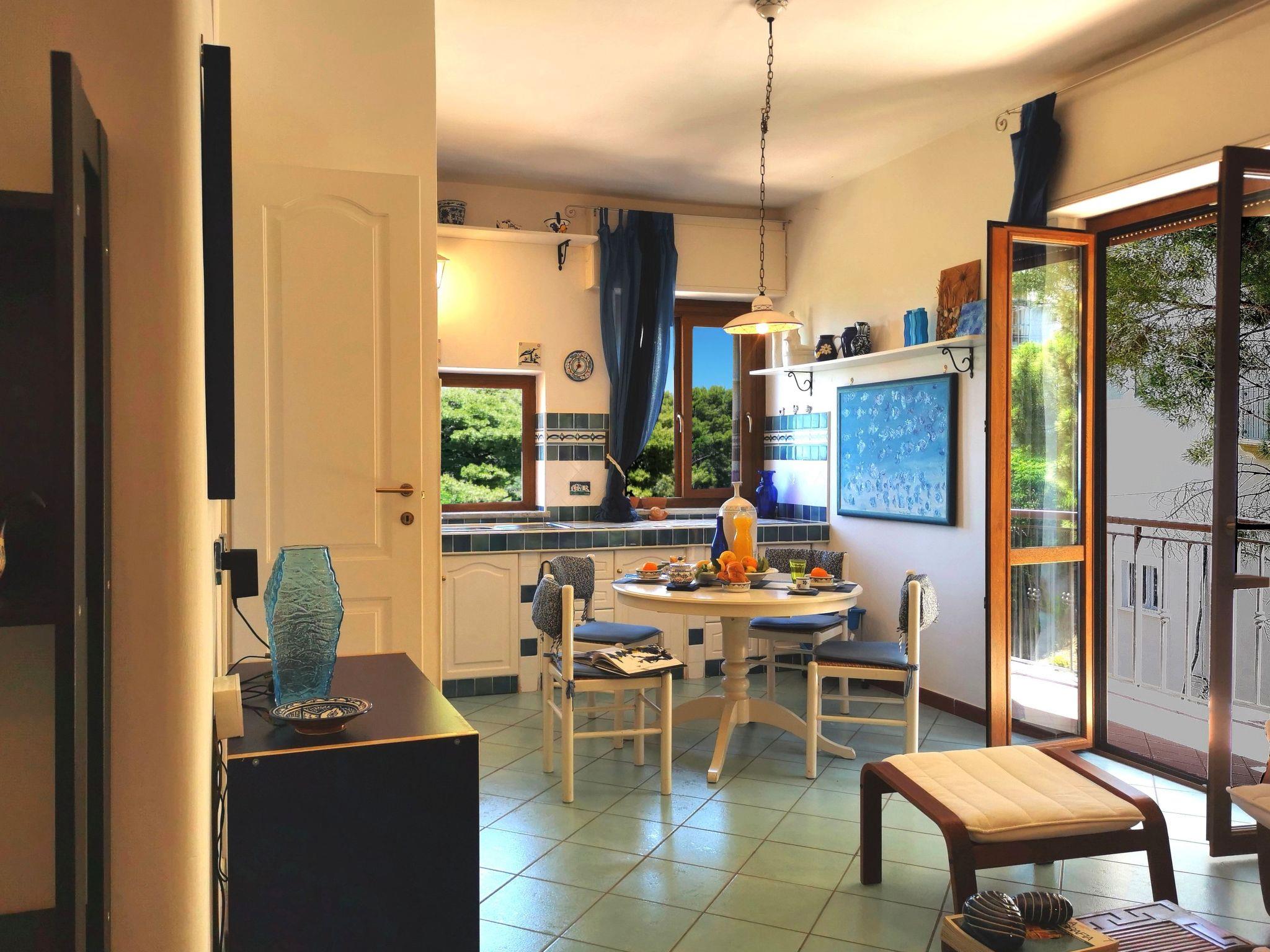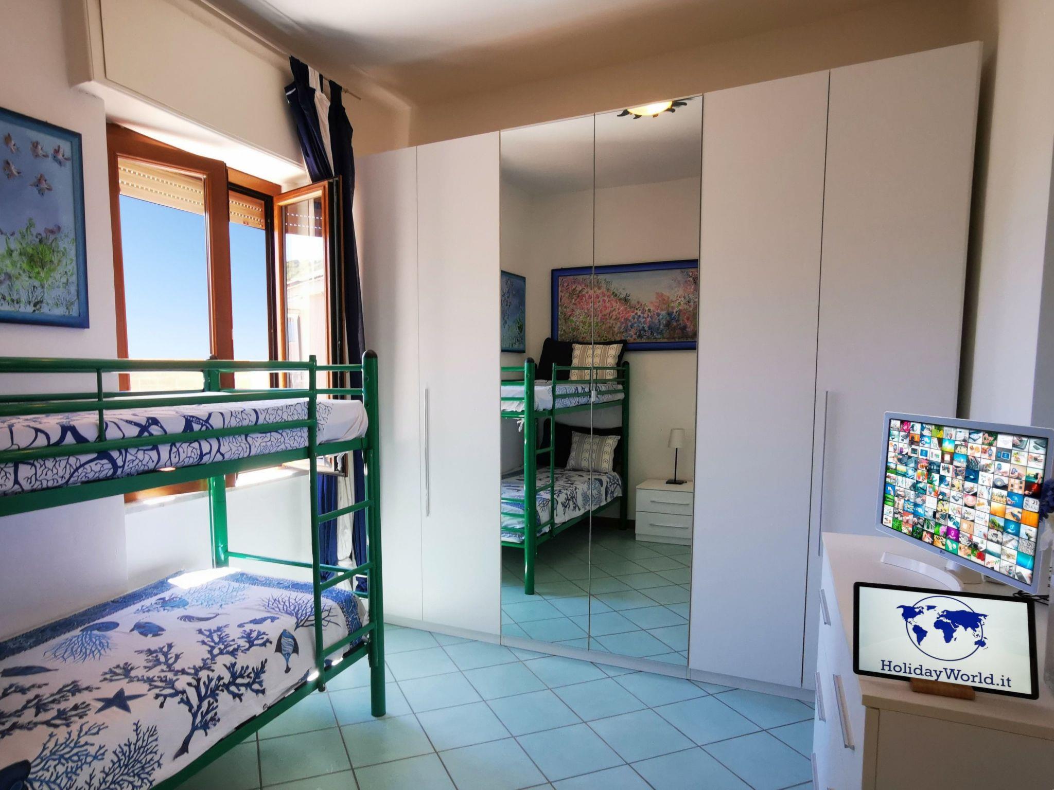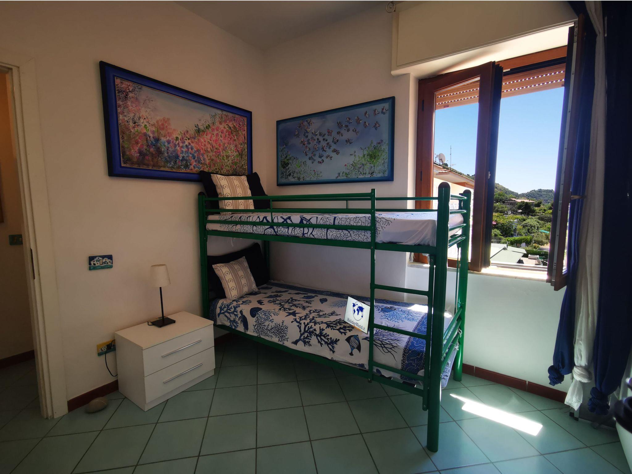 Meditheia is a refined accommodation located in Mezzatorre di San Mauro Cilento, 100 metres from its beautiful beach. The house is on the fourth floor of a 1970s building with a beautiful view of the sea. It consists of a living area with living room, kitchenette and dining area. From here and from the balcony there is a wonderful panoramic view of the sea and Punta Licosa, which offers magnificent sunsets. A double bedroom, a second bedroom with two bunk beds and a windowed bathroom complete the accommodation. The well-kept interiors are in shades of blue and aquamarine, in Mediterranean style, and blend harmoniously with the surrounding landscape.