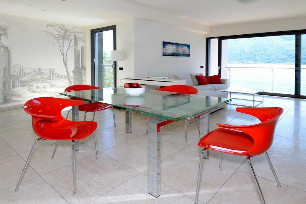Das luxuriöse Appartment Barcarola erstreckt sich über 2 Ebenen und bietet mit seinem besonderen Ambiente den richtigen Rahmen für gelungene Ferien am Comer See. Die obere Ebene der Wohnung besteht aus dem lichtdurchfluteten Wohnraum - ganz in weiß gehalten - mit passend ausgesuchter Designerküche, einem großen Balkon mit beeindruckendem Seeblick sowie einem Schlafzimmer mit dazugehörigem schicken Bad. Eine interne Treppe führt nach unten. Dort sind dann ein weiteres Schlafzimmer mit Ausgang zum Garten, ein zweites Bad mit Sauna sowie der Zugang zum Poolbereich, dem Highlight dieser Wohnung: den Gästen steht ein privater Pool zur Verfügung umgeben von Holzdecks, mediterran bepflanztem Garten und sensationellem Blick auf dem Comer See. Hier können die Gäste ganz privat relaxen und die Sonne genießen. Ausstattung und Möblierung sind exclusiv, alles sehr schön hell und von modernem Design. Im Wohnraum wird eine Wand durch ein Original-Fresco einer Künstlerin aus Verona geziert, was dem Raum eine besondere Atmosphäre verleiht. Weitere Originalkunstwerke erfreuen das Auge. Die Gäste genießen die Sonne auf dem Balkon oder auch mal ein schattiges Plätzchen in einem der privaten Gartenanteile mit den Holzdecks, die vom Schlafzimmer aus zu erreichen sind.