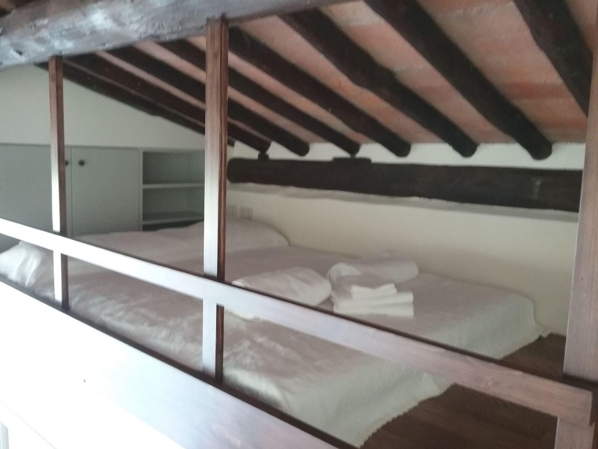 "La Loggia" is 100 square metres; a large window lets light into the living area, consisting of the kitchen, bathroom and living room; in addition, there is a loft where a bed with a floor mattress has been created. A short staircase then leads to the bedroom with a double bed, a small single bed and a cot; connected to the bedroom is the second bathroom.