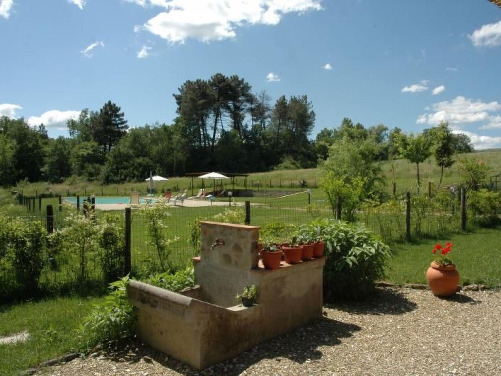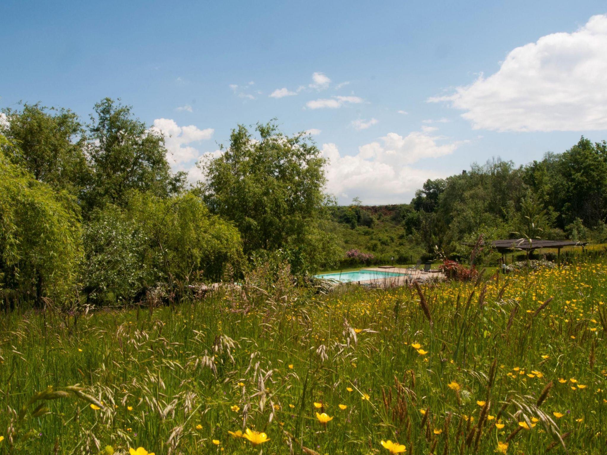 Inside, the apartment extends a warm welcome with its efficiently arranged living spaces. The ground floor is dedicated to the dining and living area, featuring a kitchen equipped with a gas cooker, an espresso coffee pot, and an electric kettle, making meal preparation a breeze. A staircase leads to the first floor, where two cozy bedrooms and a shower room await. The master bedroom, boasting a four-poster bed, offers a delightful view of the communal pool, and the twin bedroom presents a serene countryside vista. A fan is provided to ensure your comfort during warmer days.