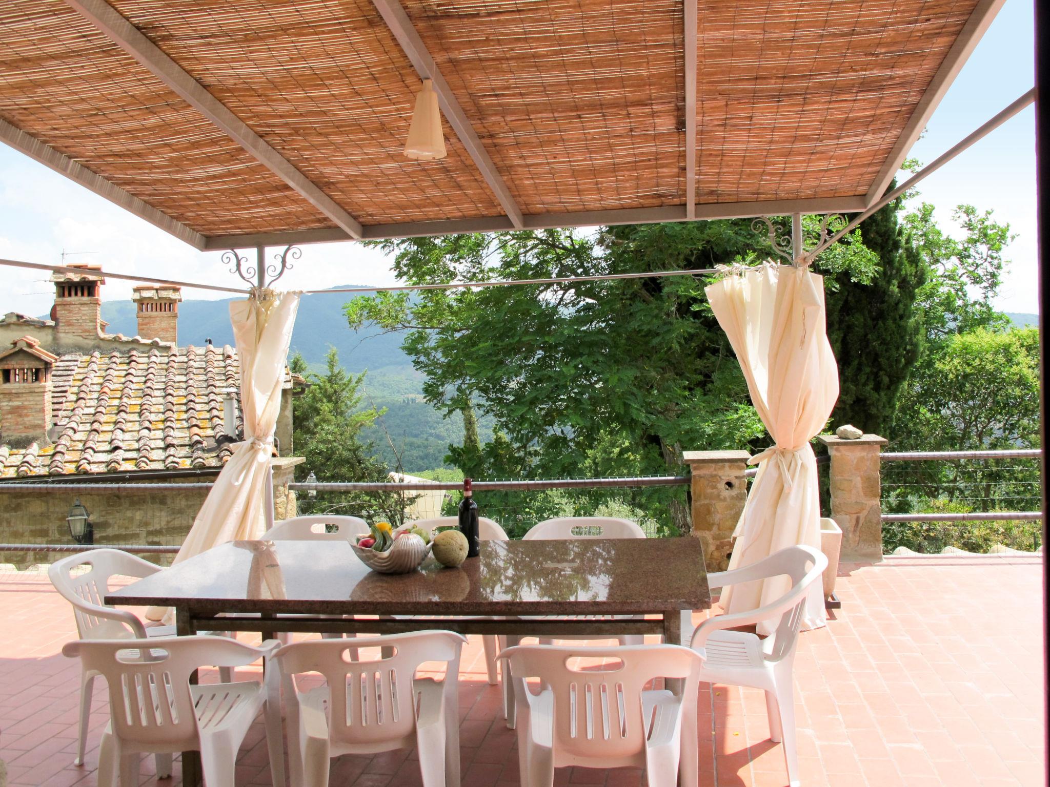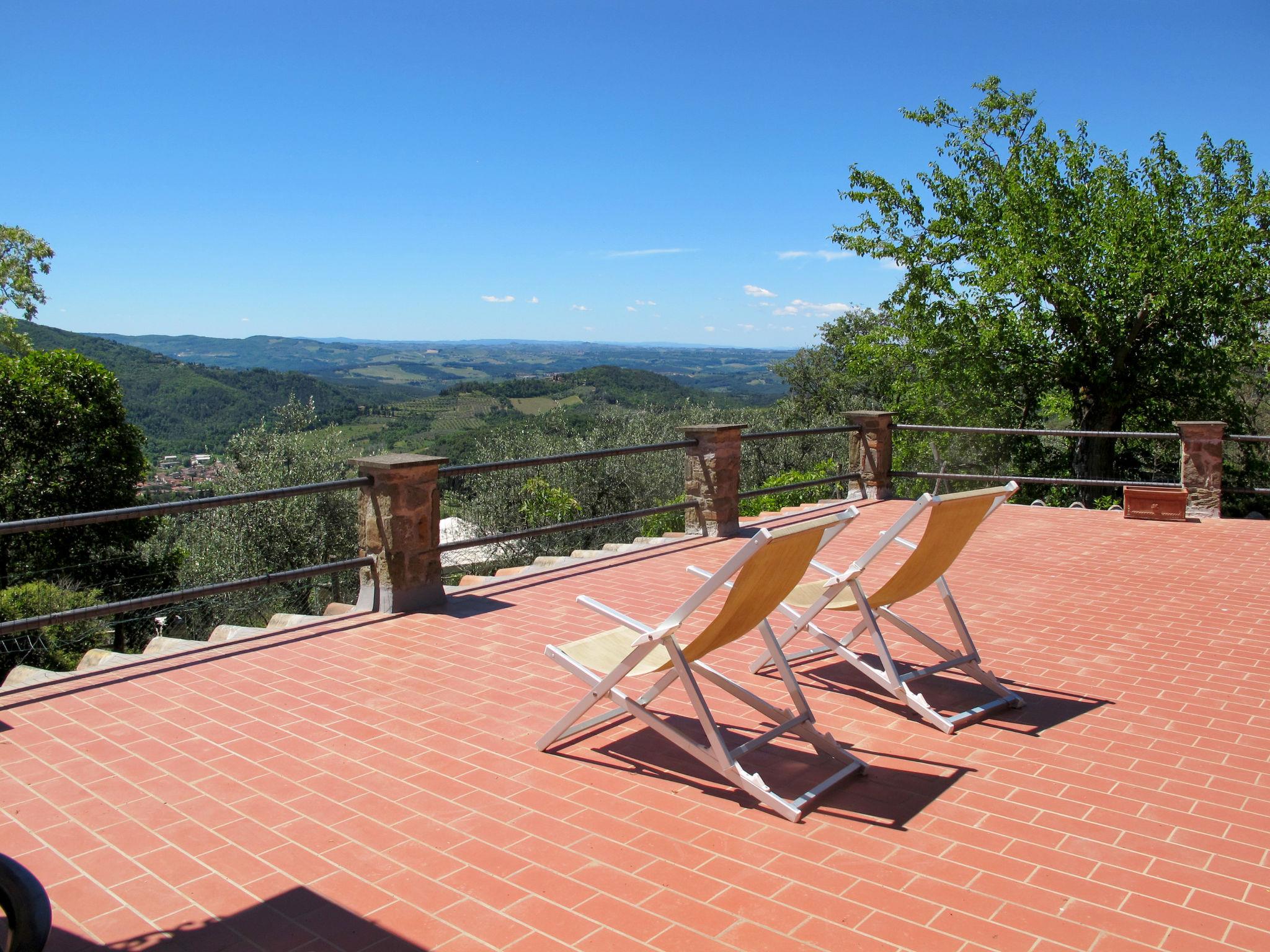 "Fienile", 5-room semi-detached house 110 m2 on 2 levels. Spacious, rustic and antique furnishings: large living/dining room with open-hearth fireplace, dining table and satellite TV. Exit to the terrace. 2 double bedrooms. Small kitchen (2 hot plates, oven, dishwasher, 4 gas rings, toaster, kettle, microwave, electric coffee machine). Exit to the balcony. Shower/bidet/WC. Upper floor: 1 double bedroom. 1 room with 2 beds (80 cm). Shower/bidet/WC. Heating (extra). Natural stone floors. Balcony, large terrace 40 m2 partly roofed. Terrace furniture, balcony furniture, barbecue. Marvellous panoramic view of Chianti. Facilities: children's high chair, baby cot for up to 2 year olds, hair dryer. Parking (2 cars) at the house. Please note: suitable for families. Non-smokers only. Maximum 2 pets/ dogs allowed. Private entrance. IT048021B5HUDSPMZM