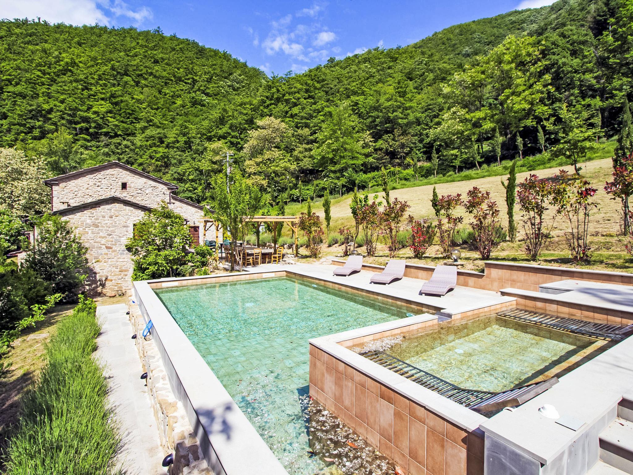 Country house "La Valchiera", renovated, surrounded by trees. 5 km from the centre of Sansepolcro, in a quiet, sunny, elevated position, 10 m from the river. Private: property 20 ha, terraced garden, natural pond, swimming pool (10 x 5 m, depth 100 - 130 cm, seasonal availability: 13.May. - 06.Oct.). Hot tub, patio, garden furniture, barbecue, pool maintenance by the owner/gardener. In the house: internet access, infrared sauna, relaxation room, spa area, washing machine, tumble dryer. Cook on request. Parking on the premises. Grocery 4 km, supermarket 4 km, restaurant 2 km, bar 2 km, bus stop 50 m. Riding stable 2 km. Nearby attractions: Anghiari 15 km, Arezzo 40 km.