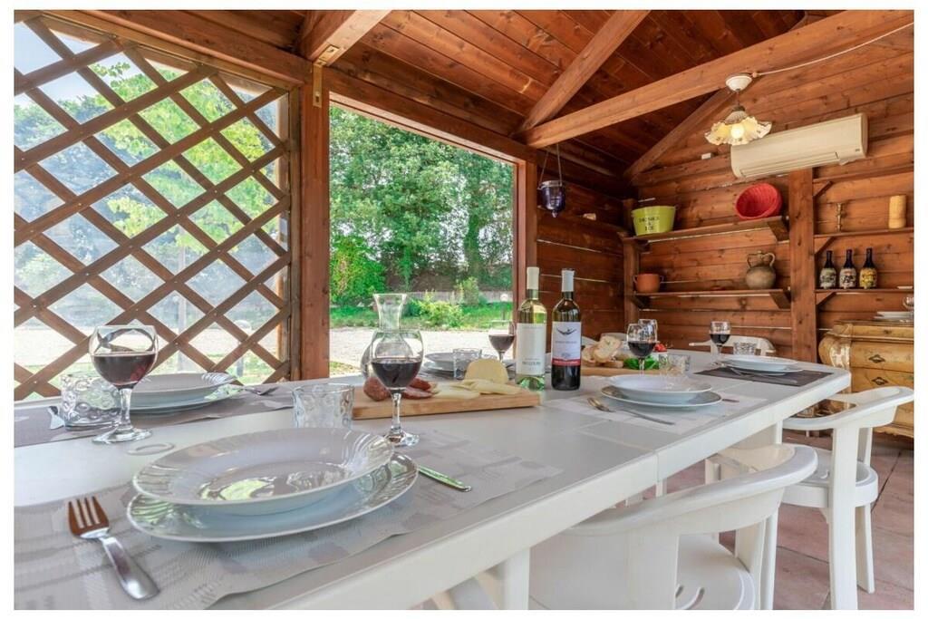 Sie bietet Platz für bis zu 14 Personen, hat 5 Schlafzimmer und 3 Badezimmer. Die Villa degli Archi liegt nur wenige Kilometer von Sant'Elpidio a Mare und den Badeorten der Küste der Marken entfernt. Eingebettet im Grünen, ist das Anwesen von einem eingezäunten Garten mit Grill und Privatparkplatz für 5 Autos umgeben. Im Garten befindet sich ein hölzerner Pavillon mit Klimaanlage und einem Esstisch, ideal für Mahlzeiten im Freien mit Freunden. Im Außenbereich gibt es einige Sitzecken, Tische, Stühle und einen schönen Pool (4 x 8 m, Tiefe 1,20 m), der von Mai bis September geöffnet und mit Liegestühlen ausgestattet ist. Vom Pool aus hat man einen atemberaubenden Blick auf das adriatische Meer und die sanften Hügel der Marken. Die Villa wurde vor kurzem nach Kriterien der ökologischen Nachhaltigkeit renoviert und ist auf einer Ebene im Erdgeschoss untergebracht. Sie kann bis zu 14 Personen beherbergen, hat 5 Schlafzimmer und 3 Badezimmer. Internet Wifi ist inbegriffen. Alle Zimmer sind klimatisiert. Alle Fenster sind mit Moskitonetzen ausgestattet. Haustiere sind erlaubt. Der Eigentümer der Villa wohnt ca. 20 Minuten entfernt und hilft den Gästen gerne, wenn sie während ihres Aufenthalts etwas brauchen. Sie werden von einem großen und hellen, offenen Wohnbereich empfangen, der ausgestattet ist mit: Sofas, Klavier, Esstisch, Kamin, Fernseher, 3 großen französischen Schiebetüren (mit direktem Zugang zum Garten) und einer voll ausgestatteten Küche (mit Backofen, Kühlschrank, Mikrowelle und Geschirrspüler). Das Wohnzimmer hat ein Zwischengeschoss, in dem sich ein Sofa mit Leseecke, einige Sessel und ein Spieltisch befinden. Der Schlafbereich besteht aus 5 geräumigen Schlafzimmern, die wie folgt aufgeteilt sind: 2 Zweibettzimmer; 2 Zweibettzimmer mit je einem Schlafsofa; 1 Vierbettzimmer (ein Doppelbett + 1 Etagenbett) mit eigenem Bad mit Dusche. Es gibt auch 2 weitere Badezimmer mit Dusche.
