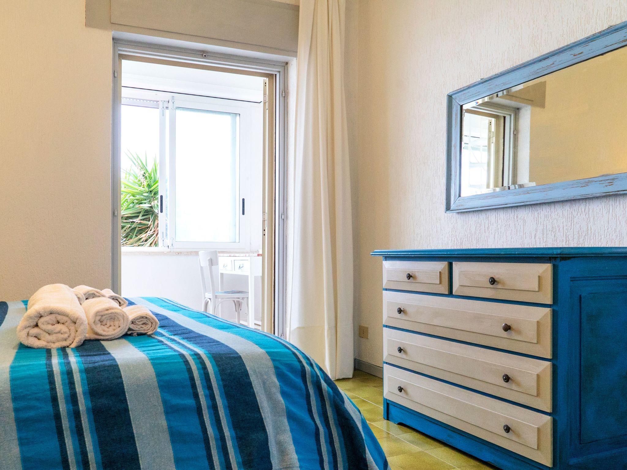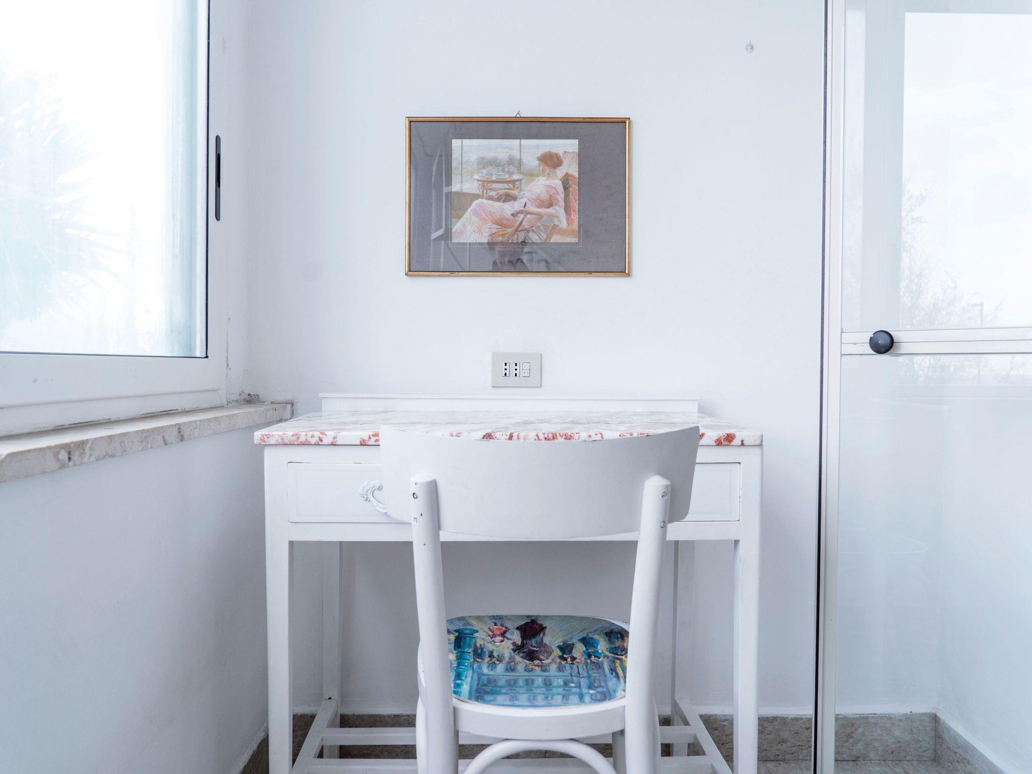 The interior of the flat is carefully designed to ensure maximum comfort. On the ground floor, a spacious living room with sea view and fireplace invites you to relax, flanked by a fully equipped open kitchen and a service bathroom. Going up to the first floor, there are two cosy double bedrooms and a bathroom with shower. From the sea-view room, there is access to a charming glassed-in balcony and, via a spiral staircase, to the solarium, perfect for waking breakfasts or dinners under the stars that will remain etched in your memories.