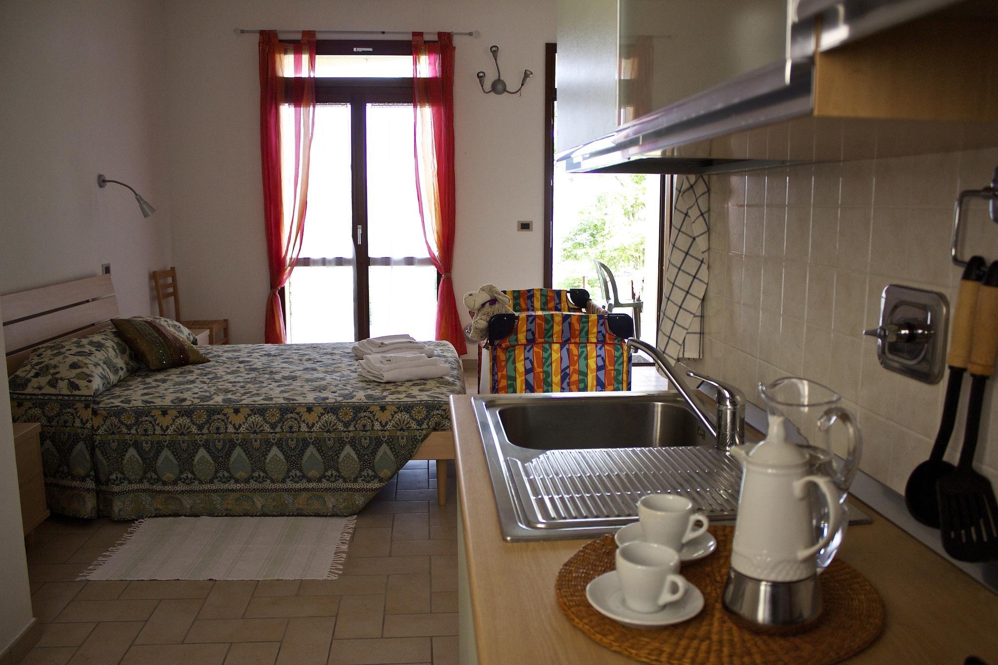 Ground floor: (open kitchen(fridge-freezer), Living/bed room(double bed, TV(satellite)), bathroom(shower, washbasin, toilet, bidet), heating, terrace) garden(shared with other guests), garden furniture, parking, children's bed