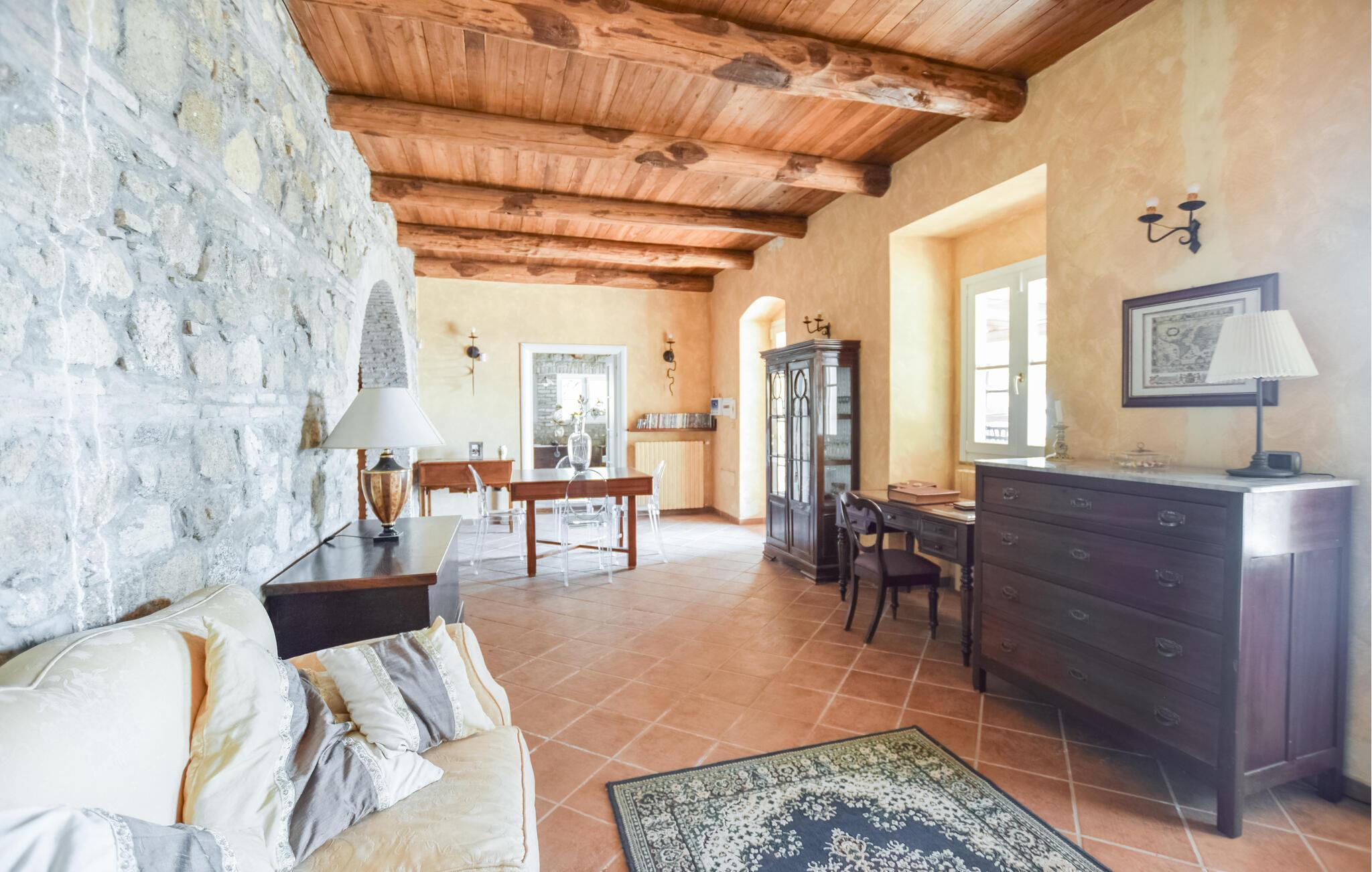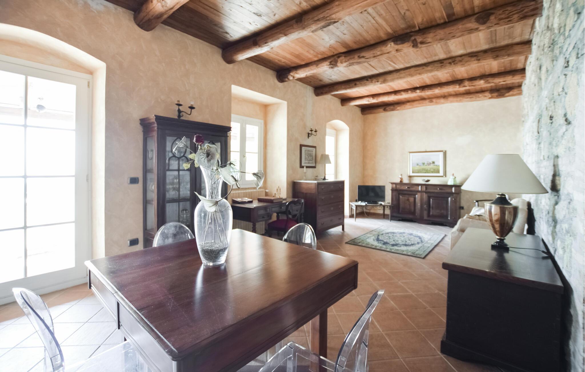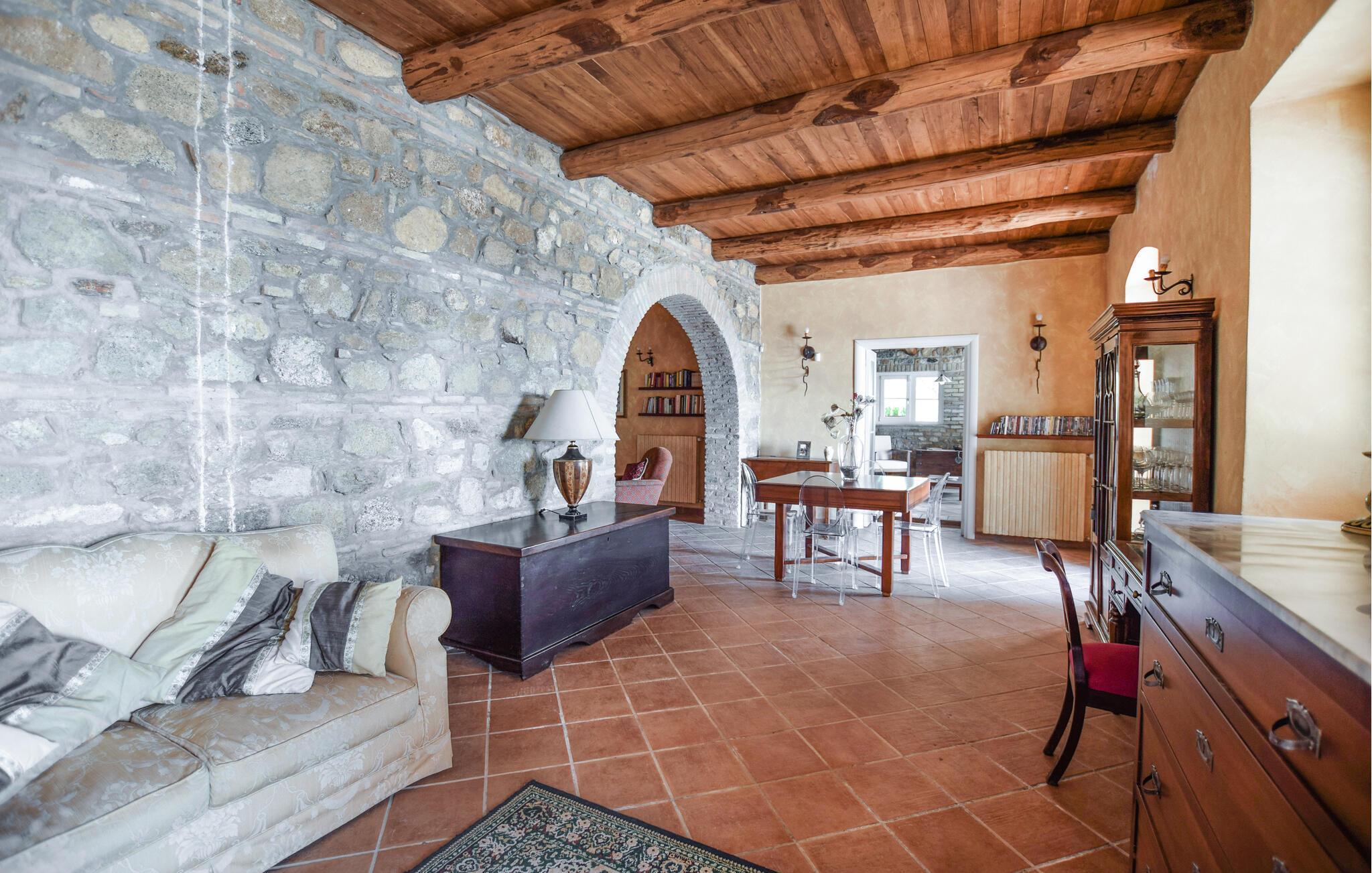 Genießen Sie rustikale Eleganz in diesem komfortablen Ferienhaus mit Pool.
