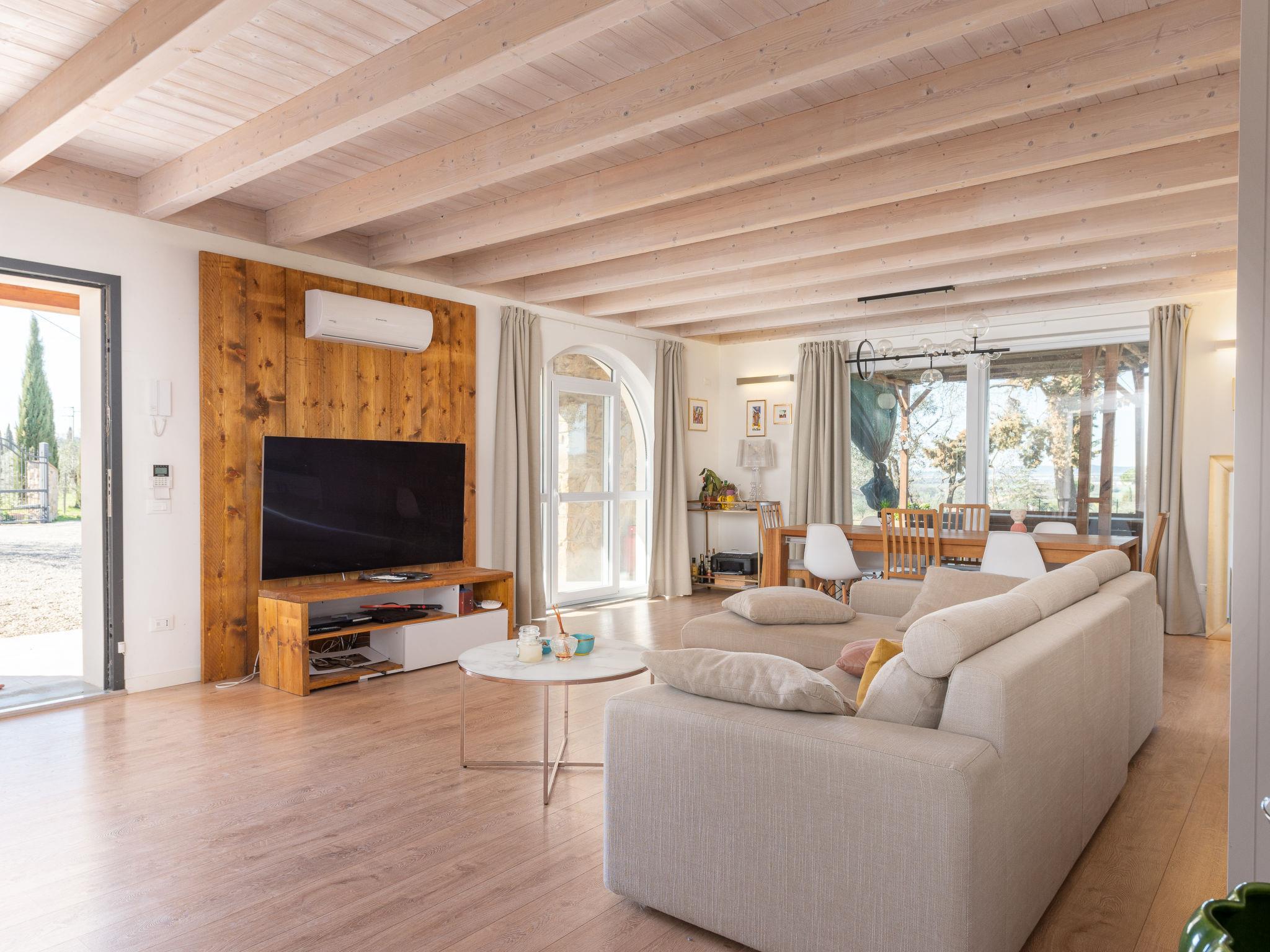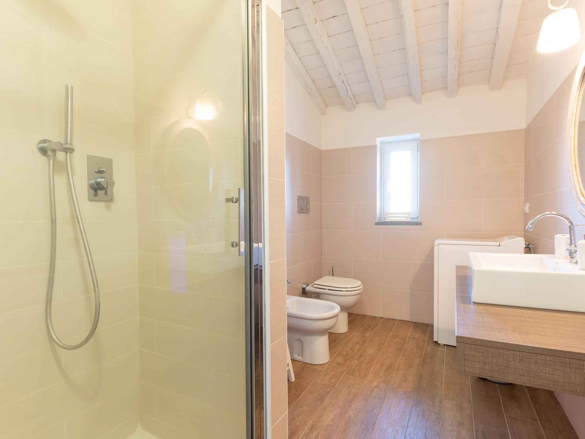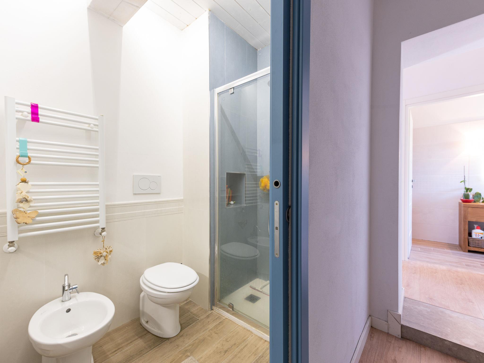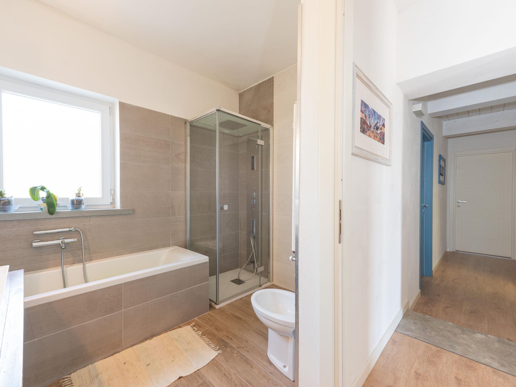 8-room house 300 m2 on 2 levels. Spacious and bright, tasteful furnishings: open large living/dining room with panoramic window with dining table, flat screen and air conditioning. Exit to the garden, to the terrace. 1 double bedroom. 1 room with 1 bed. 1 small room with 1 bed. Kitchen (oven, dishwasher, 4 induction hot plates, toaster, kettle, microwave, electric coffee machine). Shower/bidet/WC, bath/shower/bidet/WC. Upper floor: living room with 1 double sofabed, dining table and TV. 2 rooms, each room with 1 bed, 1 double bed and air conditioning. 1 double bedroom with air conditioning. Open kitchen (4 induction hot plates, microwave, electric coffee machine). 2 showers/bidet/WC. Wood heating. Solar power. Facilities: washing machine, iron, mosquito net, baby cot for up to 2 year olds, hair dryer. Internet (WiFi, free). Parking at the house. Maximum 1 pet/ dog allowed. No internal connecting door between the floors. The house consists of one large flat on the ground floor and two on the first floor, there is no internal connection between the floors, the two flats on the upper floor have a common internal staircase for access. IT053024C25B9M6GEN