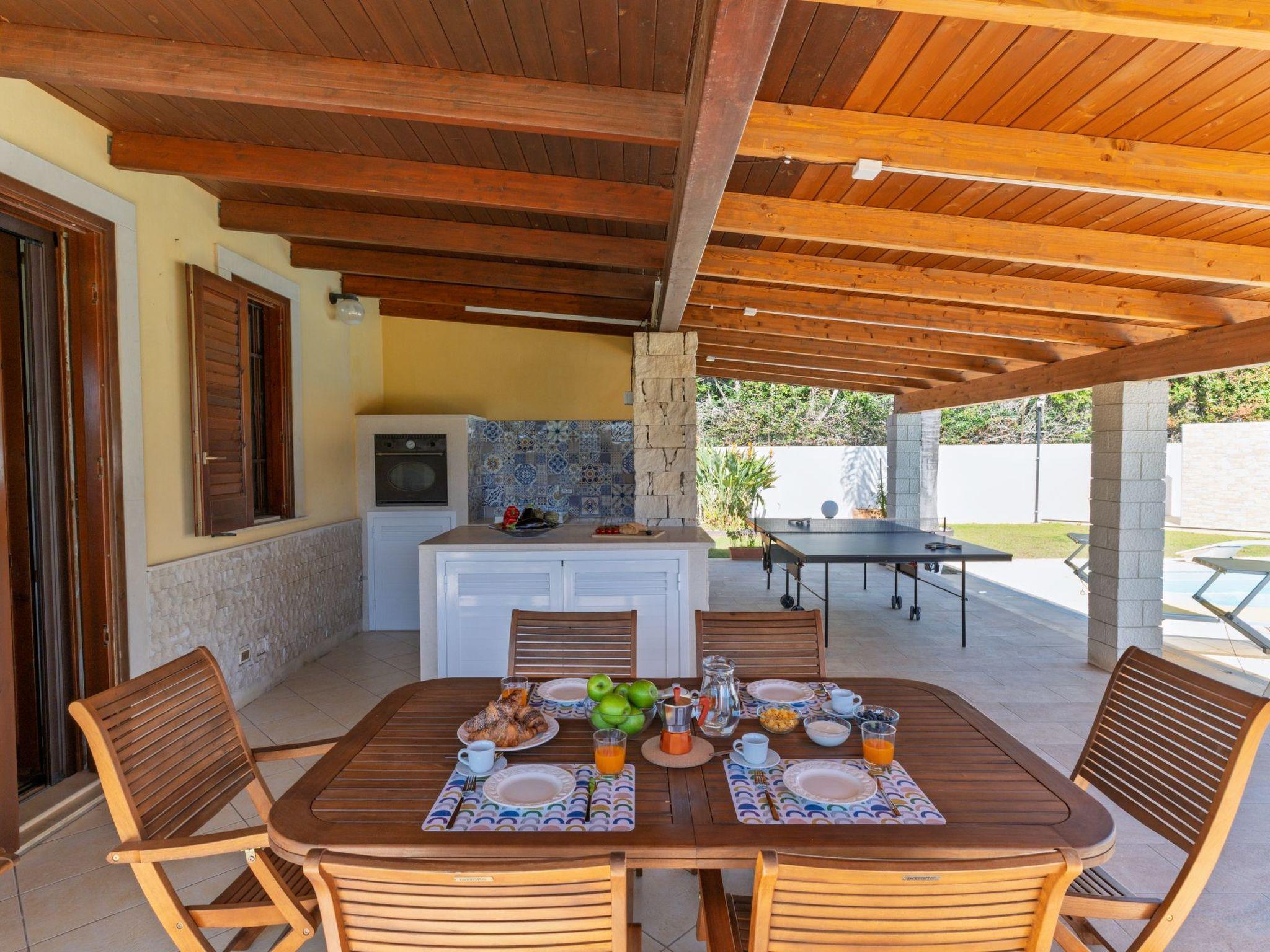 The villa enjoys numerous outdoor spaces where you can relax: a large terrace surrounds the entire house and is furnished with outdoor lounges and a dining table, a gazebo by the pool with a sofa and armchairs, and a relaxation corner in the shade of a charming century-old olive tree.
