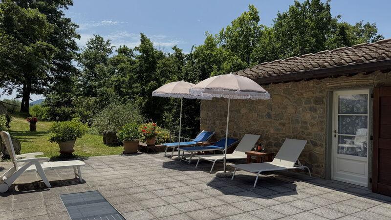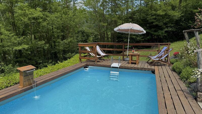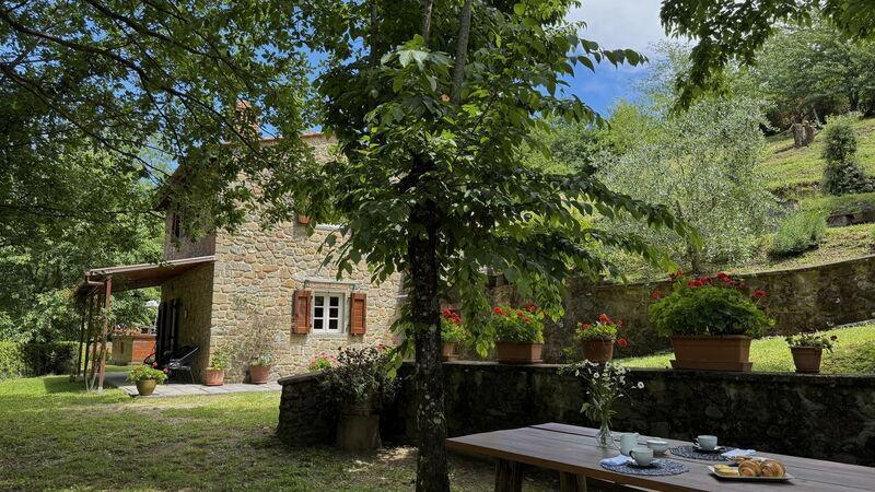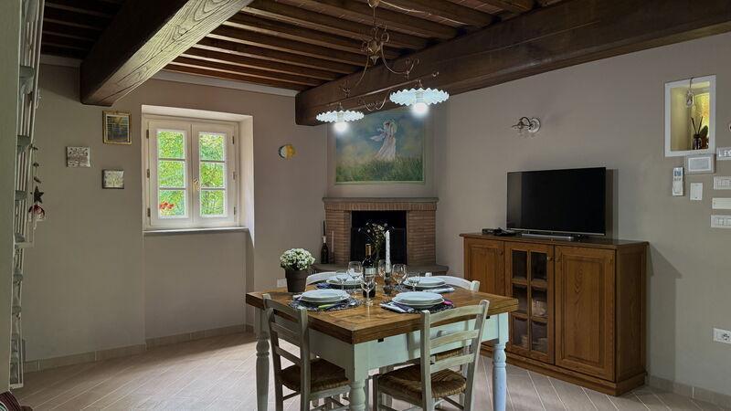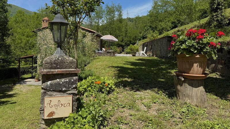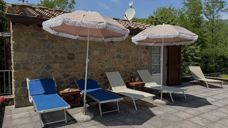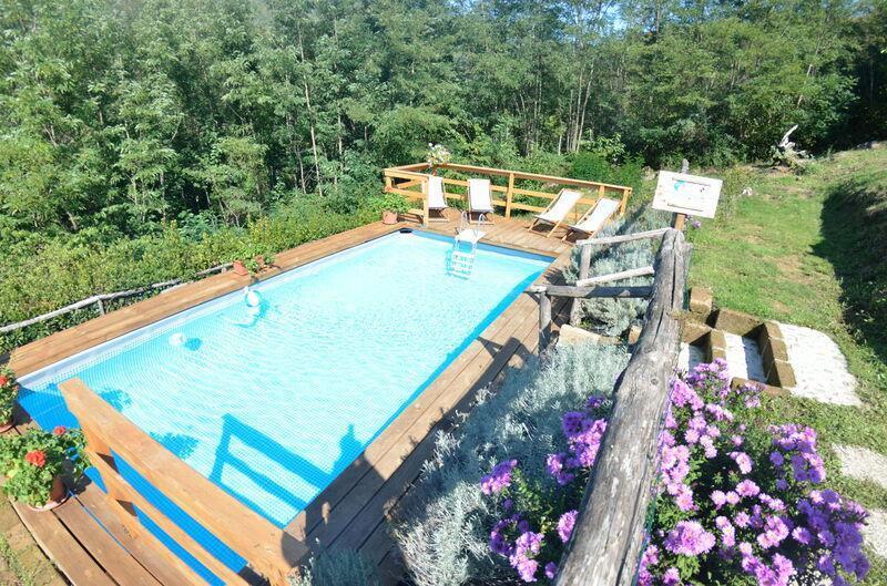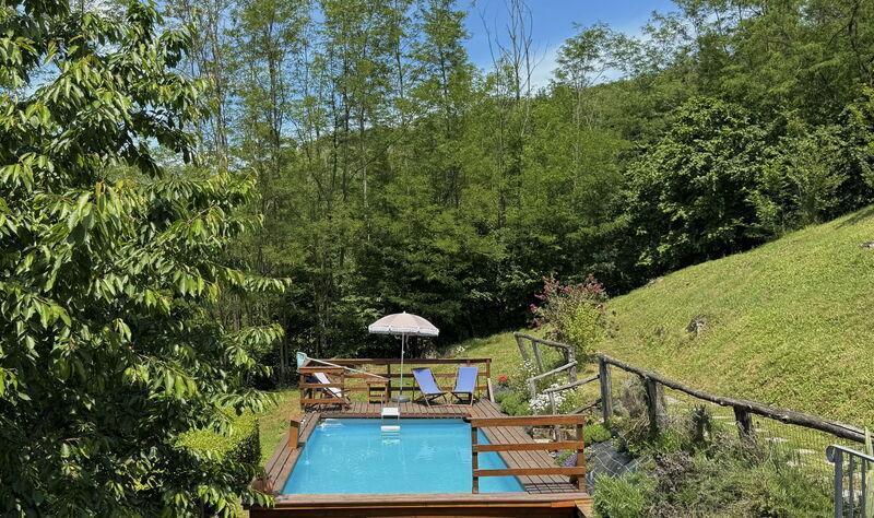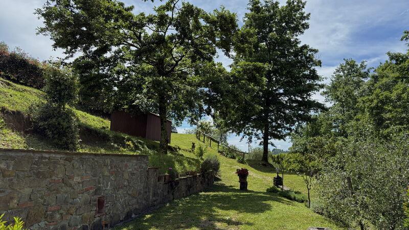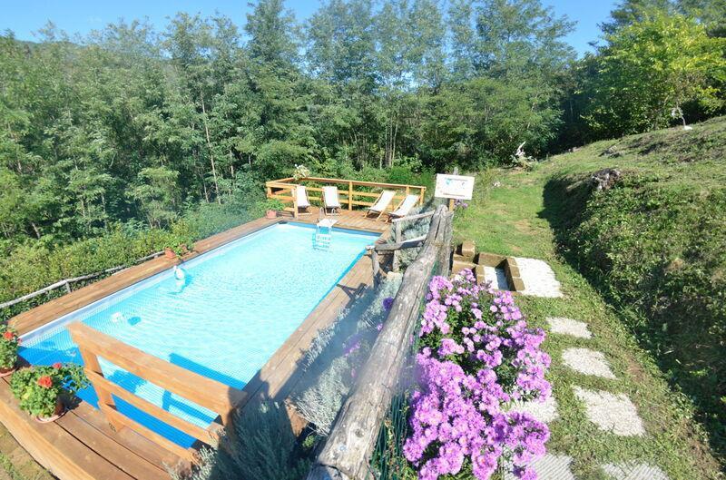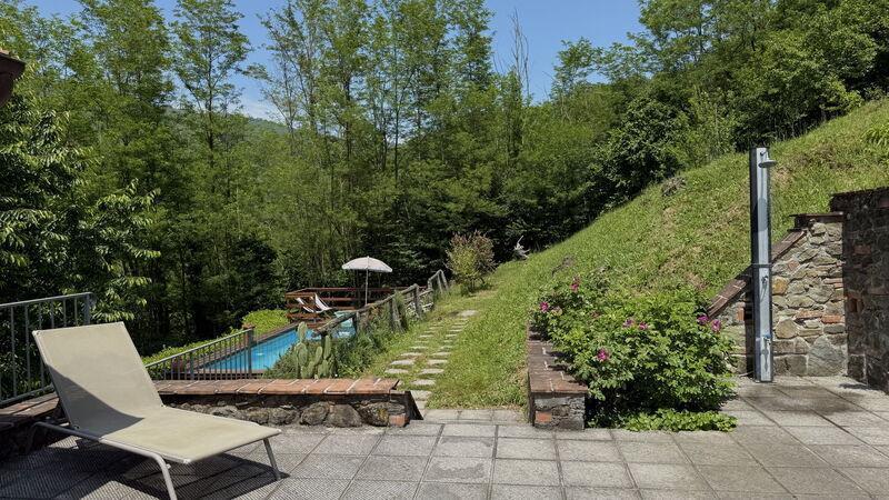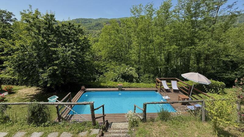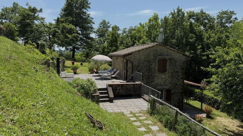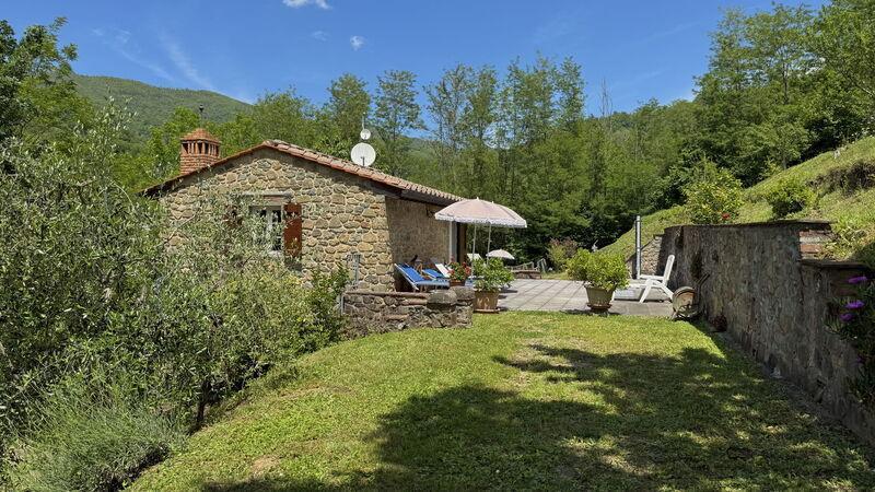 This lovely cottage is located within a natural park, on the hills, overlooking the city of Pescia, surrounded by chestnut trees und characterized because of its medieval hamlets, where time seems to have stopped. The owners restored the house with much love and converted it into a cozy holiday home.The grounds extend on about 2,5 hectares – olive groves and woods, the garden of about 1’000 sqm is set in terraces; equipped with a table, chairs, sun-umbrella and swimming pool (half set in earth, 7.30x3.80m, depth: 1.20m, equipped with deckchairs and external shower. Parking within the grounds.To access the house you have to take a narrow road, which goes downhill, partially asphalted with two narrow curves. You may park your car also on the main street and the owner will take you for this short piece of access.This spot of quietness and peace is the ideal choice for guests who look for a relaxed holiday Make adventurous meetings with dears, porcupines and oaks. You have the possibility to have strolls within total nature, visit the nearby hamlets, which seem attached on the rocks. The nearby village of Sorana is famous for its delicate beans which are a base for local dishes. You can see the village of Castelvecchio from your holiday home.Entrance on the ground floor: spacious living-cum-dining room with couch, dining table, fire-place, SAT-TV, kitchenette with electric stove, oven, fridge/freezer, dish-washer, 1 twin bedroom, 1 bathroom with hydro massage shower, WC, bidet, basin, stairs to the 1st floor:1 big double bedroom with 1 four-poster bed and 1 single bed plus 1 extractable bed, stunning views on the hamlet of Castelvecchio, 1 bathroom with shower, wc, bidet, basin, exit onto a terrace, from which you have access to the garden and to the swimming pool. The house is furnished with much care by the owners and painted in pastel colors; beamed ceilings. The house disposes of air-conditioning and WIFI. Washing machine.The holiday home is suitable for handicapped persons: there are sliding doors (90 cm wide).Pool opened from beginning of May until end of September, for the exact dates please contact us.