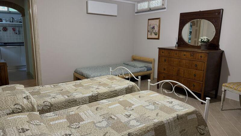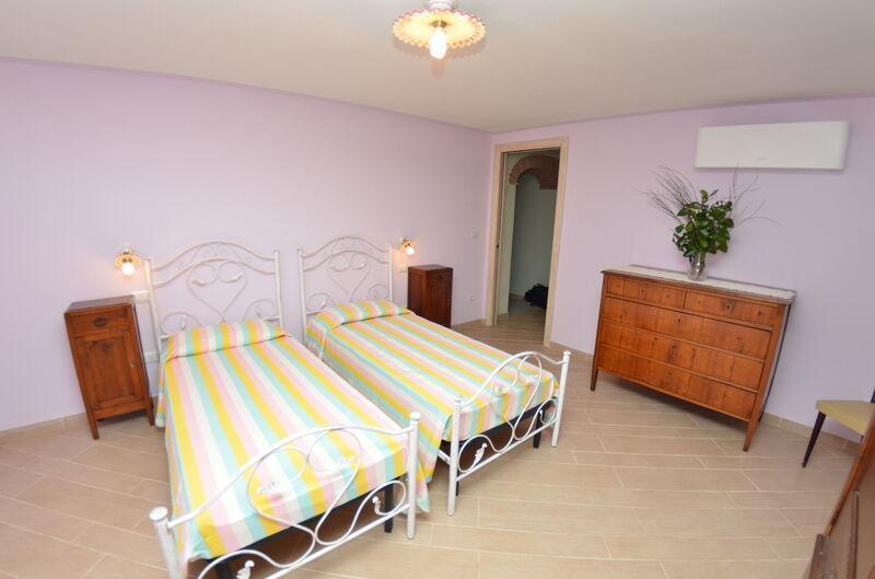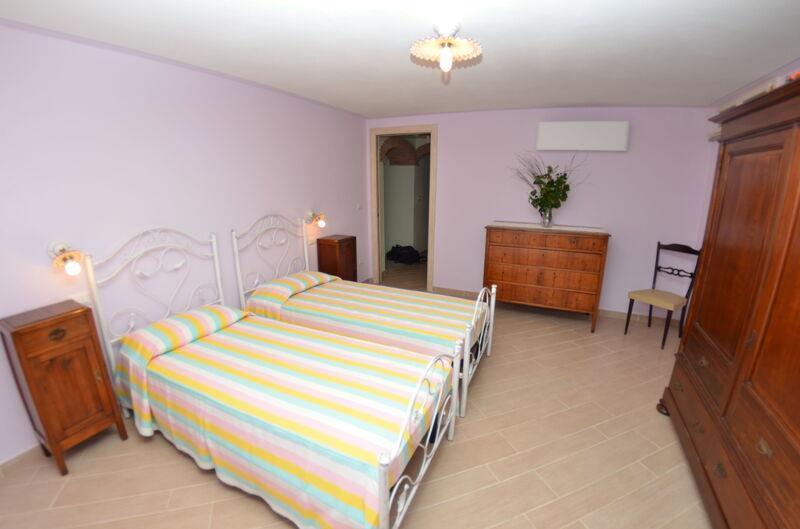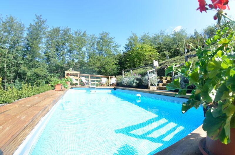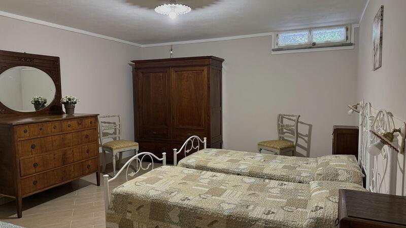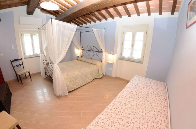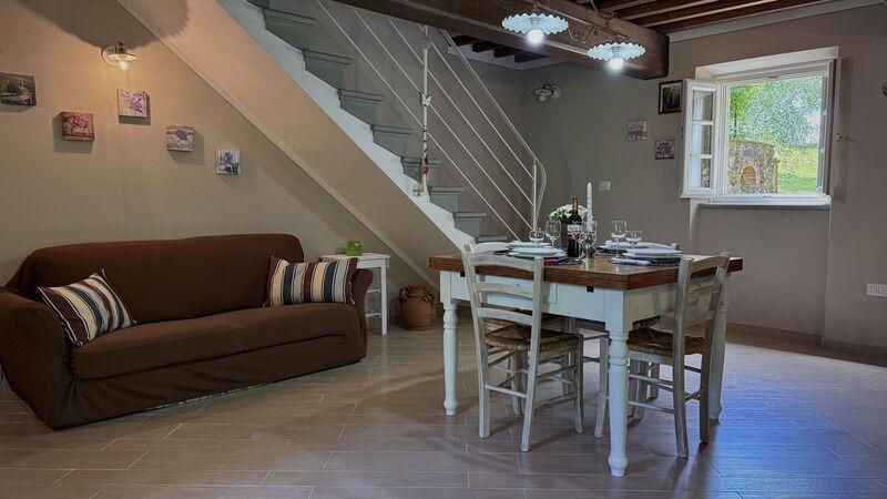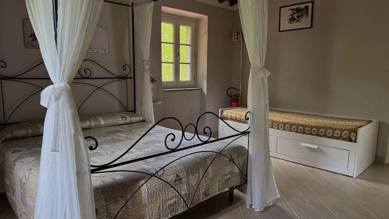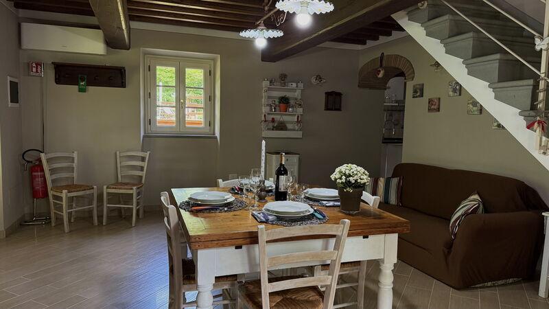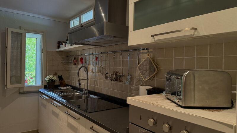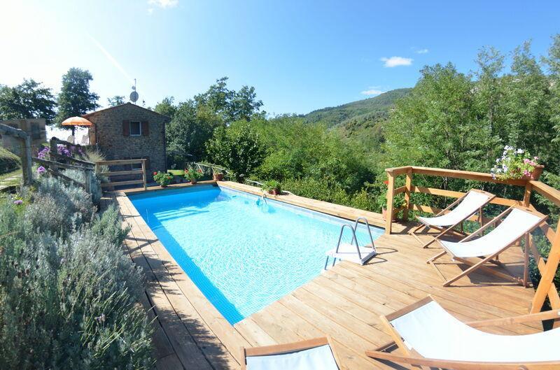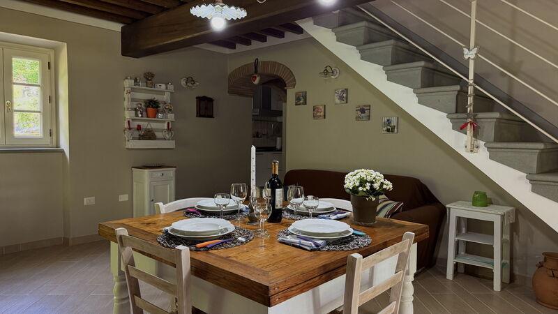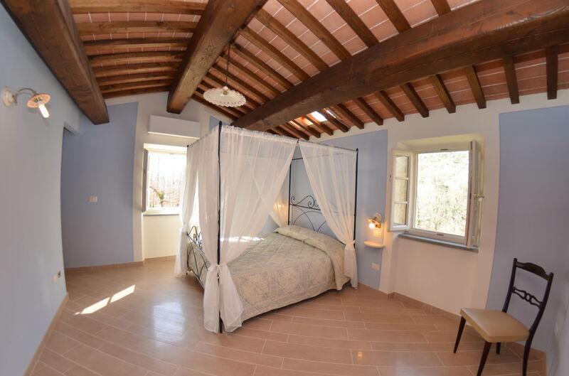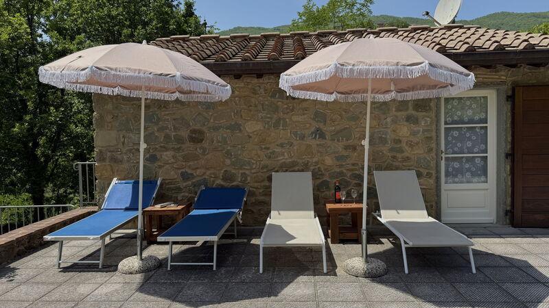 This lovely cottage is located within a natural park, on the hills, overlooking the city of Pescia, surrounded by chestnut trees und characterized because of its medieval hamlets, where time seems to have stopped. The owners restored the house with much love and converted it into a cozy holiday home.The grounds extend on about 2,5 hectares – olive groves and woods, the garden of about 1’000 sqm is set in terraces; equipped with a table, chairs, sun-umbrella and swimming pool (half set in earth, 7.30x3.80m, depth: 1.20m, equipped with deckchairs and external shower. Parking within the grounds.To access the house you have to take a narrow road, which goes downhill, partially asphalted with two narrow curves. You may park your car also on the main street and the owner will take you for this short piece of access.This spot of quietness and peace is the ideal choice for guests who look for a relaxed holiday Make adventurous meetings with dears, porcupines and oaks. You have the possibility to have strolls within total nature, visit the nearby hamlets, which seem attached on the rocks. The nearby village of Sorana is famous for its delicate beans which are a base for local dishes. You can see the village of Castelvecchio from your holiday home.Entrance on the ground floor: spacious living-cum-dining room with couch, dining table, fire-place, SAT-TV, kitchenette with electric stove, oven, fridge/freezer, dish-washer, 1 twin bedroom, 1 bathroom with hydro massage shower, WC, bidet, basin, stairs to the 1st floor:1 big double bedroom with 1 four-poster bed and 1 single bed plus 1 extractable bed, stunning views on the hamlet of Castelvecchio, 1 bathroom with shower, wc, bidet, basin, exit onto a terrace, from which you have access to the garden and to the swimming pool. The house is furnished with much care by the owners and painted in pastel colors; beamed ceilings. The house disposes of air-conditioning and WIFI. Washing machine.The holiday home is suitable for handicapped persons: there are sliding doors (90 cm wide).Pool opened from beginning of May until end of September, for the exact dates please contact us.