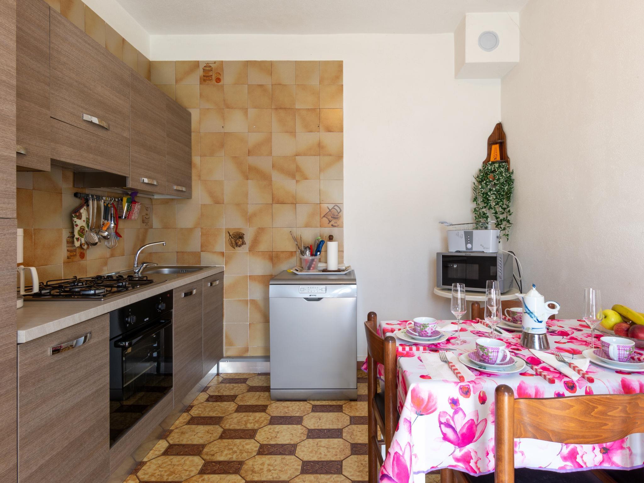 3-room apartment 92 m2 on 2 levels on 1st floor. Practical furnishings: living room, Low door height 180 cm with satellite TV. Exit to the balcony. 1 double bedroom. 1 room with 2 beds. Kitchen (oven, dishwasher, 4 gas rings, toaster, kettle, microwave, freezer, electric coffee machine) with dining table. Upper floor: shower/bidet/WC. Gas heating. Balcony, patio. Balcony furniture, barbecue, deck chairs (4), box-room. Facilities: washing machine, children's high chair, baby cot for up to 2 year olds. Internet (WiFi, free). Parking (2 cars). Please note: non-smokers only. Maximum 1 pet/ dog allowed. Private entrance. IT013216C263P5Z8I5
