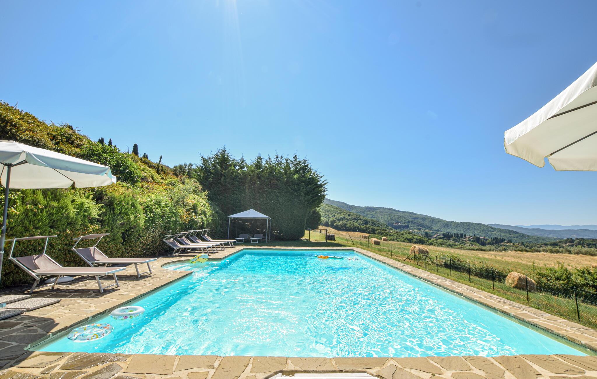 Schon beim ersten Sonnenstrahl lockt der von viel Grün umrahmte Pool zu einem erfrischenden Bad und einer vergnügten Partie Wasserball. Entspannen Sie sich anschließend mit einem kühlen Getränk auf einer der Sonnenliegen und genießen Sie die fantastische Aussicht auf Wiesen und ferne Hügel. Rund um das Haus finden Sie schöne Sitzgelegenheiten, sei es für einen Plausch zu zweit, einen Lesenachmittag oder ein gemeinsames Essen.