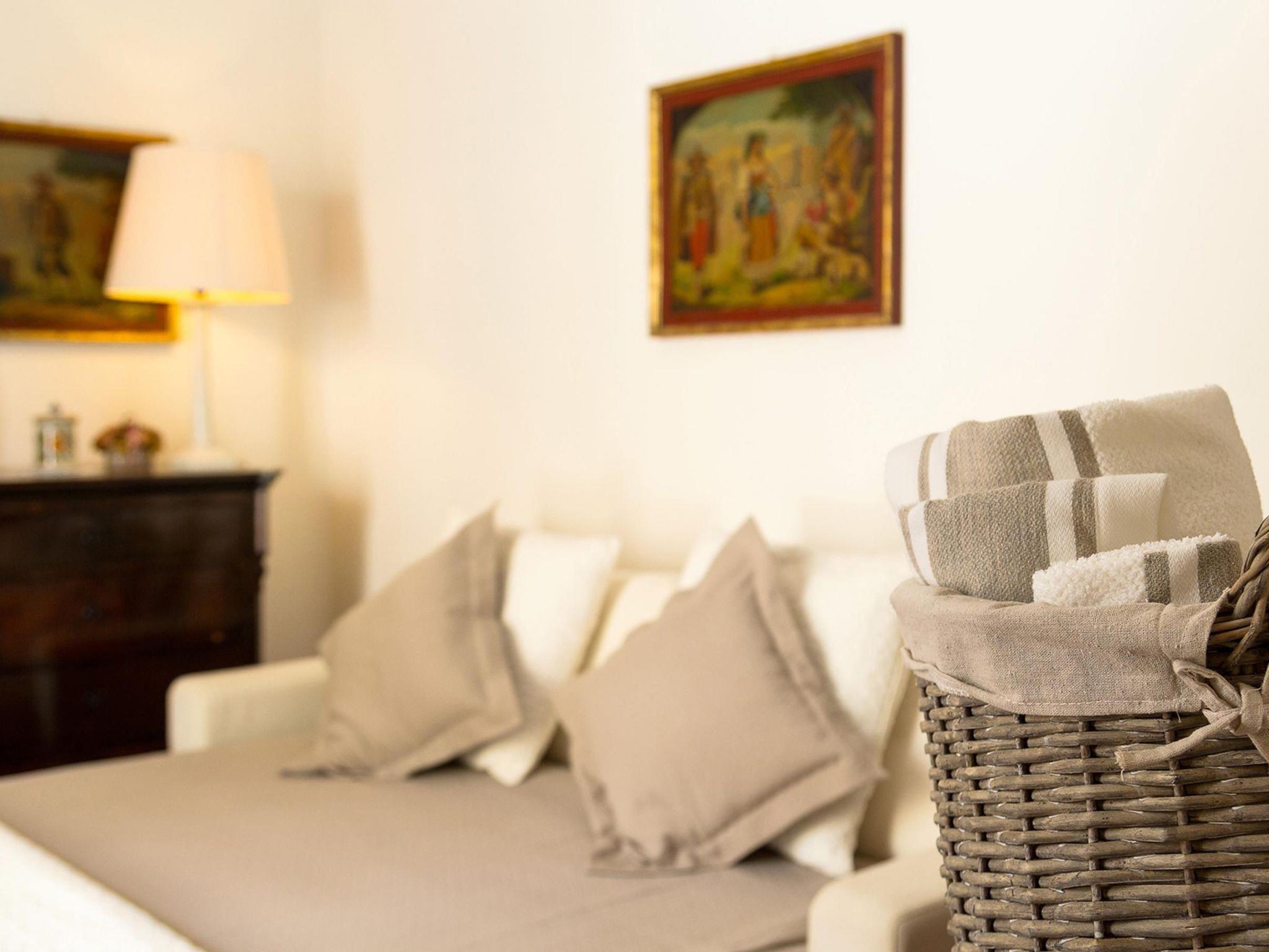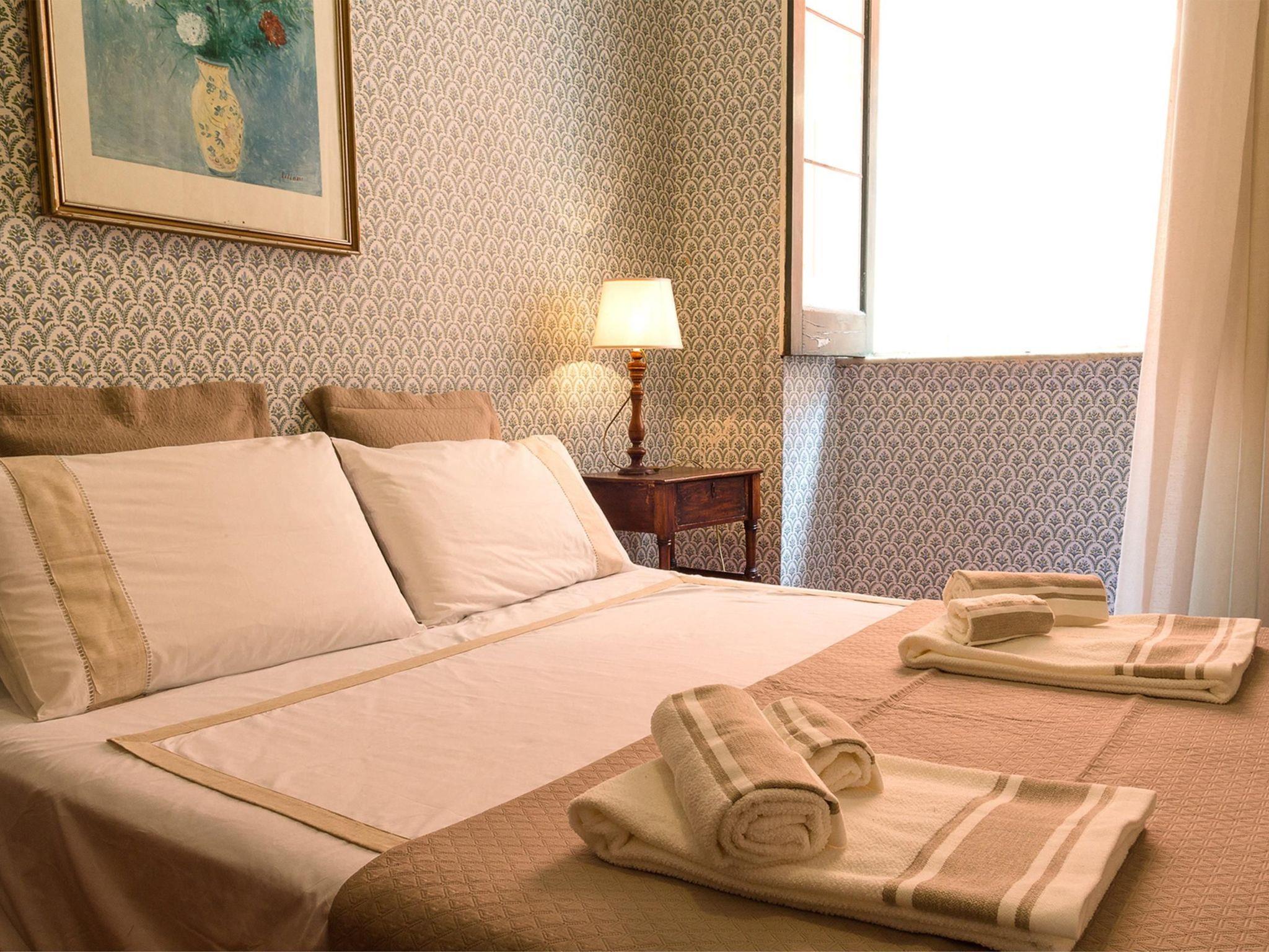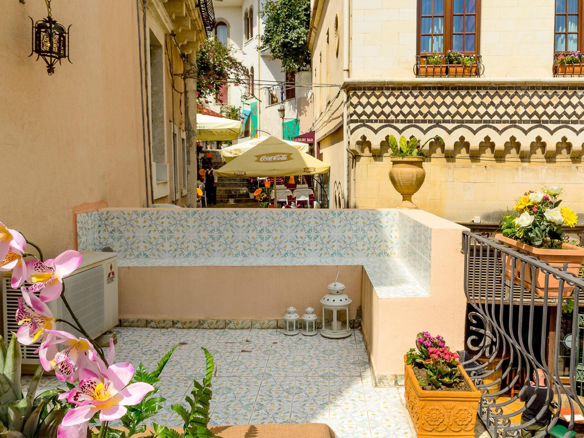 Charming flat in the heart of Taormina The flat is located in the pedestrian area, in the very centre of Taormina on Corso Umberto, exactly halfway between Porta Catania and Porta Messina. Leaving the house you can immerse yourself directly in the life of Taormina, in fact a few steps away is the famous Piazza IX Aprile (Piazza del Belvedere) the beating heart of Taormina's social life. Also nearby and along Corso Umberto are restaurants, pubs, bars, discos, shops, banks, pharmacies, travel agencies and self-service laundries. Also nearby are several tourist attractions: the Greek Theatre, where shows and concerts are performed in the summer months, Palazzo Corvaja, the Roman Odeon, Piazza del Belvedere (Piazza IX Aprile) and the splendid municipal villa. The cable car, about a 10-minute walk away, takes you to the coastal area of Taormina mare, which includes the Bay of Mazzarò, Isola Bella, the Bay of Giardini-Naxos and the Bay of Spisone. There are several public pay car parks for the car (the closest is at Porta Catania). The flat, ideal for two couples, consists of three rooms plus a hallway, one bathroom with shower and a fully equipped kitchen. It has four beds plus two additional ones. Each room is air-conditioned and furnished with fine wooden furniture. It has a flowery terrace overlooking the Corso Umberto and allows you to enjoy the view of the promenade along the Corso Umberto and in the evening to dine with the pleasant background music that characterises the area. Access to the house is via a characteristic staircase, immortalised by many tourists for its uniqueness, and has a large entrance terrace.