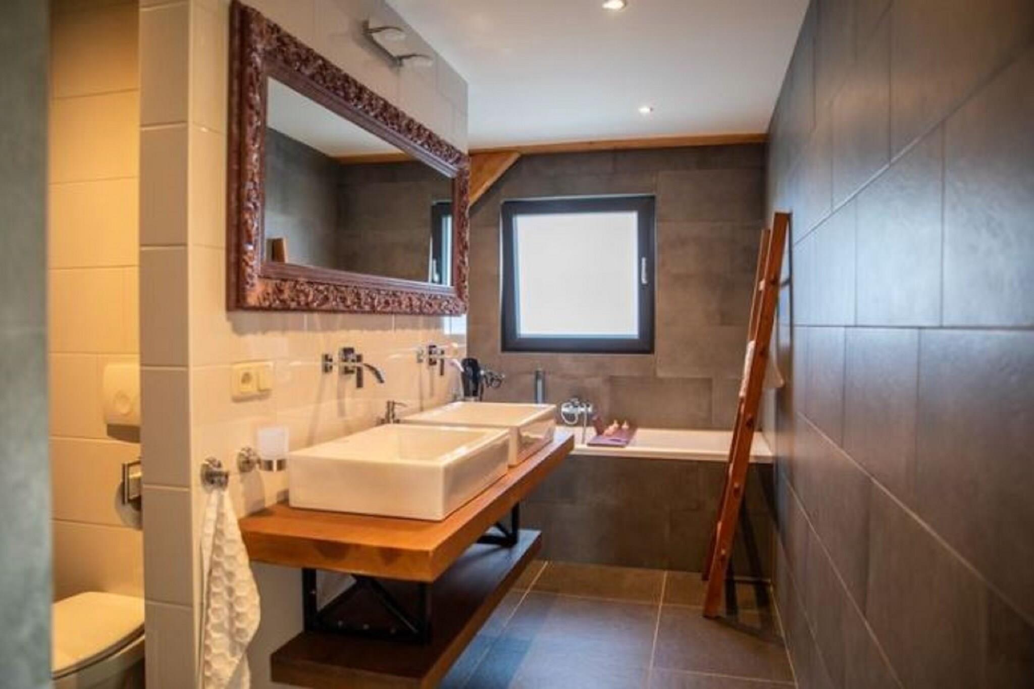 On the 1st floor: (hallway, open kitchen(electric kettle, cooker, coffee machine, combination microwave, dishwasher), Living/diningroom(dining table, seating area), bedroom(double bed(boxspring, twin duvet, 180 x 200 cm)), bathroom(bath tub, shower, washbasin, washbasin, toilet)) On the 2nd floor: (bedroom(single bed(duvet, boxspring), single bed(duvet, boxspring)), bathroom(washbasin, toilet)) stables, TV, streamingservice, microwave, bathtub or shower, washing machine(shared with other guests), terrace, garden furniture, sun loungers, parking, deckchairs, parasol, ironing board, party games