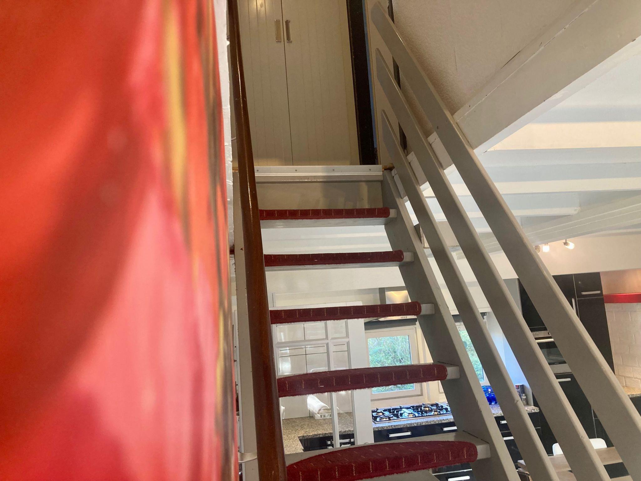 The master bedroom, from which you can reach the garden as well, is equipped with a two-person infrared sauna. The second sleeping room downstairs has a bunk bed. On the first floor (the stairs to the first level are rather steep), are two more spacious bedrooms with twin box spring beds.