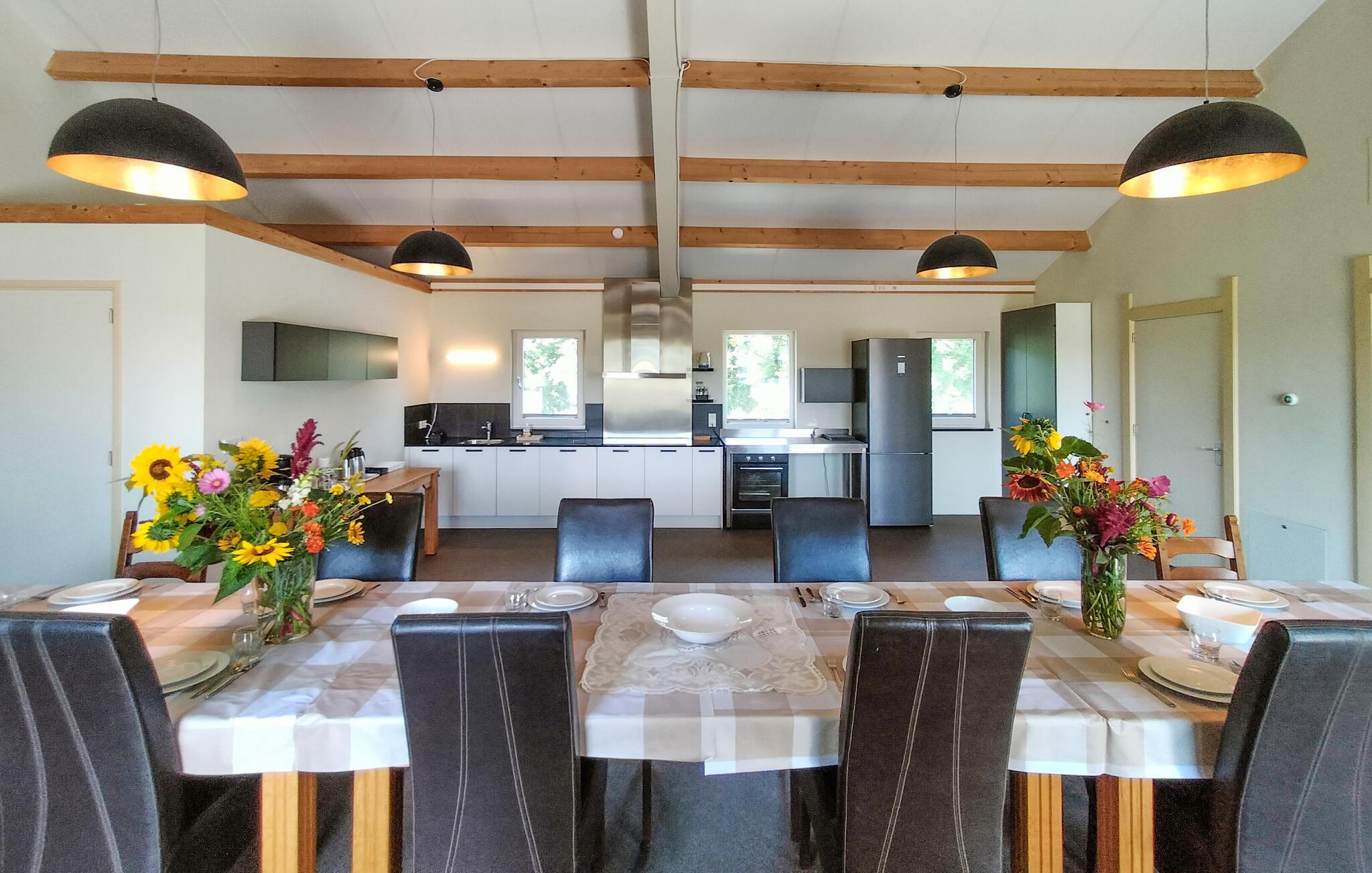 Direkt neben dem schönen Gemüse- und Kräutergarten des Eigentümers gelegen, können Sie in Ihrem Ferienhaus die herrliche Aussicht auf die umliegenden Wiesen genießen. Betreten Sie den weitläufigen Innenbereich mit rustikalen Holzbalken an der Decke und nehmen Sie Platz an der langen Tafel im Essbereich, die ideal für gesellige Mahlzeiten ist. Nutzen Sie die moderne Küche, um gemeinsam zu kochen. Entspannen Sie sich im gemütlichen Wohnzimmer mit bequemen Sofas und Fernseher oder ziehen Sie sich in einen der Sitzbereiche zurück, um ein Buch zu lesen. Genießen Sie die helle, freundliche Atmosphäre, die durch große Fenster und eine offene Raumgestaltung entsteht.