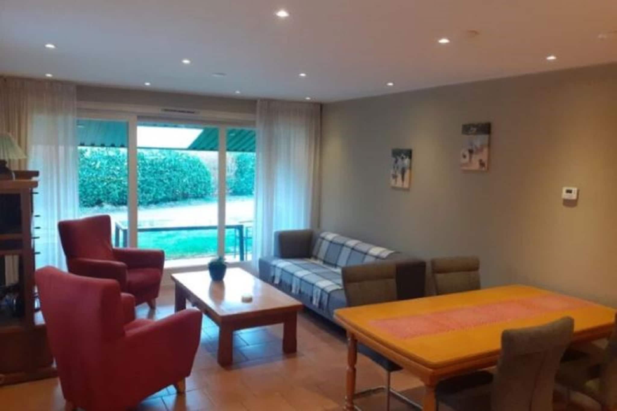 Ground floor: (hallway(toilet), Living room(TV(digital)), open kitchen, bedroom(2x single bed), bedroom(bunk bed), bathroom(bathtub with shower, washbasin)) heating(central, floor heating), air conditioning, terrace, garden, garden furniture, BBQ, high chair, baby crib(free)