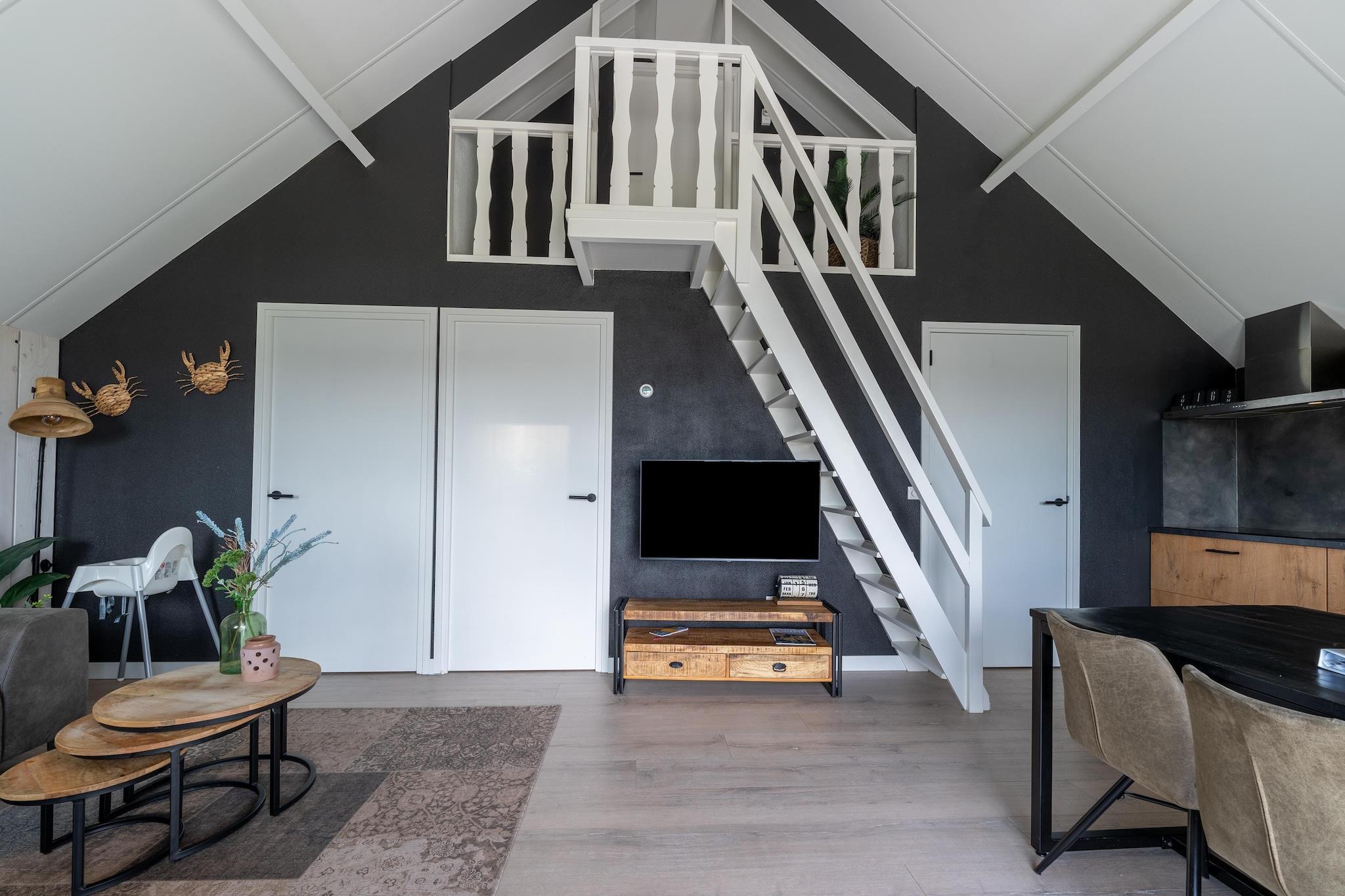 Ground floor: (Living room(TV(smart TV), dining table, seating area), open kitchen(electric kettle, cooker, hood, coffee machine, combination microwave, dishwasher, fridge-freezer), bedroom(double bed(boxspring)), bedroom(bunk bed), bathroom(shower(walk-in shower), washbasin, toilet)) On the 1st floor: (bedroom(single bed(boxspring), single bed(boxspring))) terrace(roofed), garden furniture, parking lot(public), lounge set