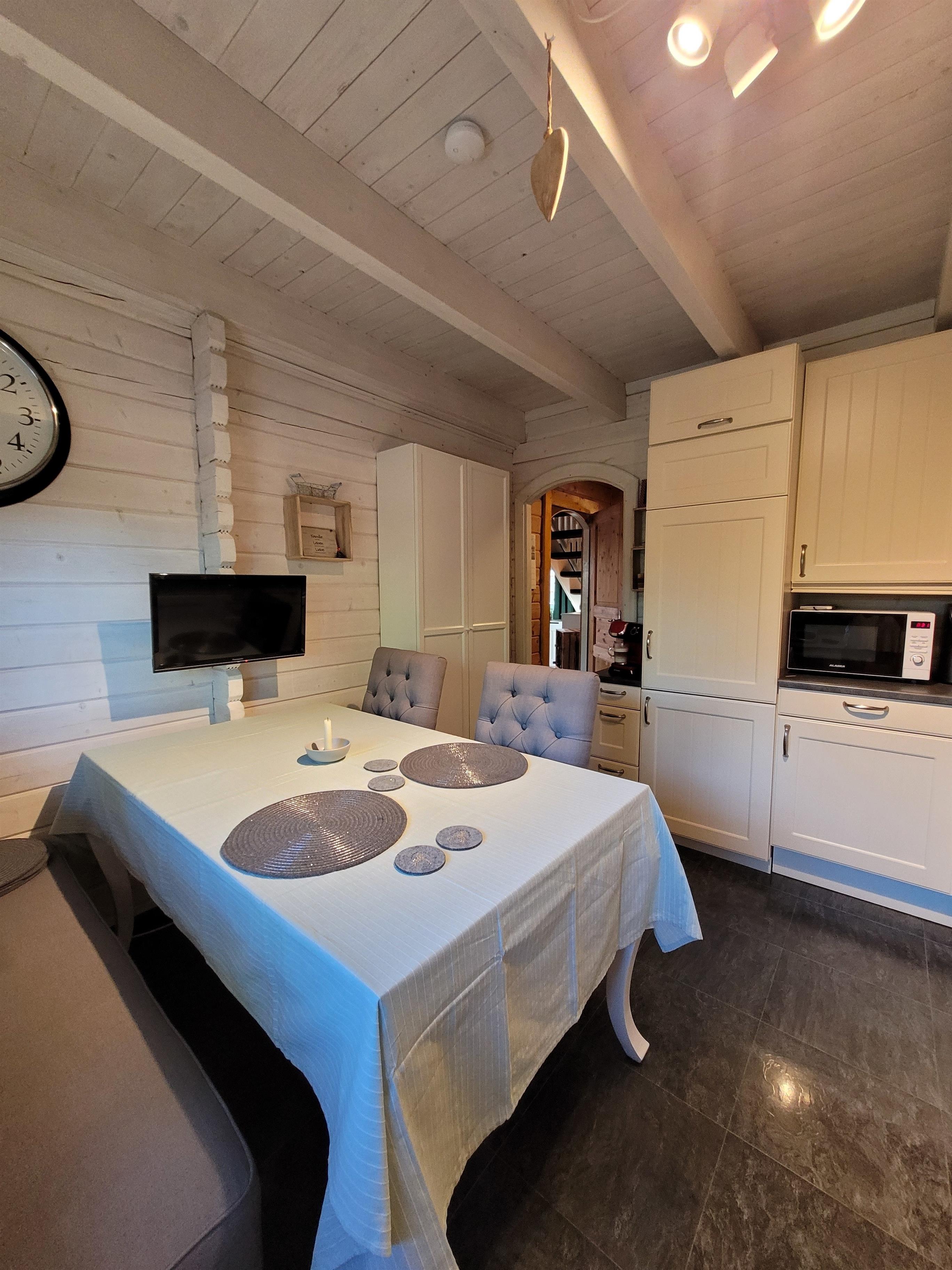 In der Küche gibt es sowohl eine normale Filterkaffee-Maschine als auch eine Tassimo, eine Spülmaschine, eine Mikrowelle, einen Airfryer, einen Wassersprudler und vieles mehr.