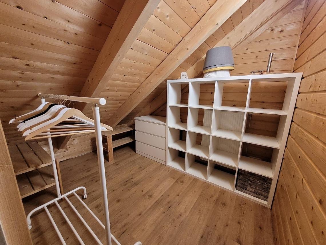 1x kleines Doppelbett in 140x200m, 1 Kommode und Stauraum in den Bettschubladen.