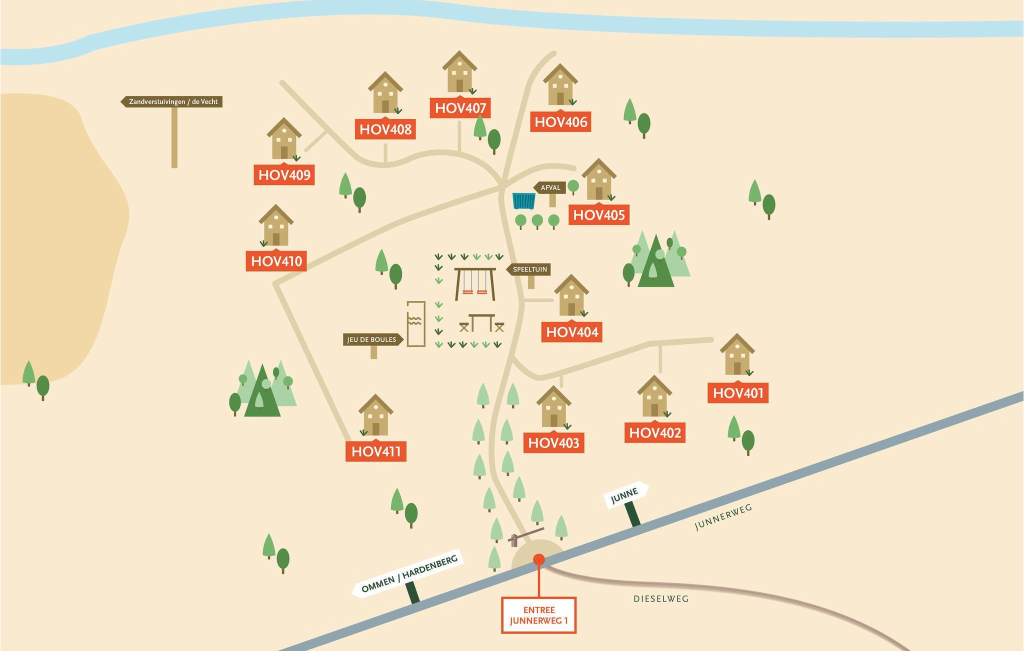 Hier genießen Sie einen komfortablen Aufenthalt im Ferienhausdorf Bospark Landgoed Junne in Ommen. Mit einer einzigartigen Auswahl an komfortabel eingerichteten Ferienhäusern, einem großen Spielplatz, einer wunderschön angelegten Petanquebahn und der ruhigen Lage in einem Waldgebiet ist dieses Ferienhausdorf das ideale Reiseziel für die ganze Familie. Dieses wunderschöne Landgut von mehr als tausend Hektar ist aufgrund der Vielfalt der Landschaft ein einzigartiger Teil der Niederlande. Sie können mit Ihrem Hund direkt vom Park aus durch wunderschöne Waldgebiete, ausgedehnte Sandverwehungen, farbenfrohe Heidefelder und natürlich die malerische Flusslandschaft entlang der Vecht spazieren.
