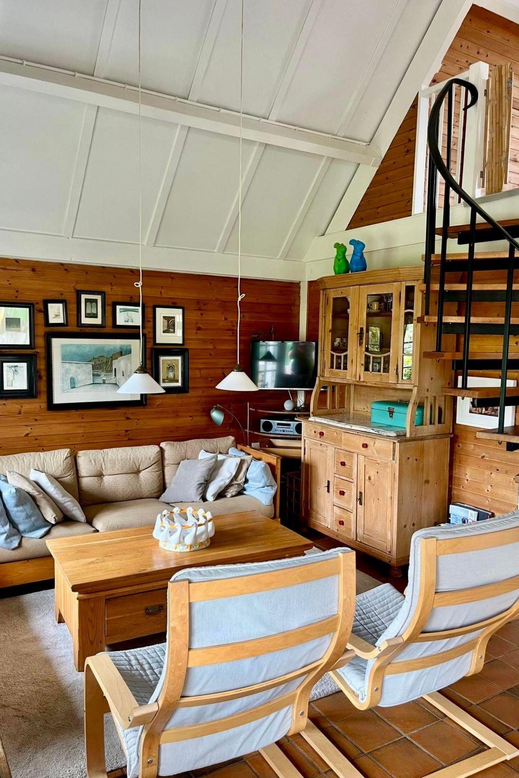 On the ground floor (approx. 50 m²) there is a fully equipped kitchen with dishwasher, gas hob, oven, microwave, toaster, coffee machine, fridge, freezer, kettle and washing machine. The dining area has a table with 4 chairs. The cosy living area with open fireplace, sofas, armchairs, flat screen TV (satellite) and music system invites you to linger.