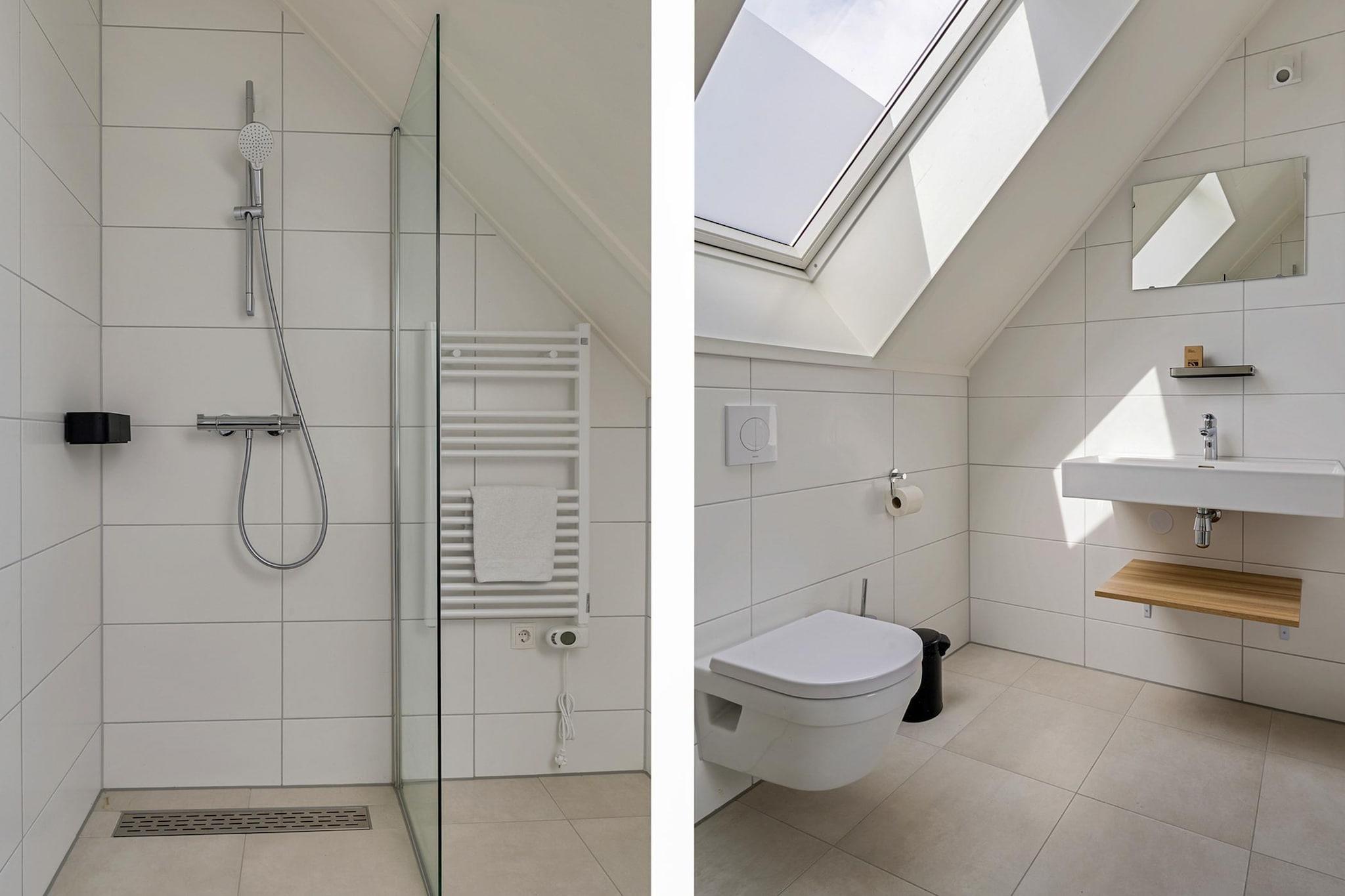 Ground floor: (Kitchen(hob(induction), electric kettle, toaster, coffee machine, combination microwave, dishwasher, fridge-freezer, Hand blender, dishes and cutlery, Cooking basics), Living/diningroom(TV(smart TV), dining table, seating area), Bedroom with bathroom(single bed, single bed, shower(walk-in shower), washbasin, toilet), Bedroom with bathroom(single bed, single bed, shower(walk-in shower), washbasin), toilet(toilet)) On the 1st floor: (bedroom(double bed), bedroom(single bed, single bed), bedroom(single bed, single bed), Bedroom with bathroom(single bed, single bed, shower, washbasin, toilet), Bedroom with bathroom(single bed, single bed, shower, washbasin, toilet), bathroom(bathtub with shower, washbasin, washbasin, toilet), toilet(toilet)) Internet access, heating(floor heating), terrace, garden, garden furniture, BBQ, parasol, high chair, ironing board, iron