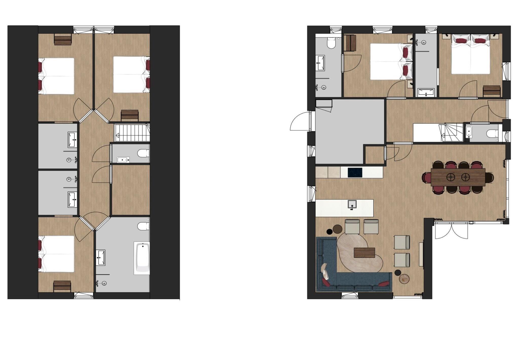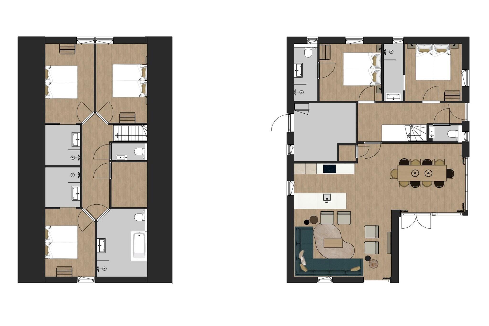 Ground floor: (Kitchen(hob(induction), electric kettle, toaster, espresso machine, combination microwave, dishwasher, fridge-freezer, Hand blender, dishes and cutlery, Cooking basics), Living/diningroom(TV(smart TV), dining table, seating area), Bedroom with bathroom(single bed, single bed, bathtub or shower, washbasin), Bedroom with bathroom(single bed, single bed, bathtub or shower, washbasin, toilet), toilet(toilet)) On the 1st floor: (bedroom(single bed, single bed), Bedroom with bathroom(single bed, single bed, shower, washbasin), Bedroom with bathroom(single bed, single bed, bathtub or shower, washbasin), bathroom(shower, washbasin, toilet), toilet(toilet)) heating(floor heating), terrace, garden, garden furniture, BBQ, parking, parasol, high chair