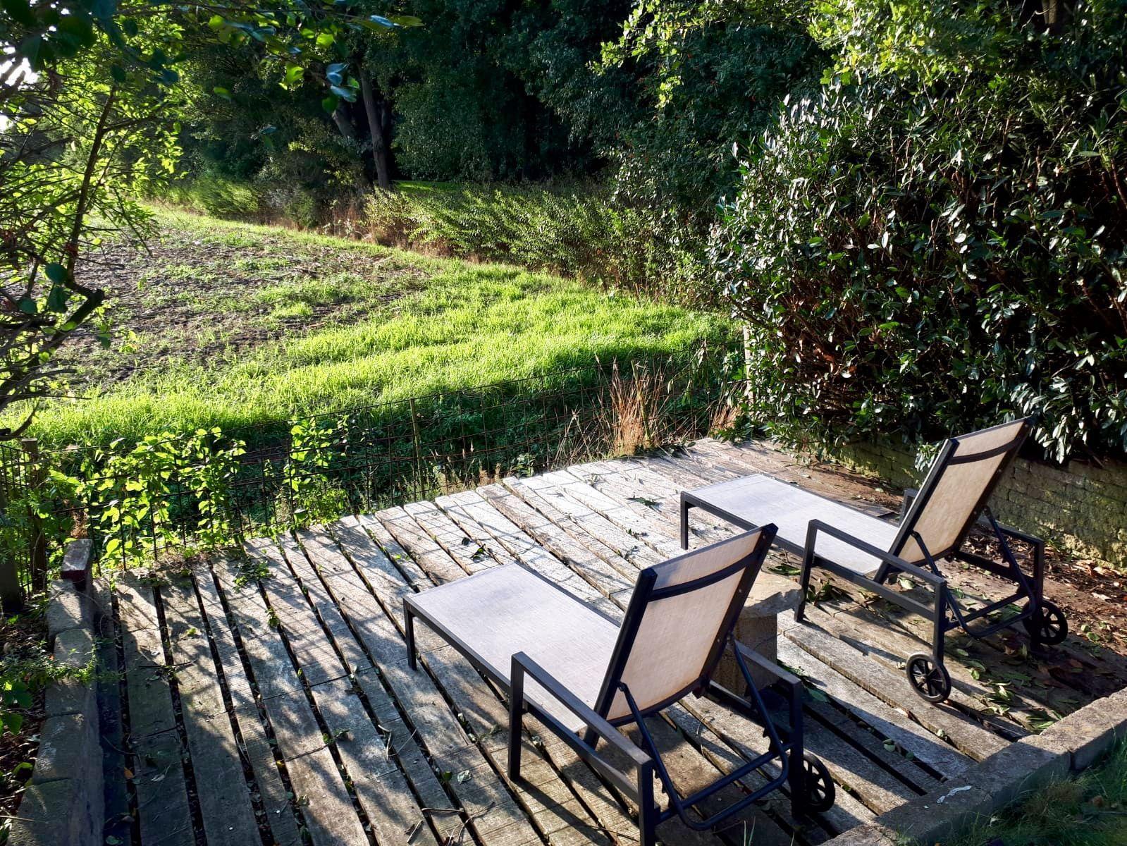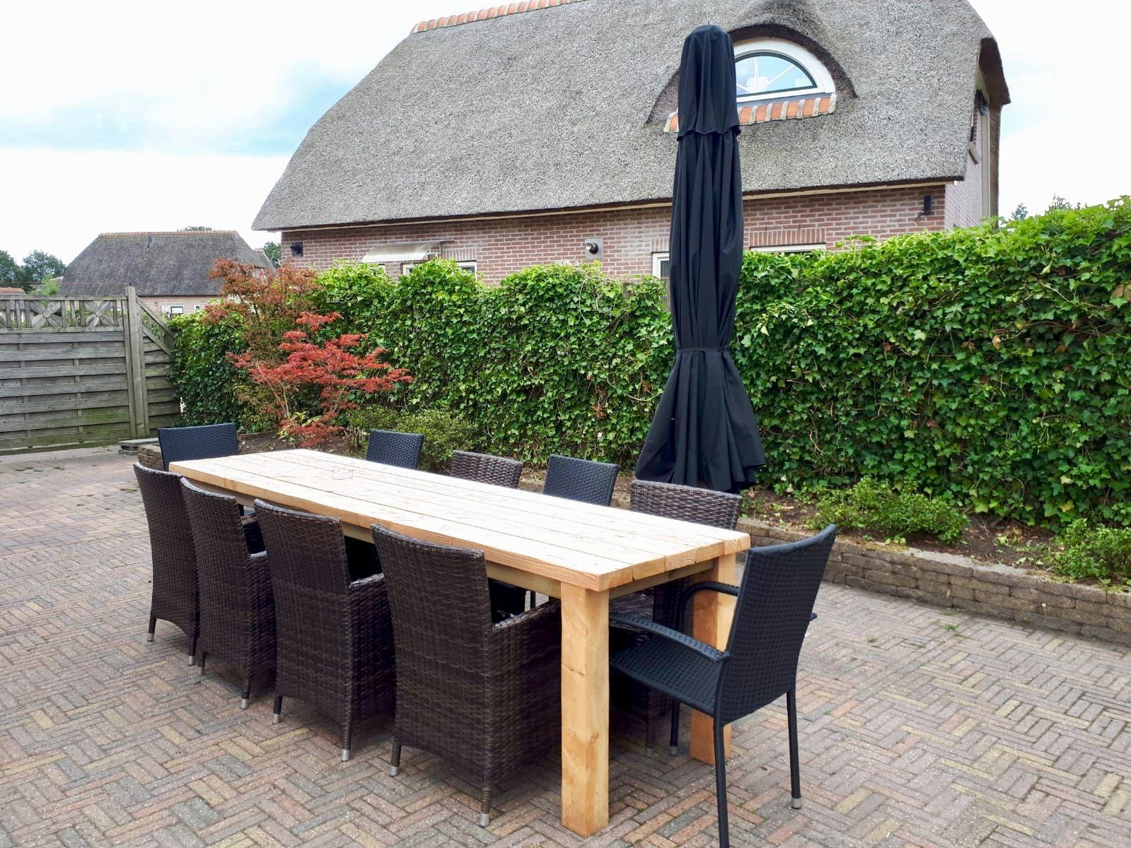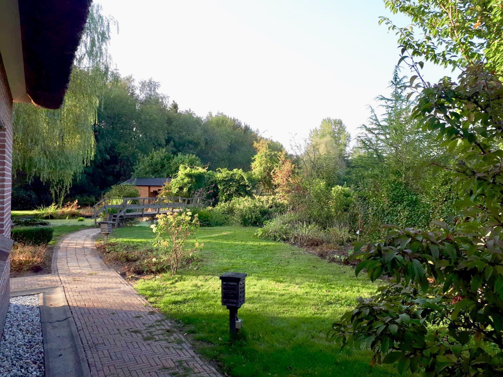 - 2 Terraces and a seating area with garden furniture - Free parking, in front there is space for 4 cars - Plot is detached / fenced. The terrace has a terrace table with 10 chairs, 1 parasol and two sun loungers. The 1100 m2 garden is fenced and therefore suitable for dogs. Garden with a large pond a trampoline, playground equipment with swing, slide and ladder rope.
