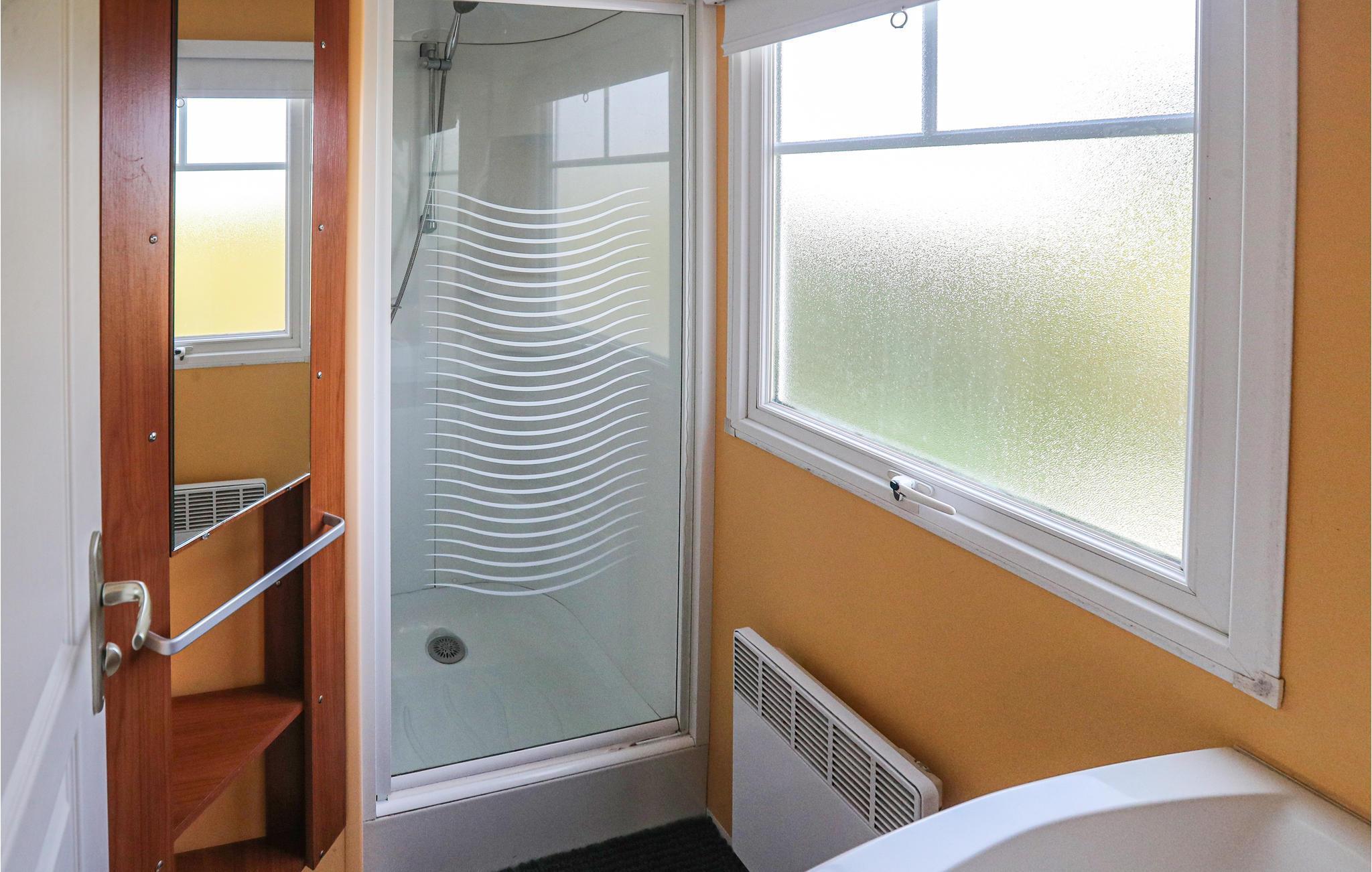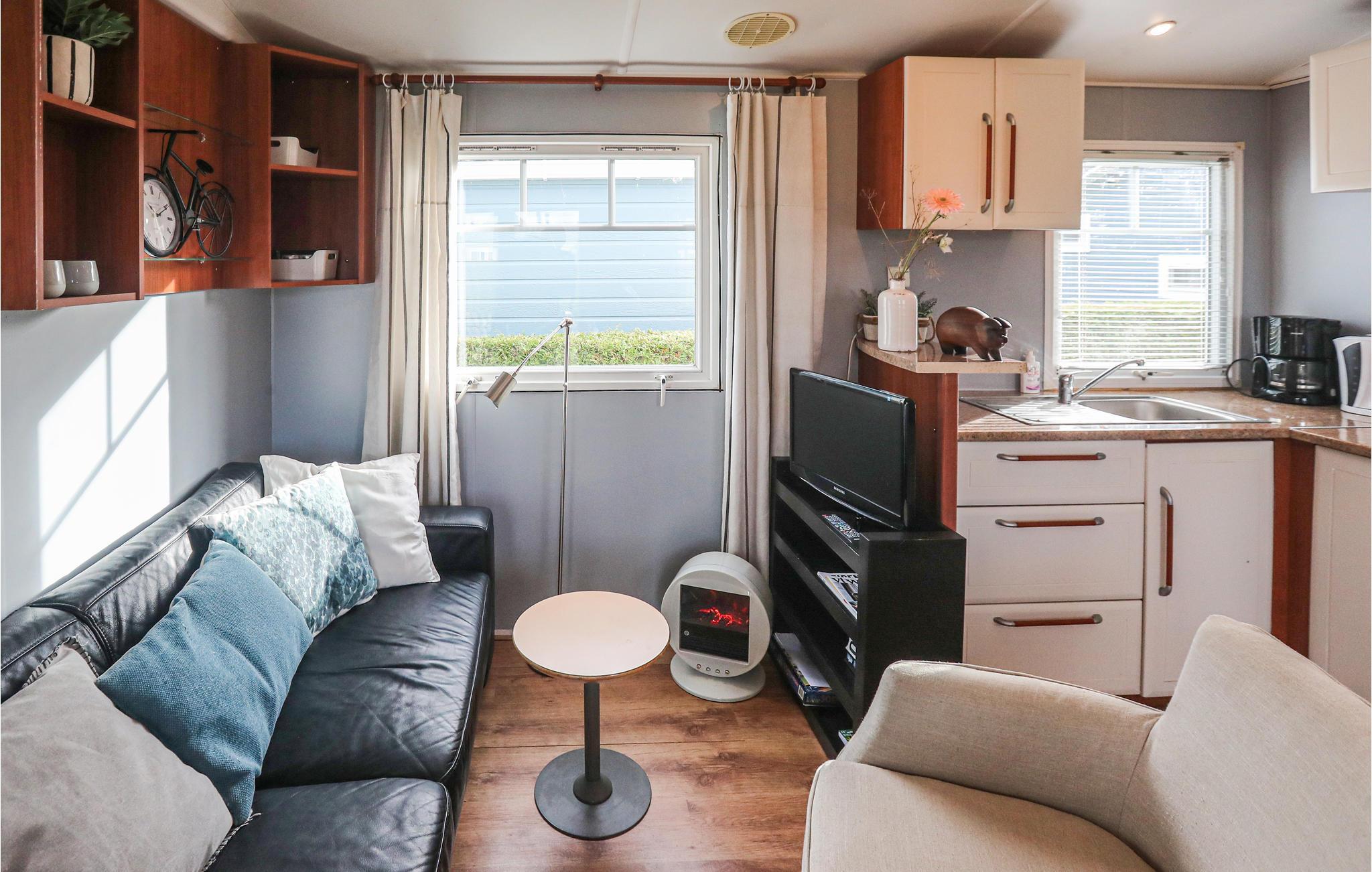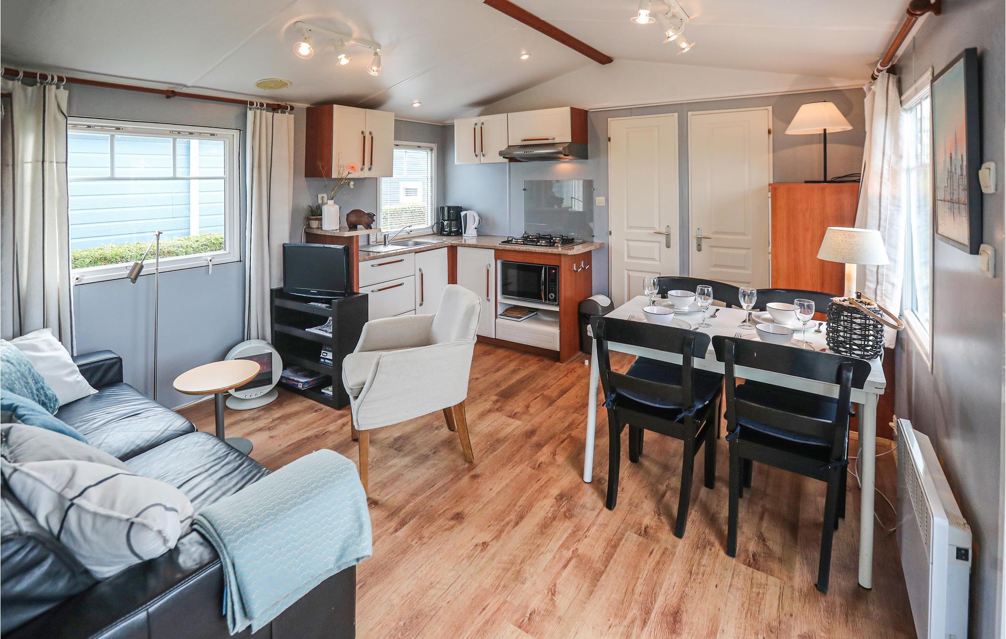 Das Haus verfügt über zwei Schlafzimmer, eines mit einem Doppelbett und eines mit zwei Einzelbetten. Das gemütliche Wohnzimmer hat einen schönen Esstisch, eine Sitzecke und eine offene Küche. Das Badezimmer kann vom Wohnzimmer und vom Schlafzimmer aus betreten werden und verfügt über eine Dusche und ein Waschbecken. Eine separate Toilette befindet sich auf der anderen Seite des Wohnzimmers.