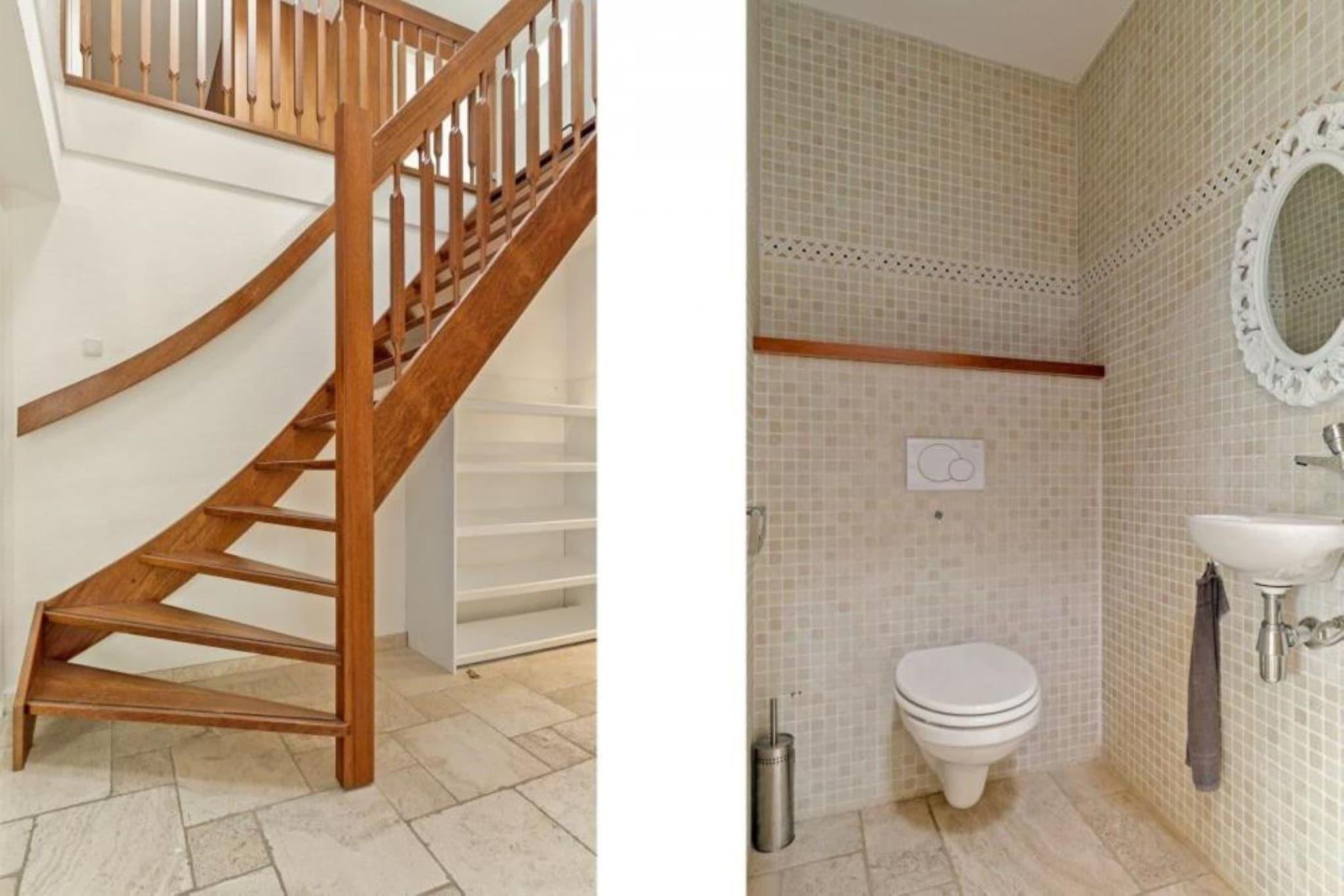 Ground floor: (Entrance, hallway, Kitchen(bar(eating bar), hob(induction), electric kettle, hood, coffee machine, oven, microwave, dishwasher, fridge, freezer), Living/diningroom(TV(cable, flatscreen), dining table, seating area, DVD player, Blu-ray player, heating(floor heating), gas fireplace), toilet(washbasin, toilet), pantry(fridge, freezer, tumble dryer, washing machine, ironing board, iron)) On the 1st floor: (bedroom(double bed(boxspring, 180 x 200 cm), air conditioning), bedroom(double bed(boxspring, 180 x 200 cm)), bedroom(double bed(boxspring, 180 x 200 cm)), bedroom(double bed(boxspring, 180 x 200 cm)), bedroom(double bed(boxspring, 180 x 200 cm)), bathroom(bathtub with shower, washbasin, toilet), bathroom(shower, washbasin), Landing) camping cot, terrace(private), garden(private, partially fenced), garden furniture, parking, pond, swimming pool(shared with other guests, outside, fenced), tennis court(shared with other guests), boules court(shared with other guests), high chair, solar energy, air to water heatpump, Sunscreen