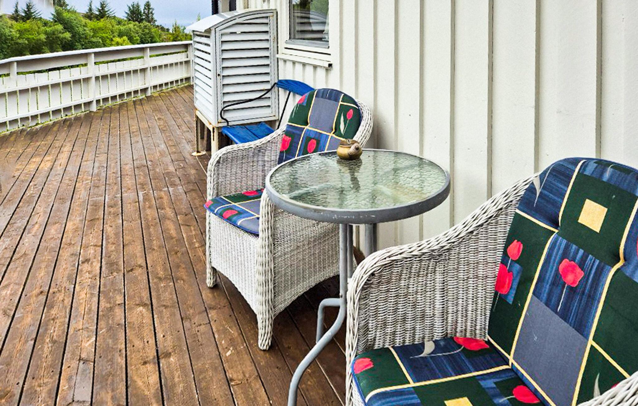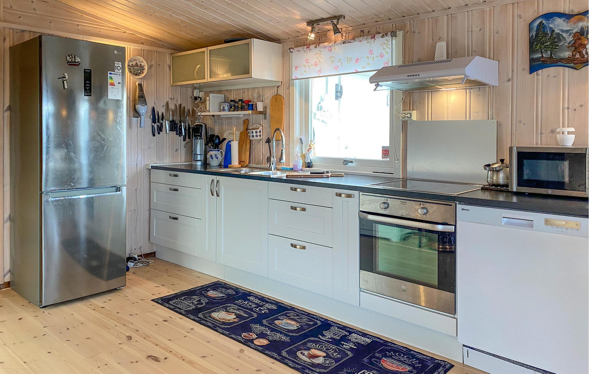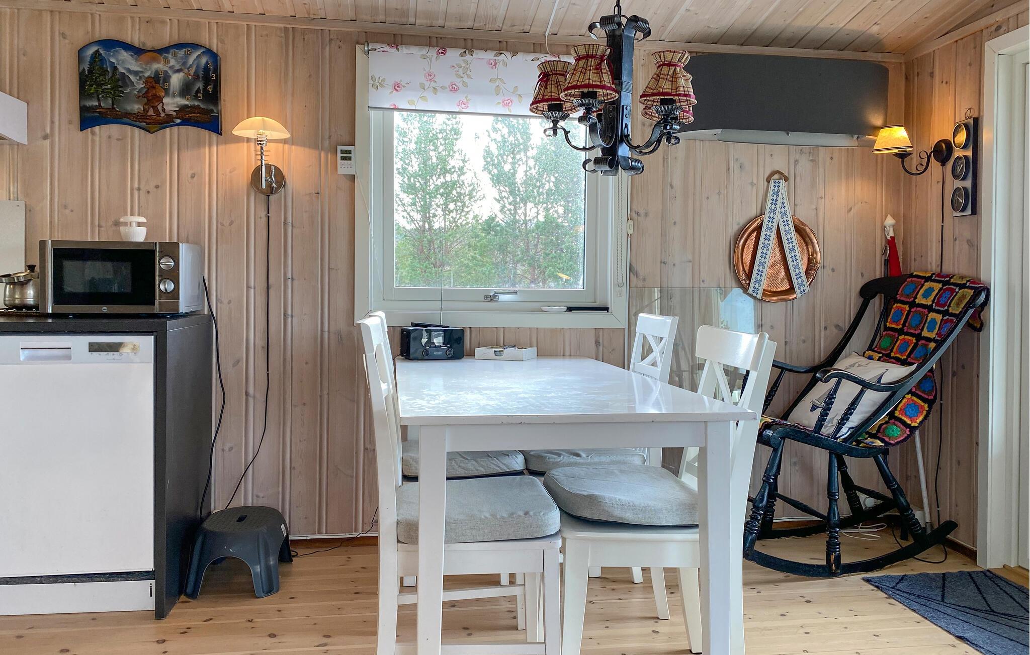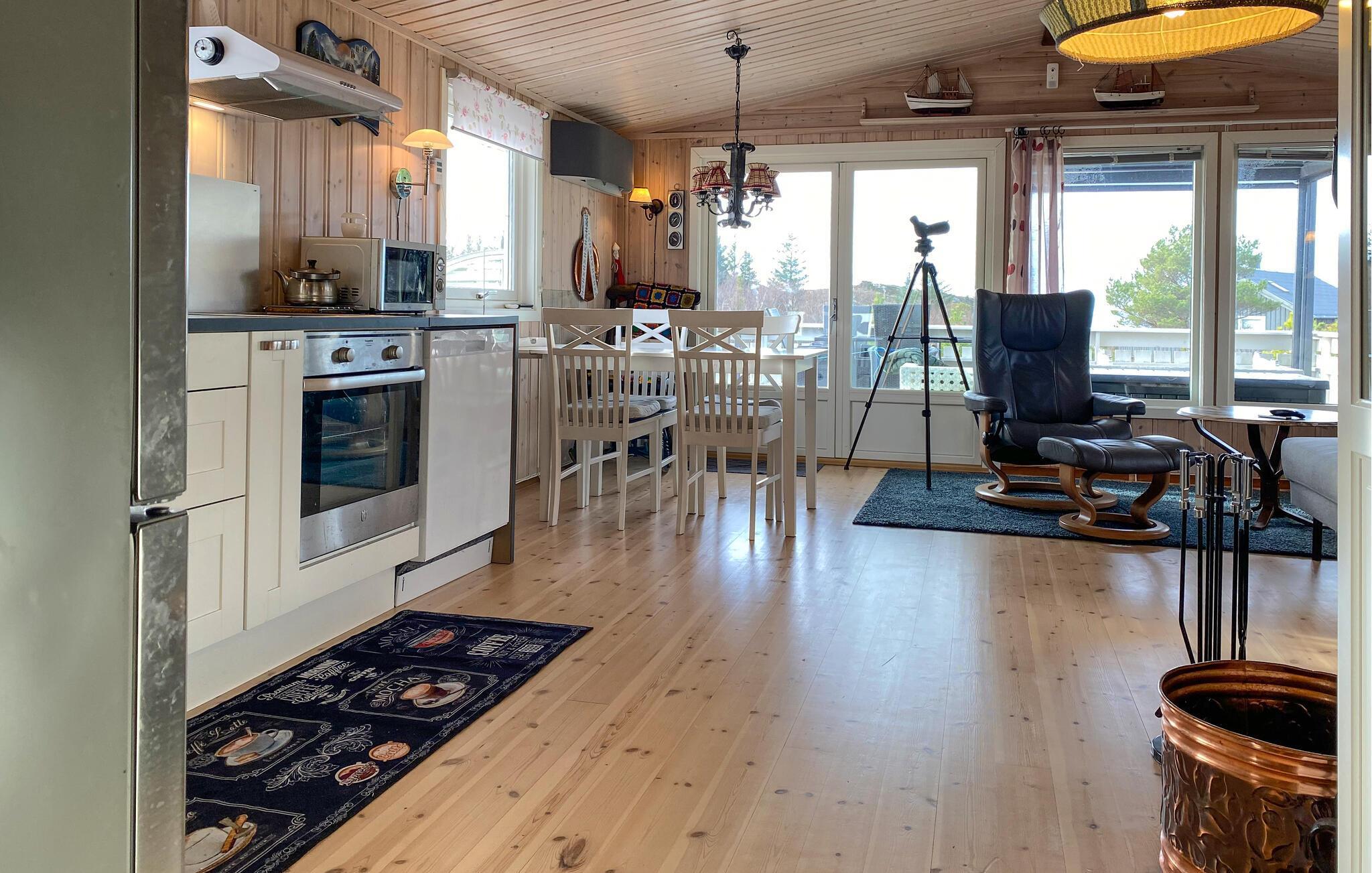 Verbringen Sie eine erholsame Zeit in Ihrem charmanten Ferienhaus, das eingebettet in eine friedliche Landschaft mit weitläufigen Wäldern und atemberaubenden Ausblicken liegt. Entdecken Sie die Natur, gehen Sie auf Wanderungen oder entspannen Sie sich einfach auf der großzügigen Terrasse. Der Innenbereich des Hauses ist ansehnlich und gleichzeitig gemütlich gestaltet. Der offene Wohnbereich mit großen Fenstern lässt viel Licht herein und bietet einen tollen Blick in die Umgebung. Am Horizont können Sie sogar das Meer erblicken. Machen Sie es sich auf dem bequemen Sofa vor dem Kaminofen gemütlich oder genießen Sie Ihre Mahlzeiten am Esstisch mit Blick ins Freie.