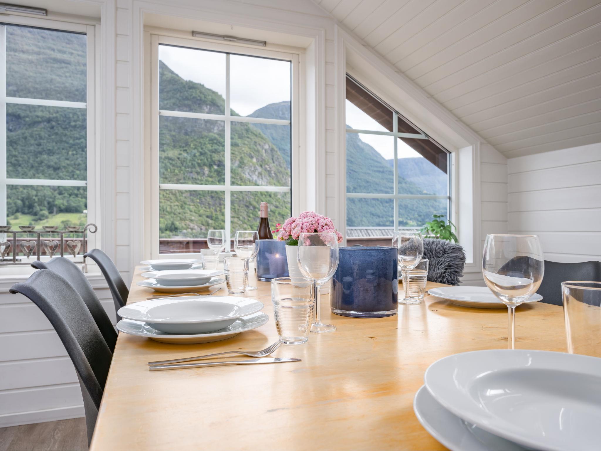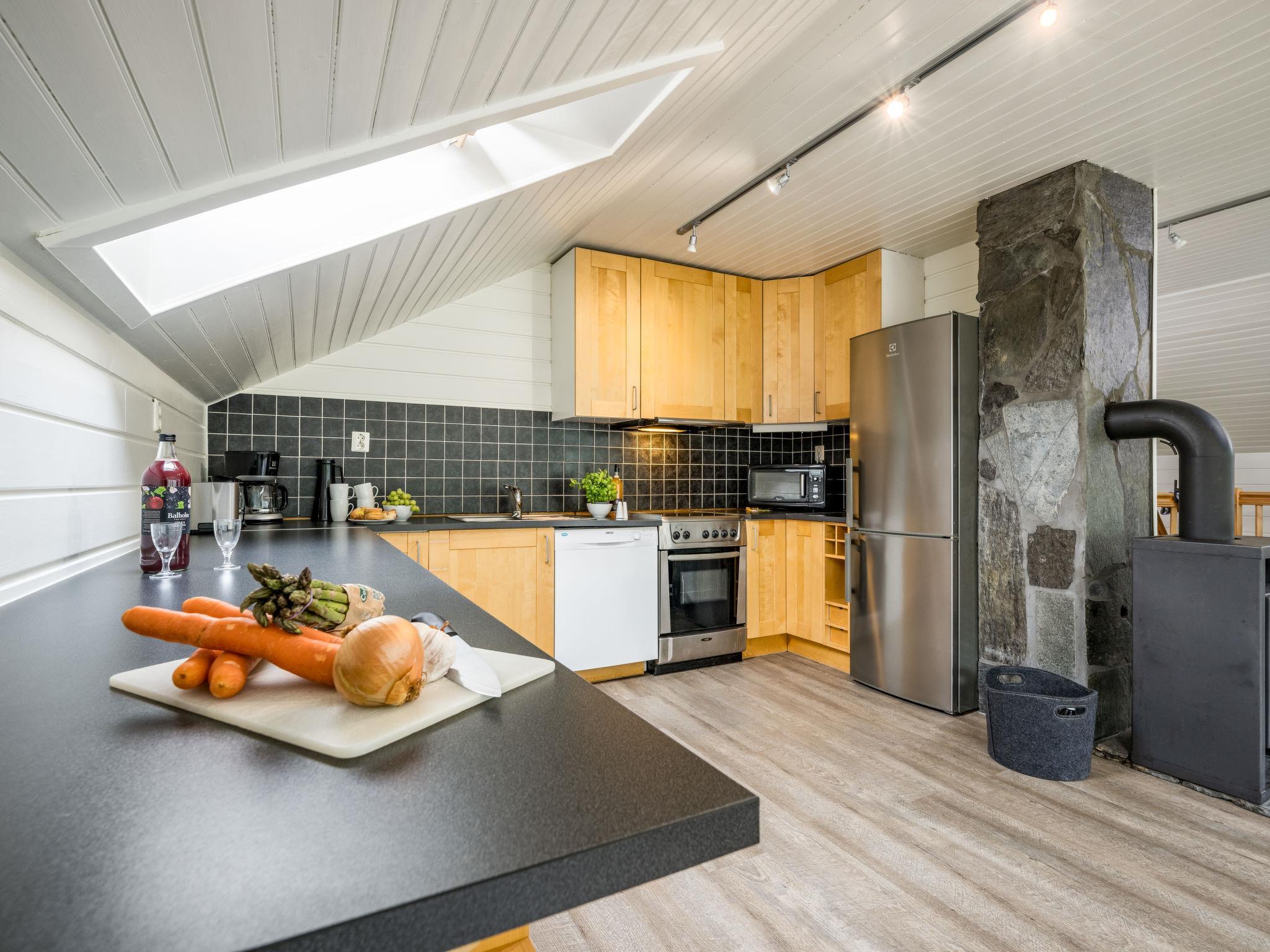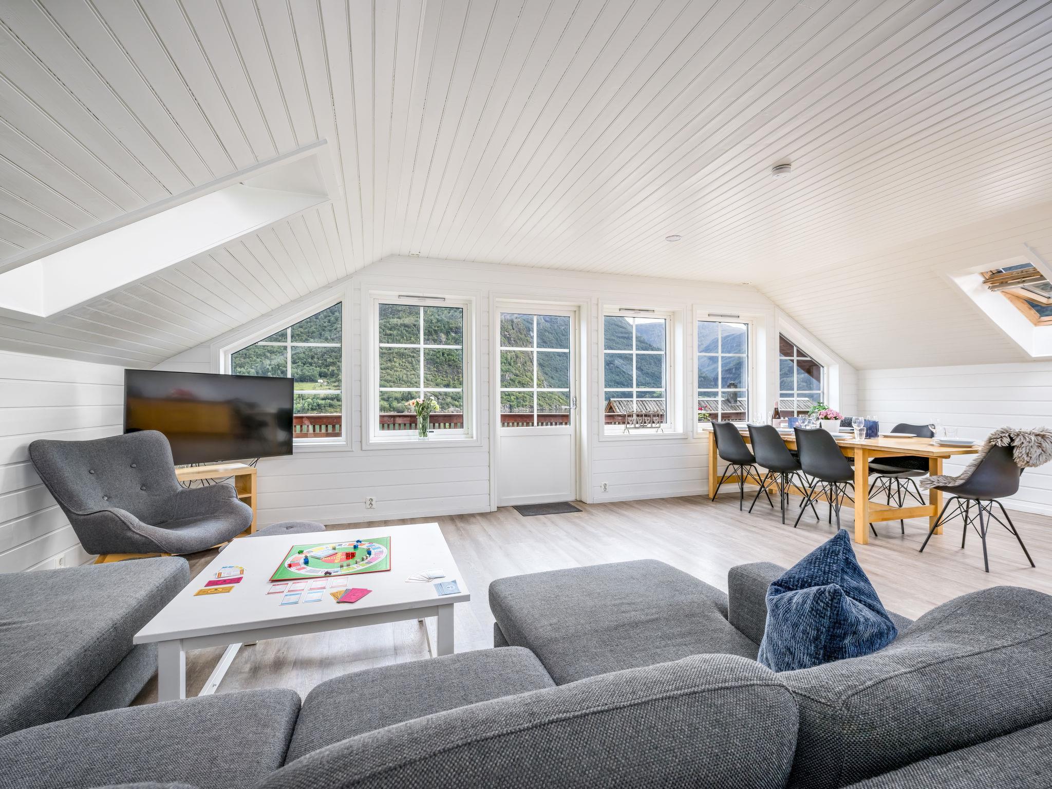 "Frigg", 5-room house 160 m2 on 2 levels. Spacious and bright, cosy furnishings: 1 room with 1 double bed. 1 room with 2 beds (75 cm). 1 room with 2 beds (75 cm). Shower/WC, Sauna. Upper floor: living/dining room with dining table, TV and DVD. Exit to the terrace. 1 room with 1 double bed. Open kitchen (oven, dishwasher, 4 ceramic glass hob hotplates, microwave, freezer, electric coffee machine). Shower/WC. Electric heating, underfloor heating. Beautiful view of the sea, the mountains and fjord. Facilities: washing machine, dryer, sauna. Internet (WiFi, extra). Please note: maximum 1 pet/ dog allowed. Smoke alarm, fire extinguisher. Freezer approx. 300 l. TV via WIFI. 924531169