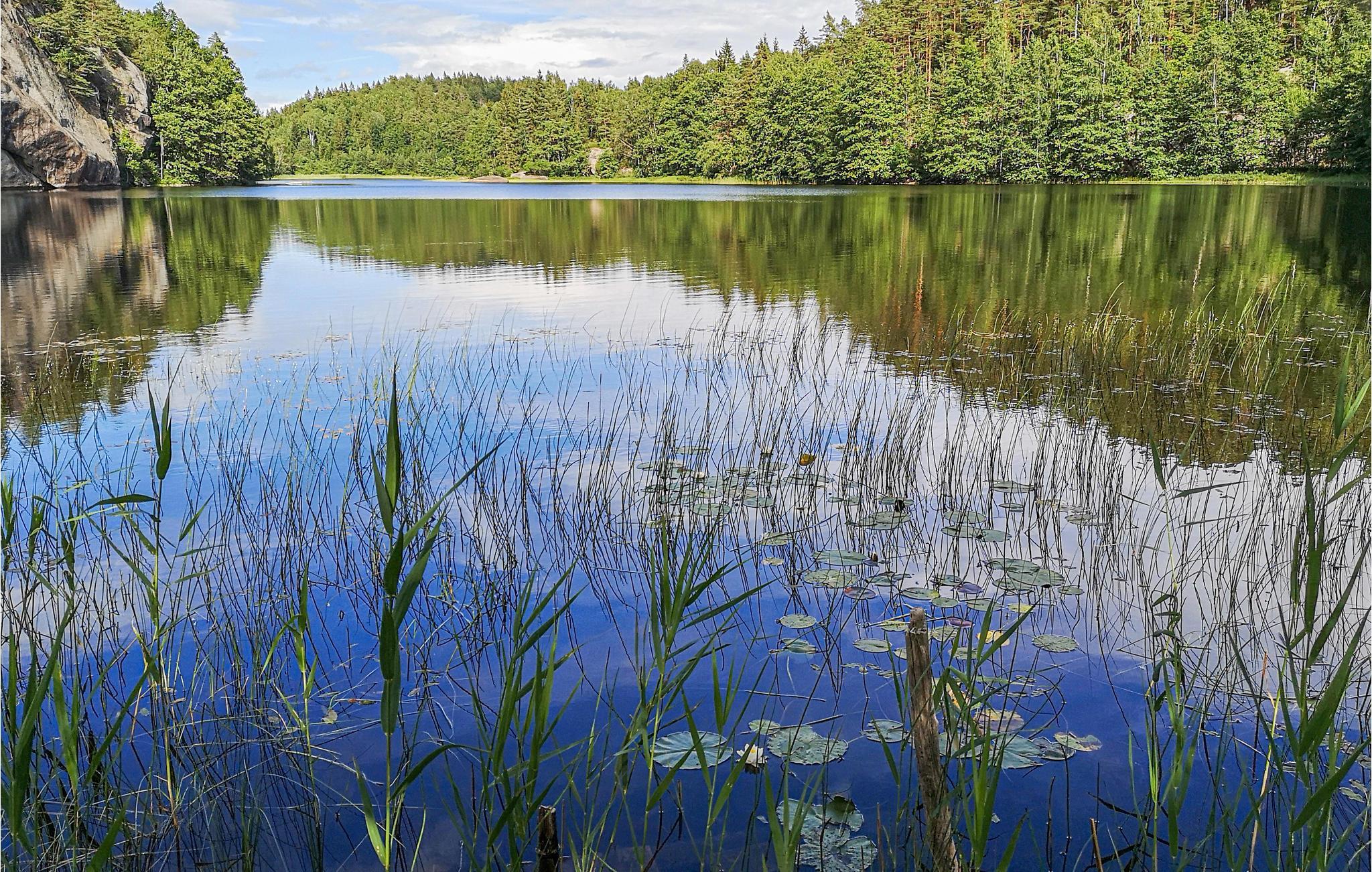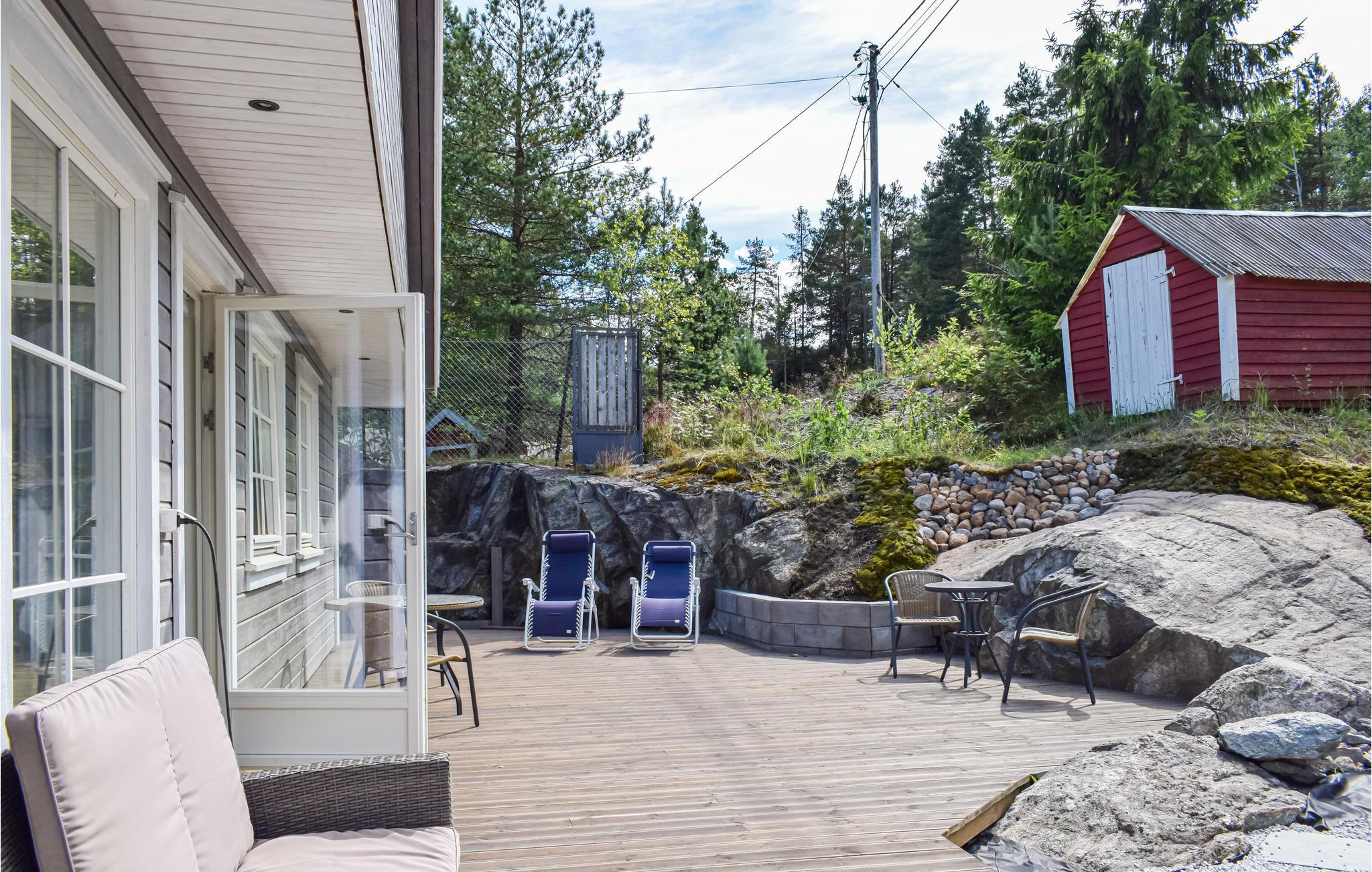Das Ferienhaus ist von einer schönen Terrasse umgeben, die sorgfältig an die umliegende Natur angepasst ist. Auf der Terrasse können Sie gute Abendessen zubereiten oder an warmen Sommertagen in der Sonne sitzen. Im Wald rund um das Ferienhaus sind in der richtigen Saison viele Beeren und Pilze zu finden.