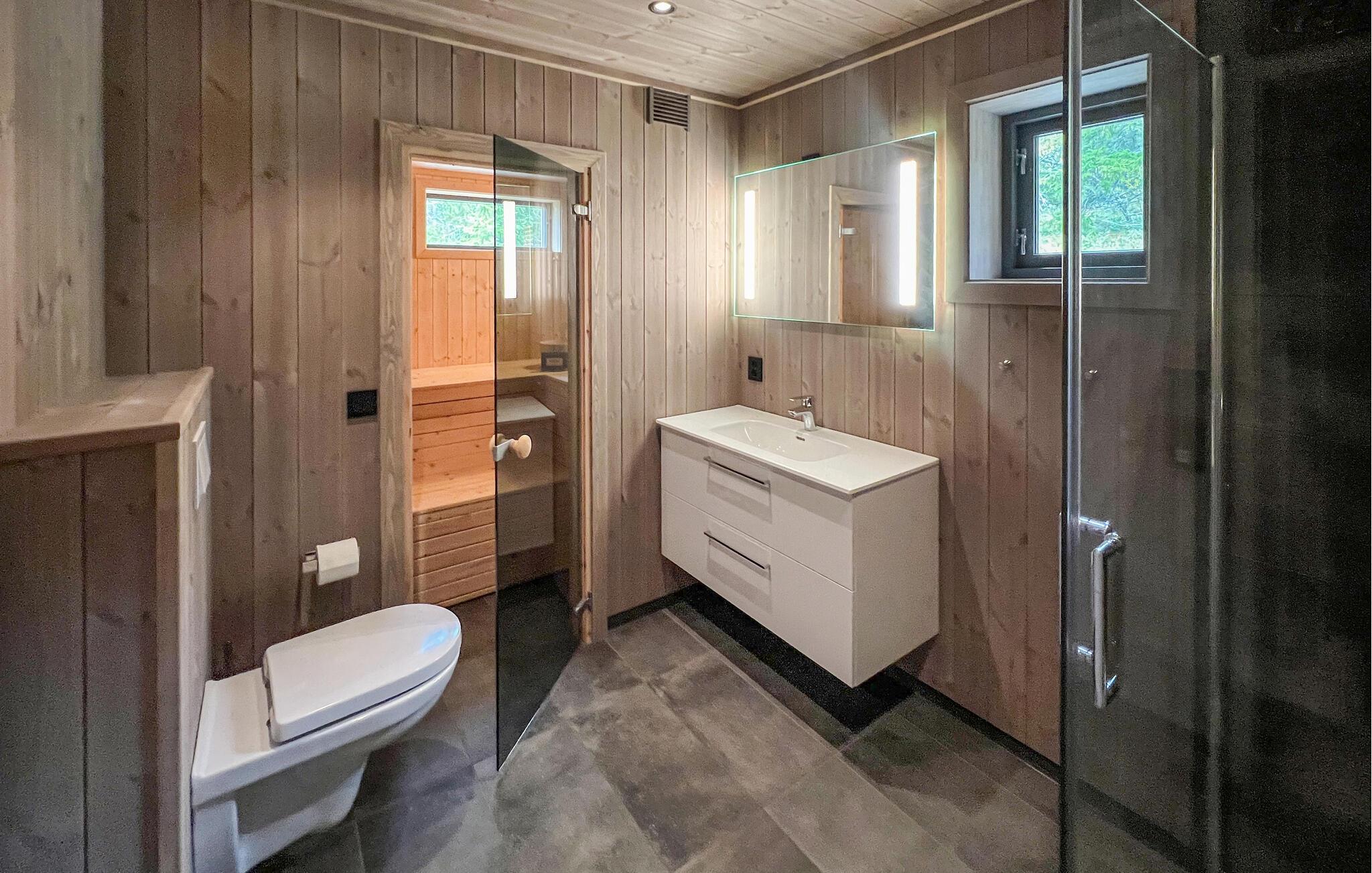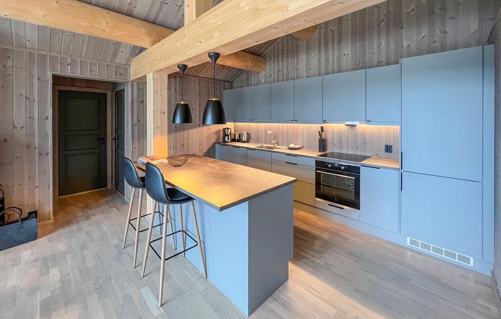 Verbringen Sie einen unvergesslichen Urlaub in diesem stilvollen Ferienhaus, das mit seiner Lage inmitten der Natur Ruhe und Komfort vereint. Genießen Sie die klare Bergluft und die vielfältigen Möglichkeiten zu jeder Jahreszeit. Der großzügige Wohnbereich empfängt mit hohen Decken und sichtbaren Holzbalken. Machen Sie es sich auf den bequemen Sofas vor dem Kaminofen gemütlich und lassen Sie den Blick durch die großen Fenster in die weite Landschaft schweifen. Nutzen Sie den angrenzenden Essbereich mit modernem Holztisch für gemeinsame Mahlzeiten. Die offene Küche bietet eine Kochinsel mit Barhockern, und nach aktiven Tagen in der Natur lädt die Sauna zum Aufwärmen und Entspannen ein.