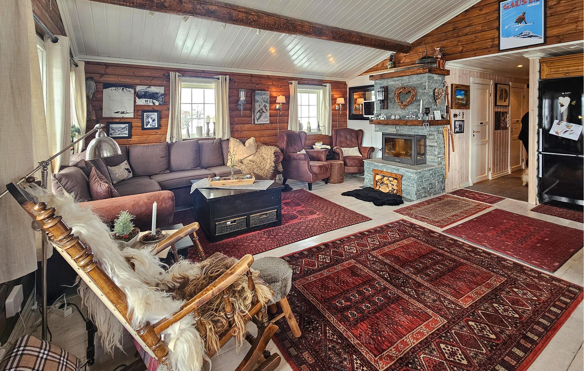 Ihr schönes Ferienhaus lädt zu einer entspannten Auszeit inmitten der norwegischen Natur ein. Freuen Sie sich auf einen Innenbereich voller Charme und traditioneller Atmosphäre. Machen Sie es sich in dem geräumigen Wohnzimmer bequem, das mit komfortablen Möbeln, Holzbalken an der Decke und einem Kamin ausgestattet ist. Verbringen Sie hier gemeinsame Abende am Esstisch, genießen Sie gemütliche Filmabende im separaten TV-Raum oder entspannen Sie bei guten Gesprächen auf den großzügigen Sofas.