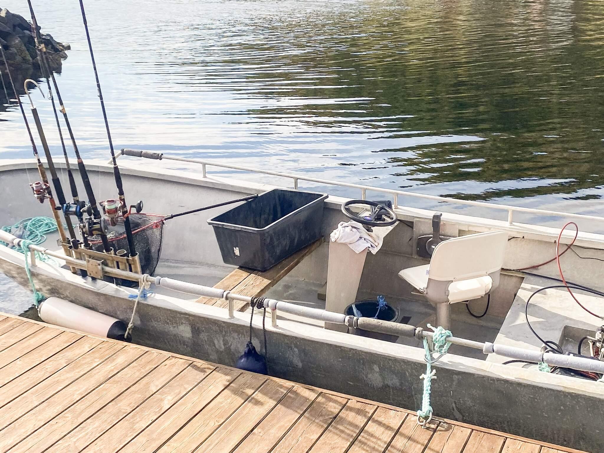 *ein 16 Fuß langes, selbstlenzendes Boot aus Aluminium mit Steuerstand, Echolot und 30 PS Außenborder.