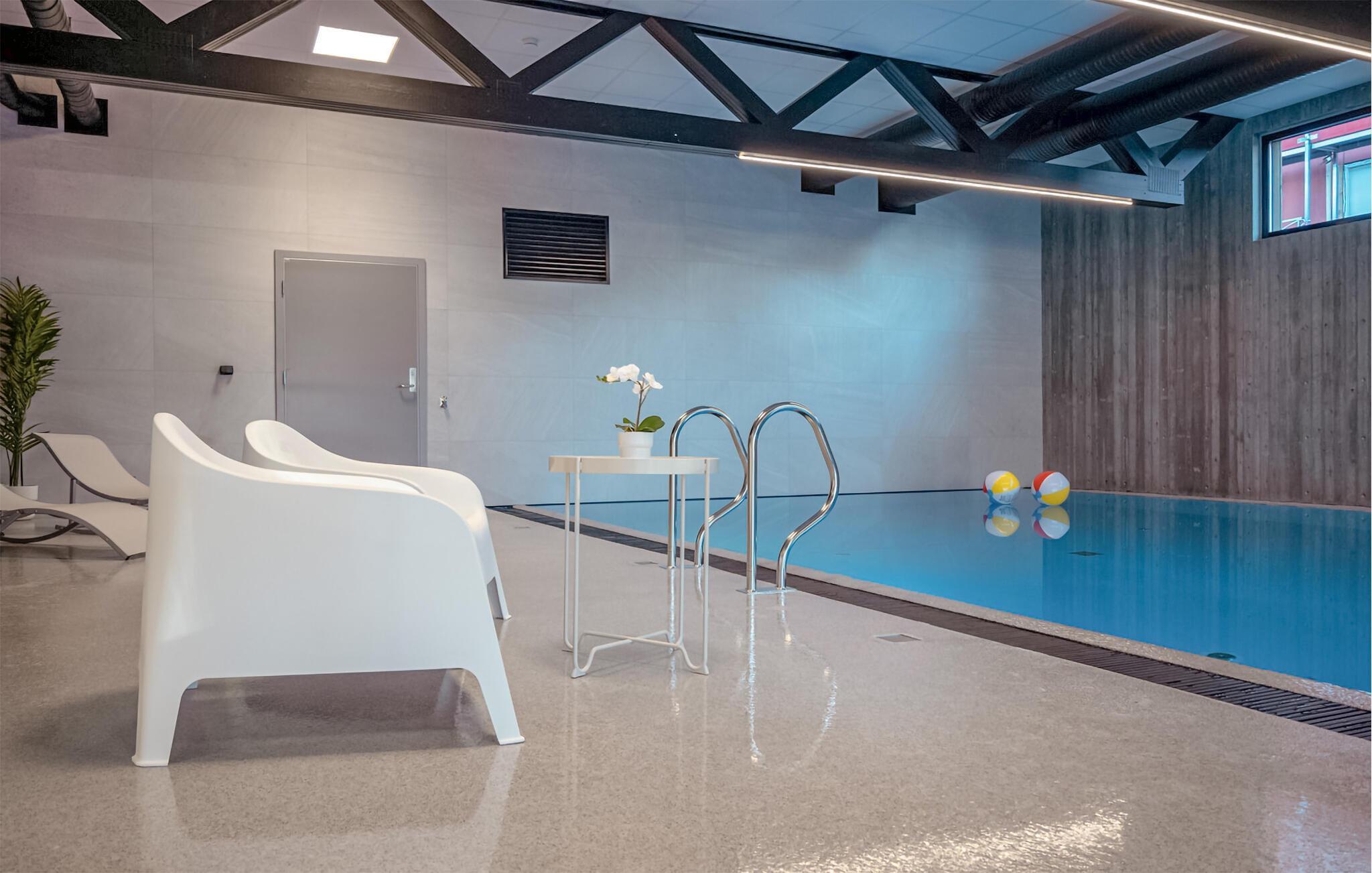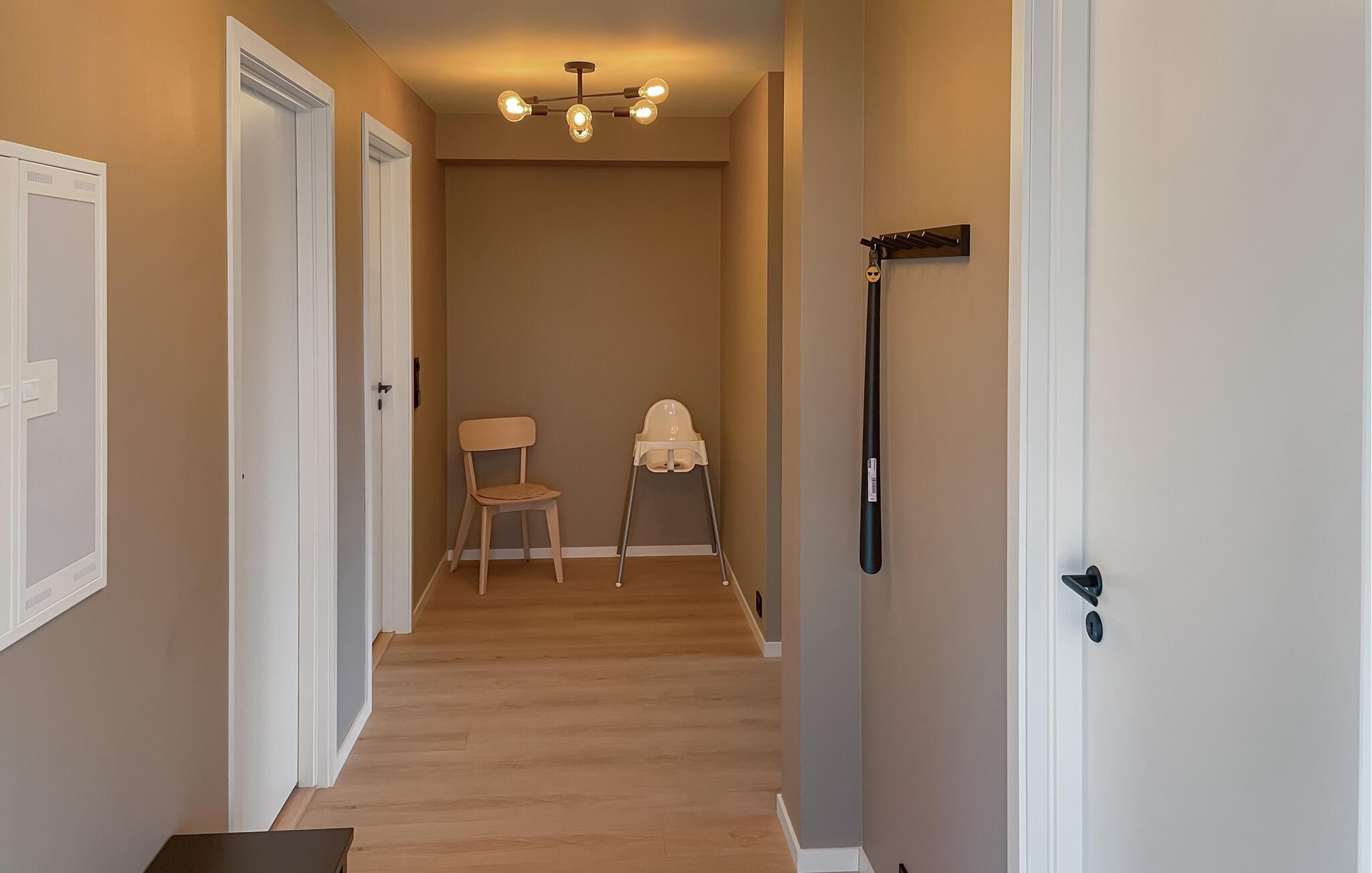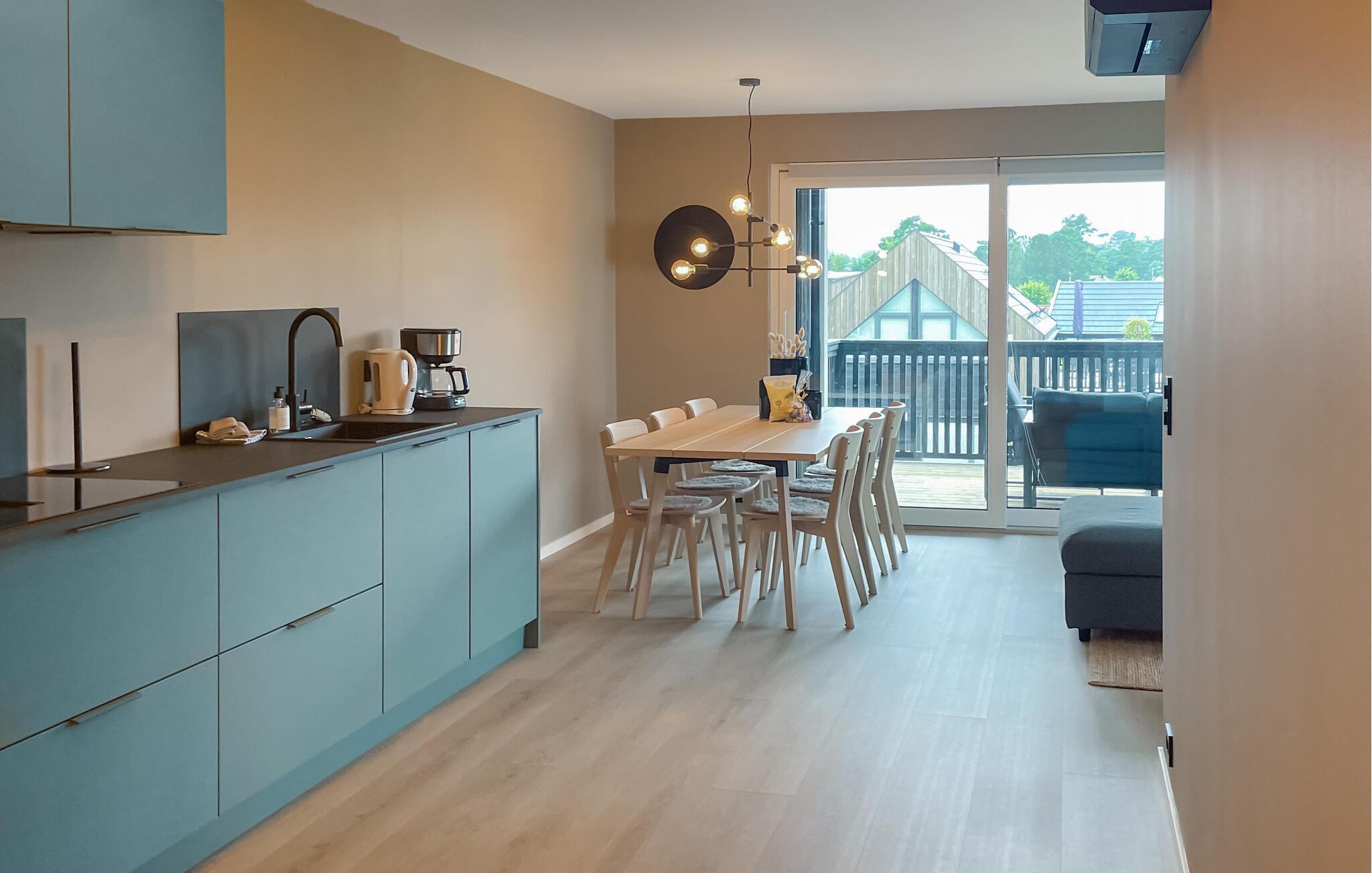 Freuen Sie sich auf Ihre komfortable Ferienwohnung mit Zugang zu einem Innenpool und einer Sauna. Im Innenbereich erwartet Sie ein modernes Ambiente mit Meeresblick. Am Esstisch neben der eleganten, offenen Küche können Sie gemeinsame Mahlzeiten genießen, während das gemütliche Sofa zu entspannten Stunden mit Blick ins Grüne einlädt.