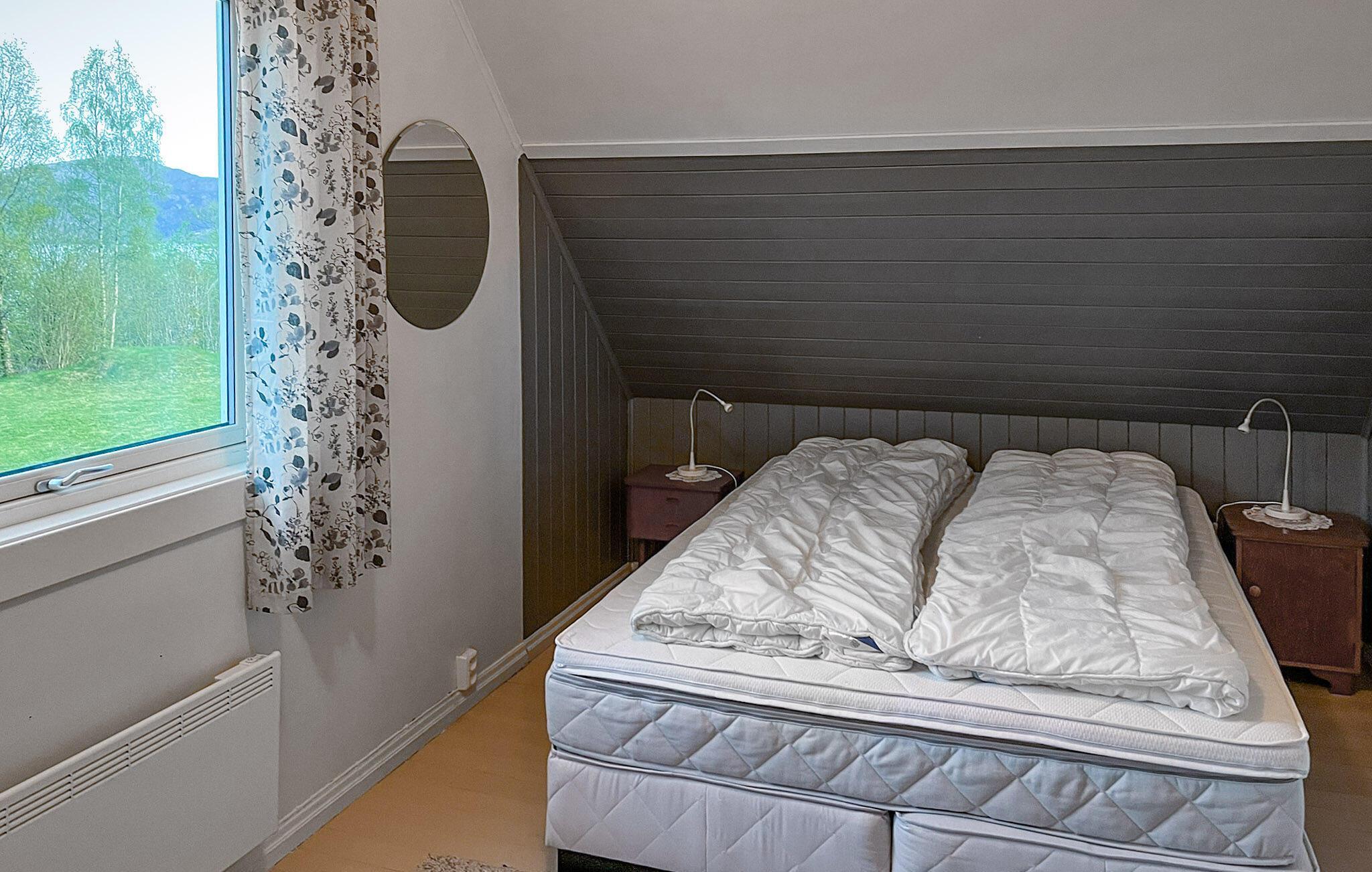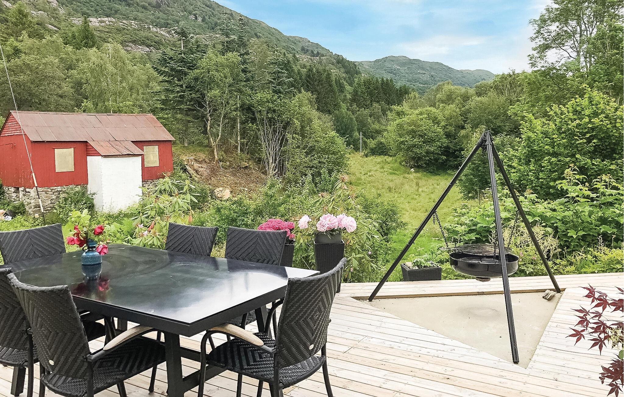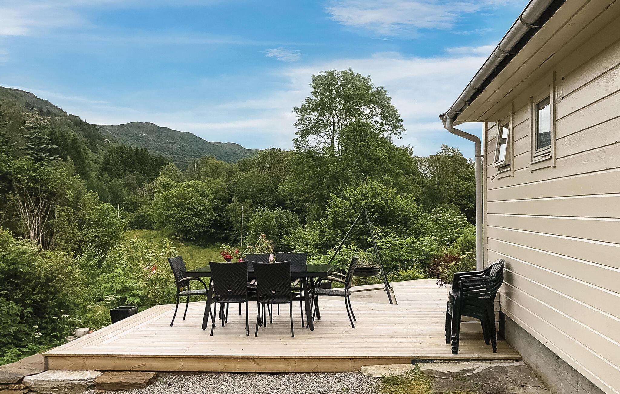 Ihr Ferienhaus nahe Hyllestad liegt direkt am Fjord und wartet mit einer idyllischen Lage und einem gemütlichen Ambiente auf. Genießen Sie Ihre Tage hier, umgeben von üppigem Grün und einer beeindruckenden Aussicht auf die umliegende Landschaft. Starten Sie den Tag mit einem entspannten Frühstück auf der sonnigen Terrasse, die mit Sitzgelegenheiten für die ganze Familie ausgestattet ist und sich auch für gesellige Grillabende eignet.