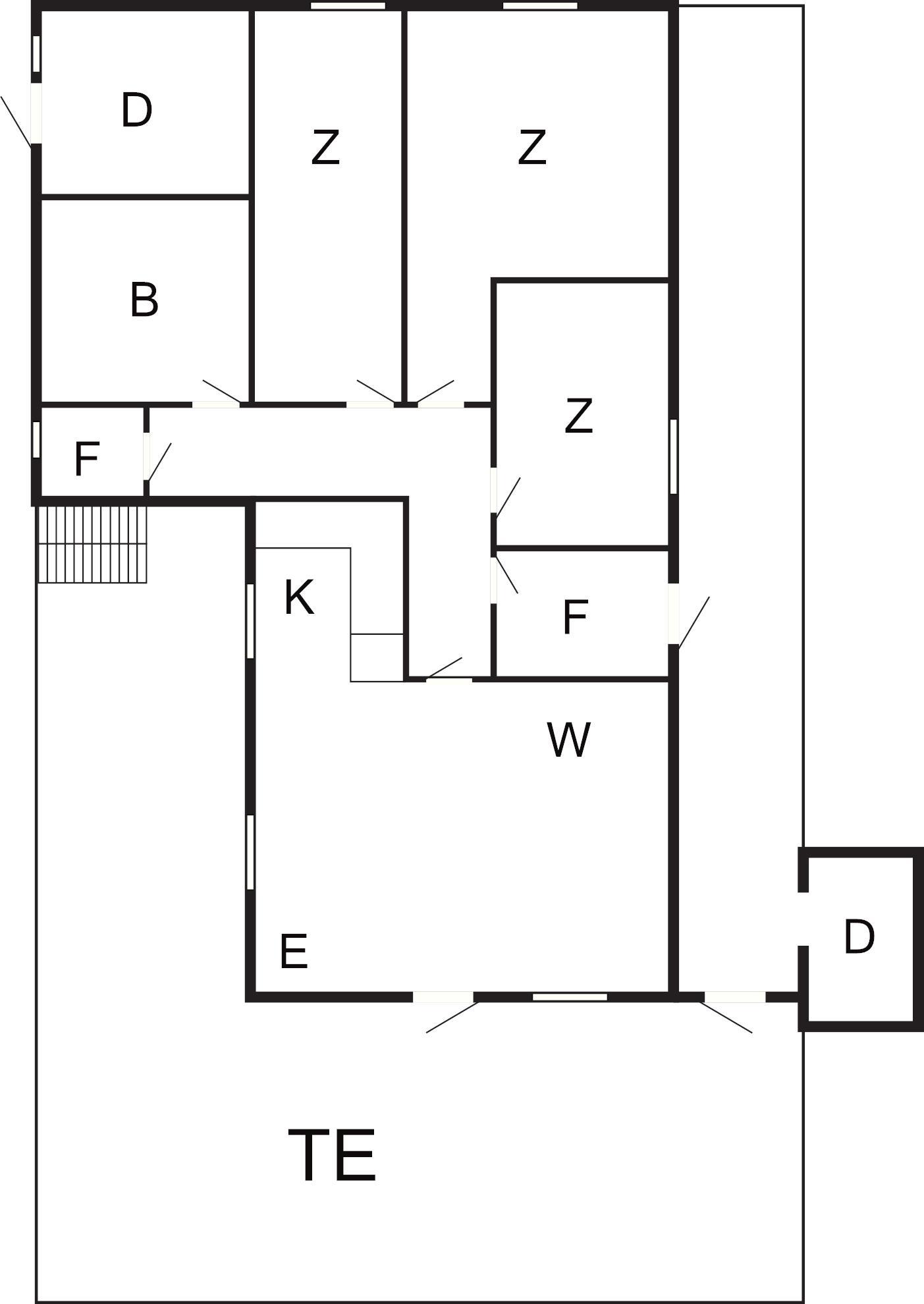 Das 76 m2 große Ferienhaus bietet Flur, Vorraum, Bad/Waschraum, Abstellraum sowie 3 Schlafzimmer; eines mit Doppelbett, eines mit Etagenbett, das dritte mit Familien-Etagenbett (120 cm breite Liegefläche unten, 75 cm breite Koje darüber) und einem Kinderbett.