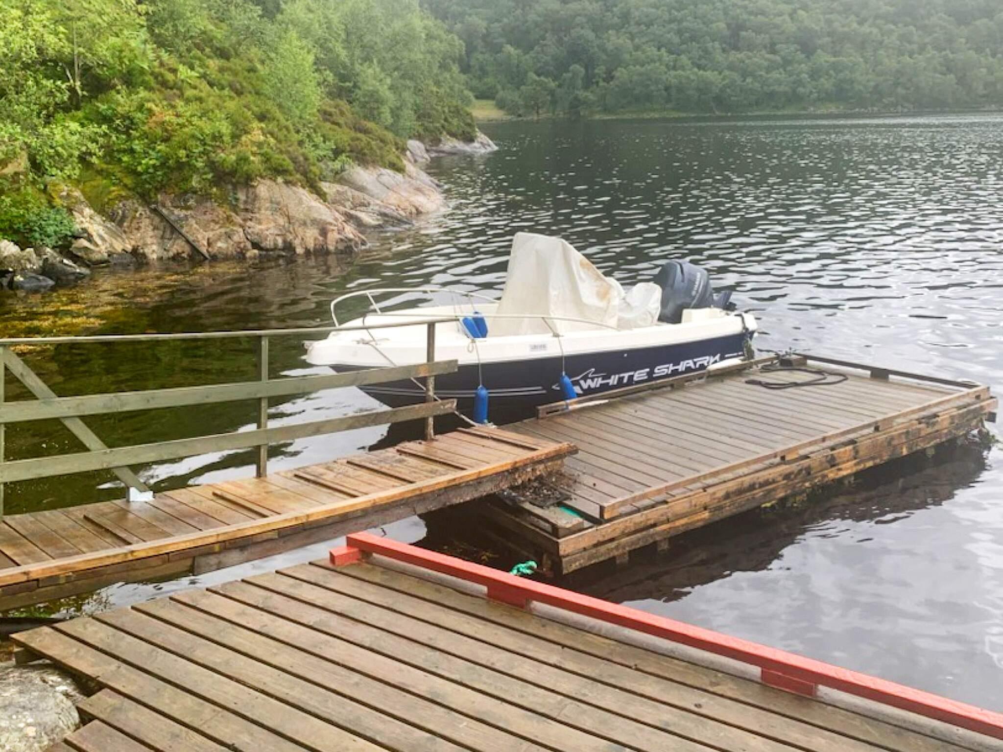 Das mietbare Boot liegt am Schwimmsteg direkt unterhalb des Ferienhauses.