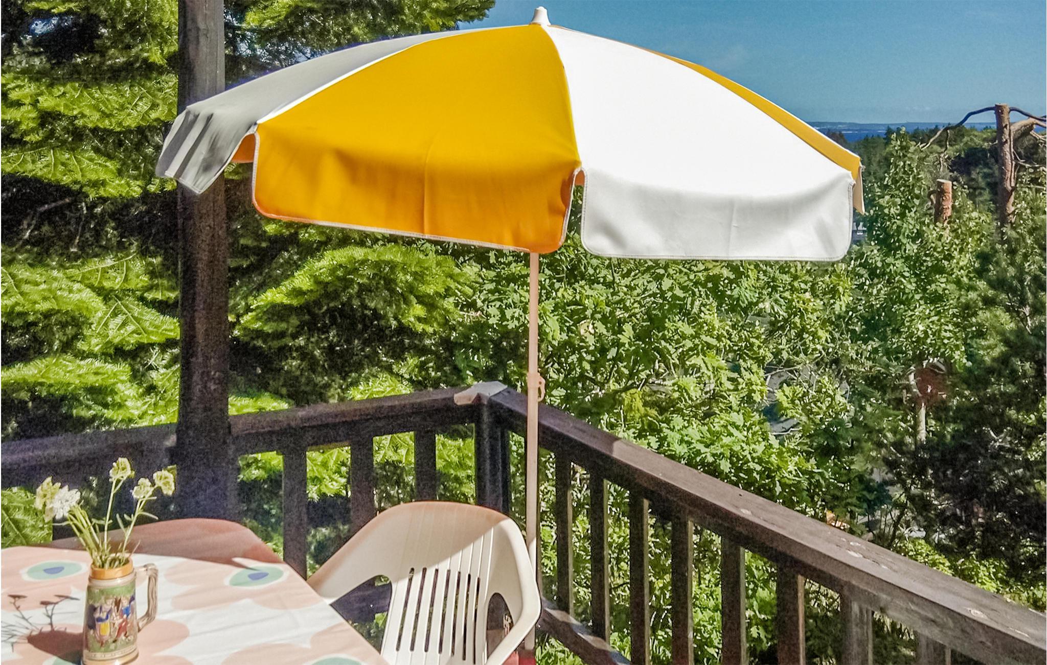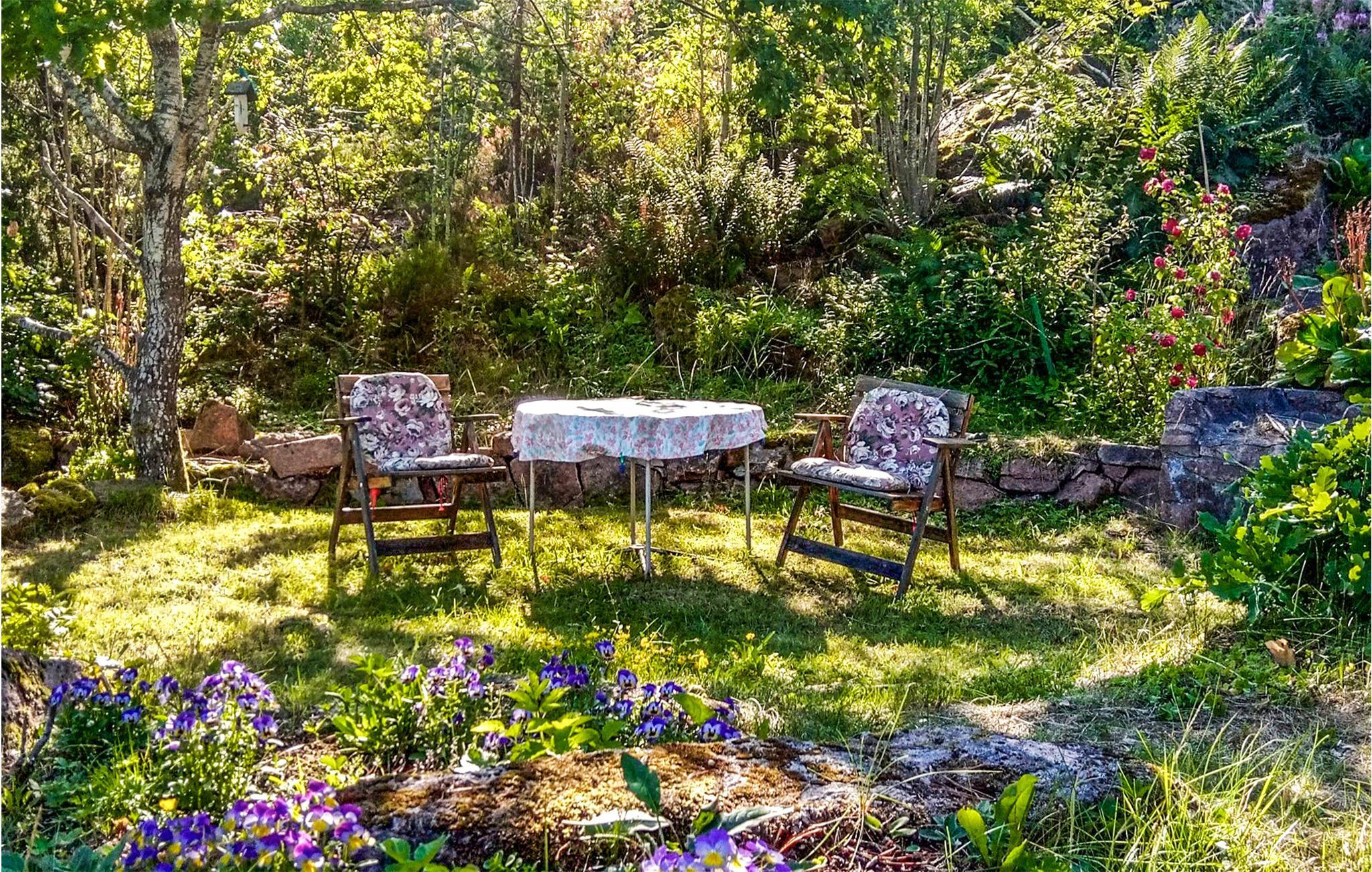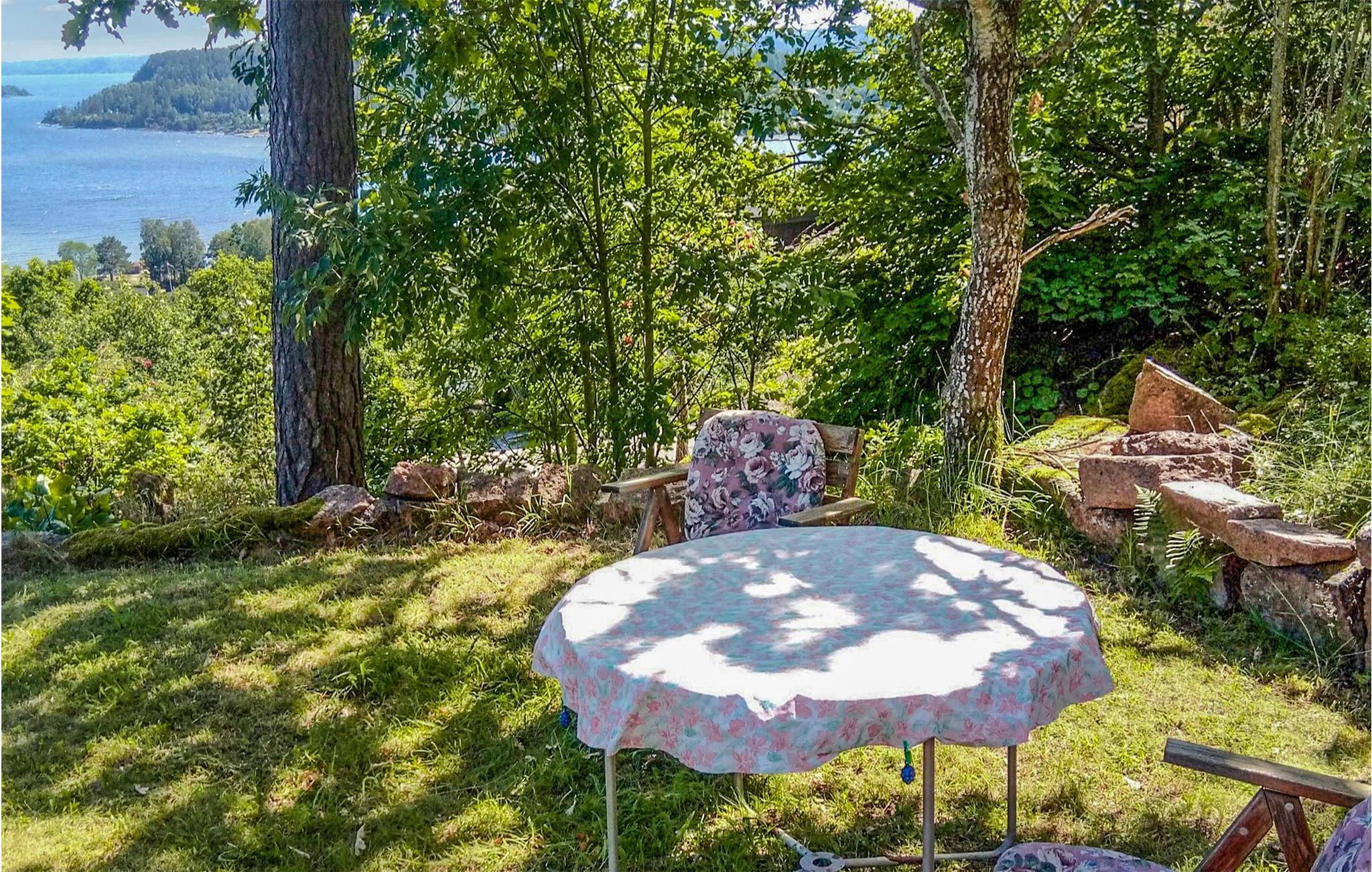 Der Außenbereich bietet ein schönes Naturgrundstück mit Sitzmöglichkeiten im Schatten der Bäume. Lassen Sie sich von der Natur inspirieren, genießen Sie Ihren Kaffee im Freien und beobachten Sie die Tierwelt der Umgebung. Die offene Terrasse mit Blick auf den Fjord ist ein idealer Ort für entspannte Stunden.