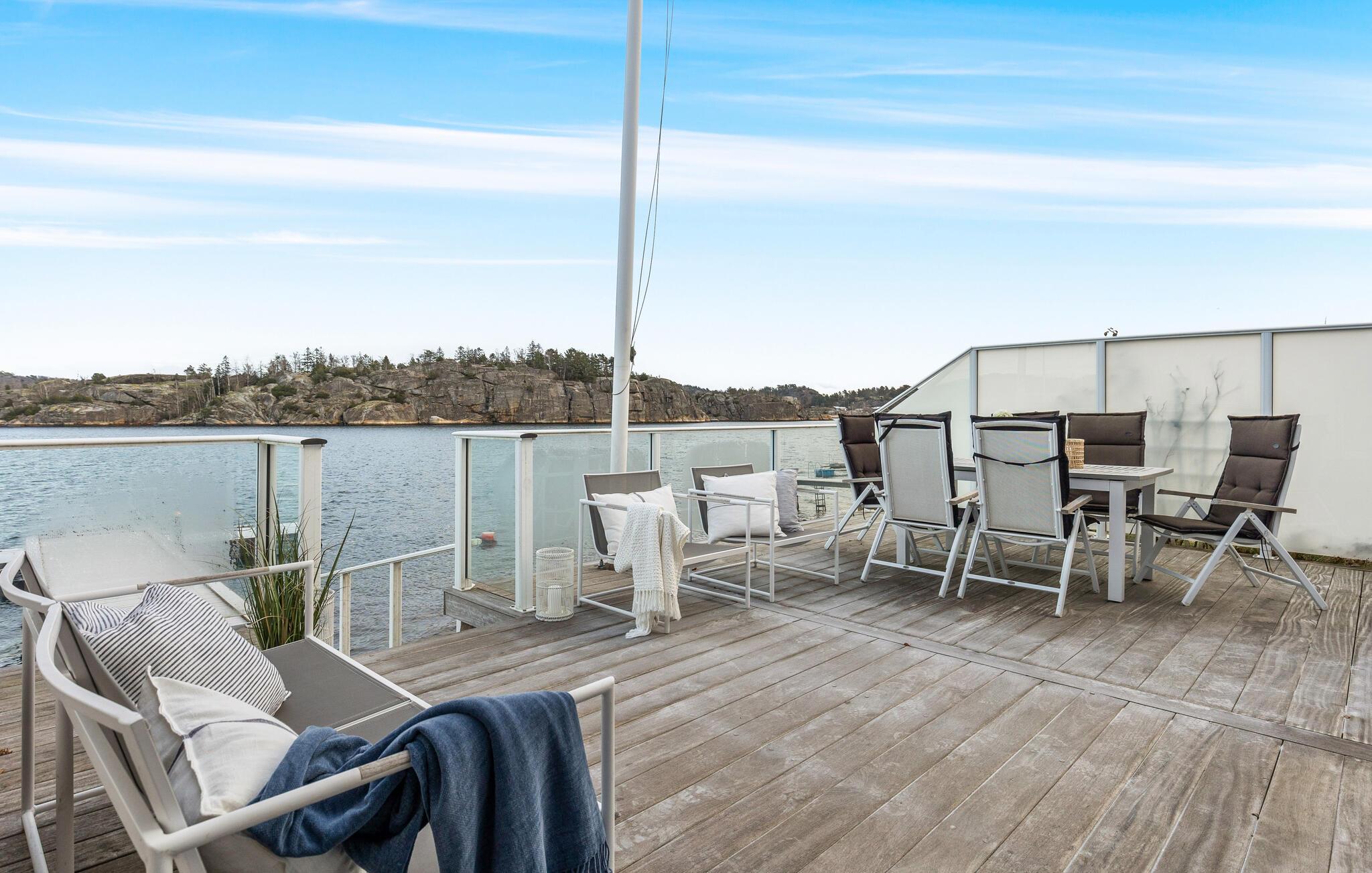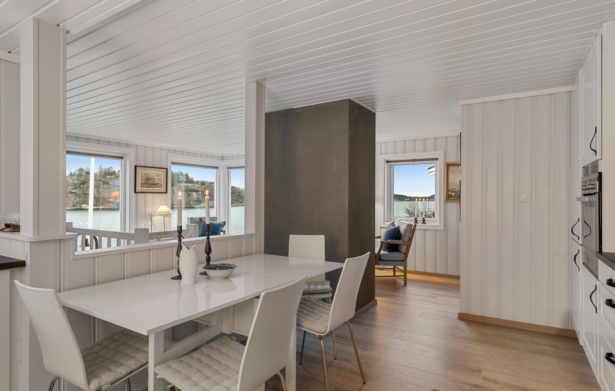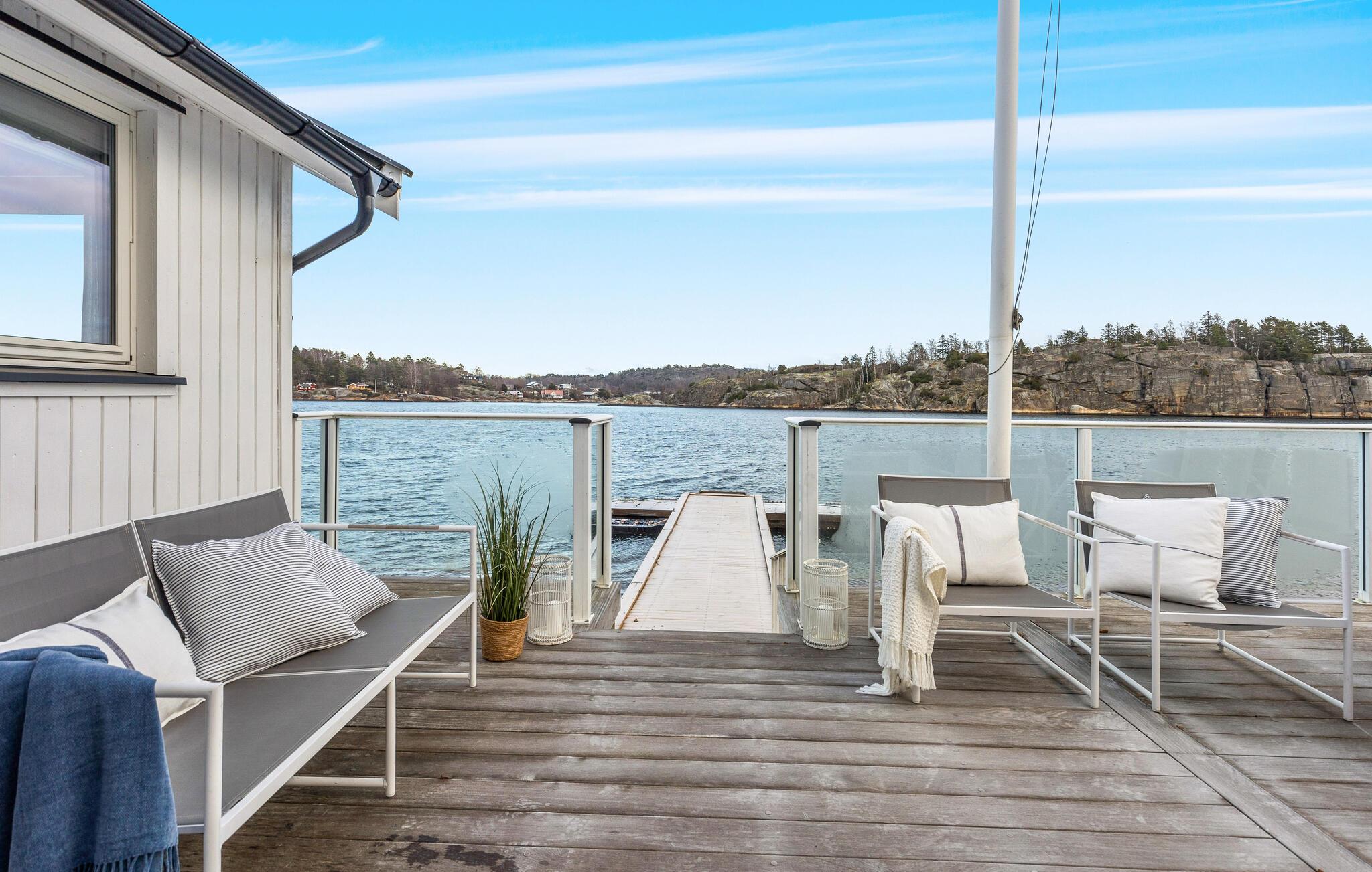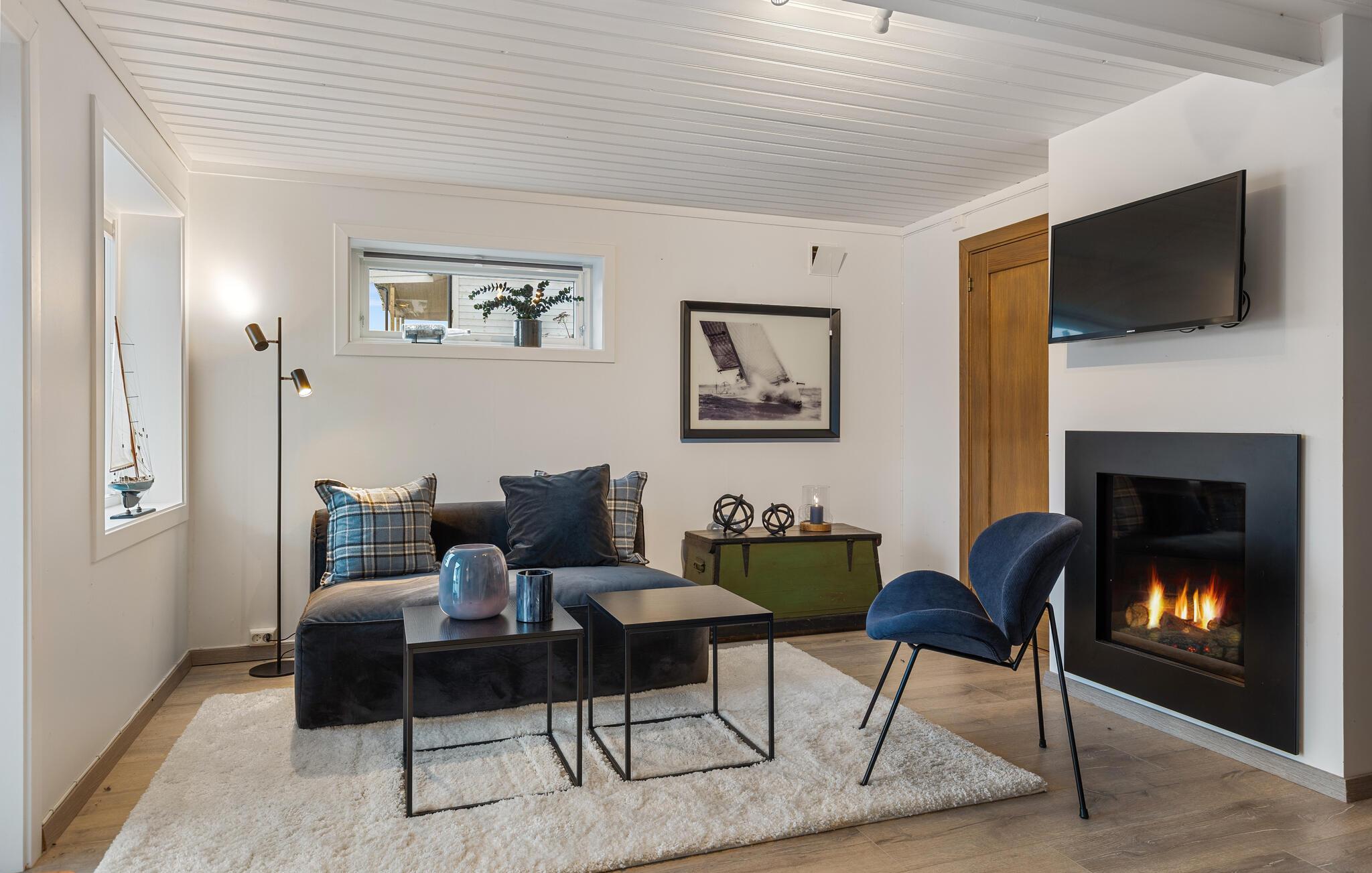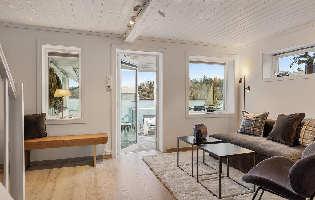 Dieses wunderschöne Ferienhaus auf Vesterøya besticht durch seine herrliche Lage mit eigener Uferlinie und Zugang zum Badesteg. Große Fenster geben Ihnen den Blick auf den glitzernden Fjord frei und füllen den offenen Wohnraum mit Licht. Ein Kamin sorgt an kühleren Tagen für eine gemütliche Atmosphäre, während die stilvolle Einrichtung und das helle Ambiente Sie willkommen heißen. Auf der Terrasse können Sie Ihre Mahlzeiten mit Blick auf das Wasser genießen oder einfach die Ruhe der Umgebung auf sich wirken lassen.