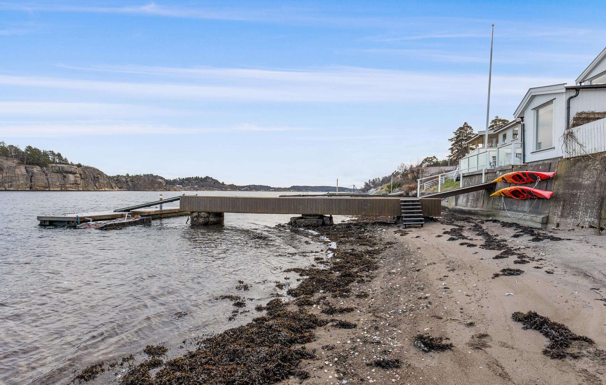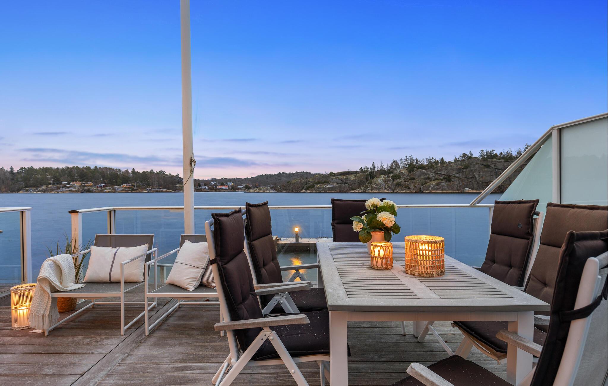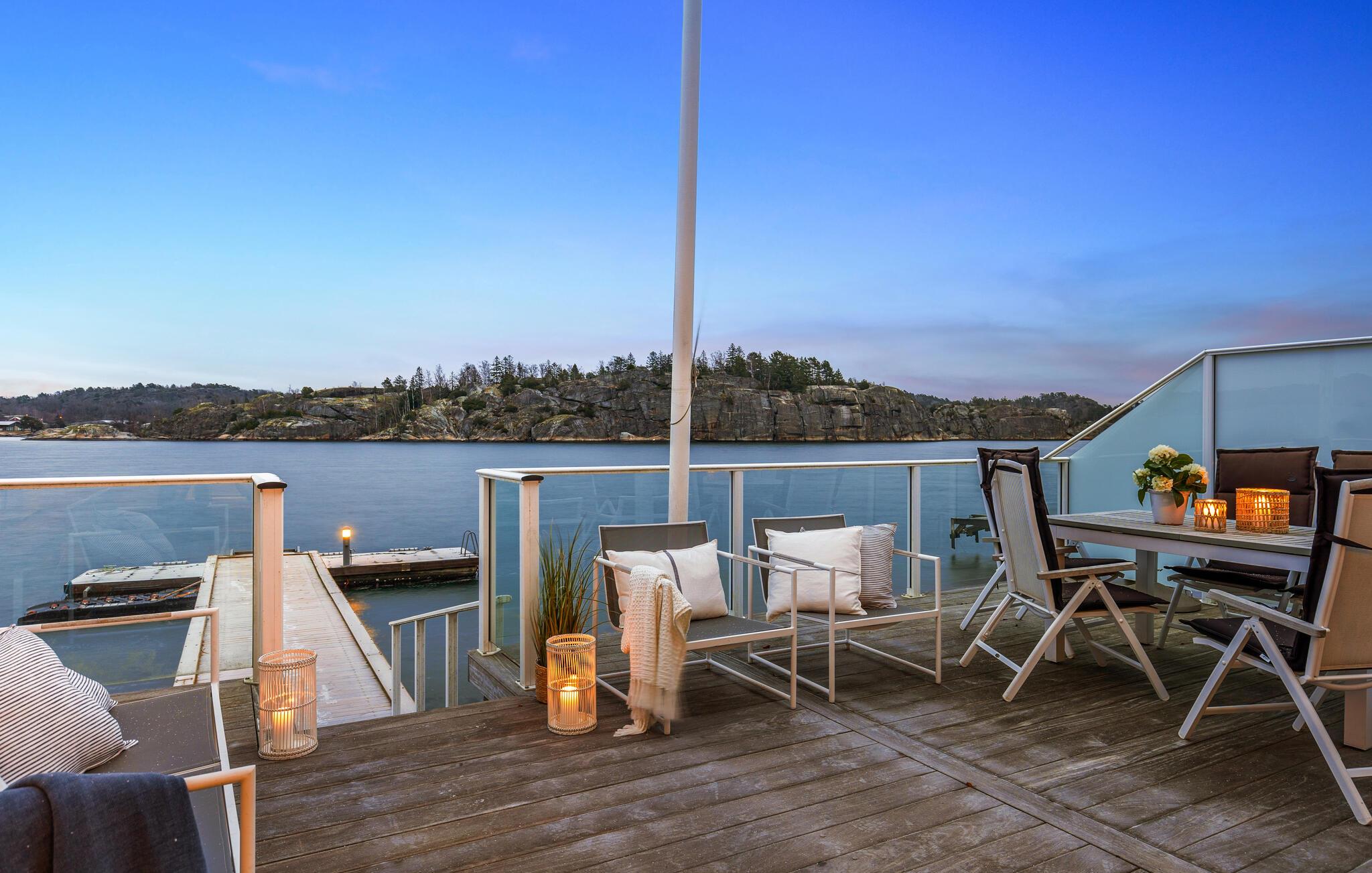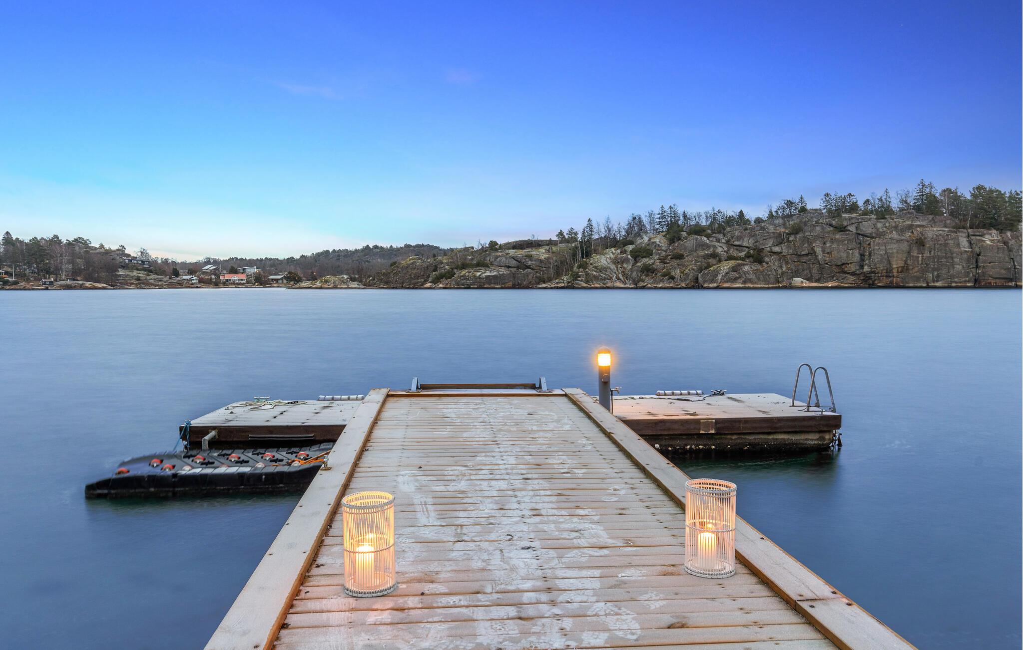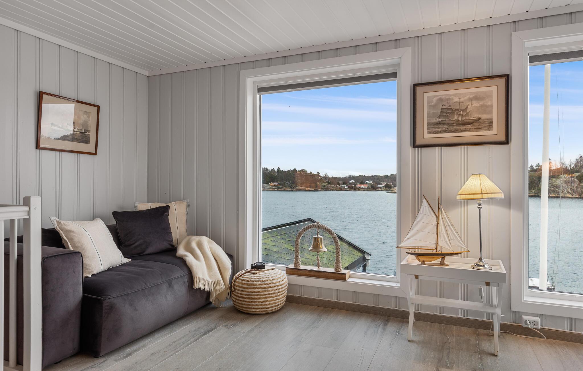 Dieses wunderschöne Ferienhaus auf Vesterøya besticht durch seine herrliche Lage mit eigener Uferlinie und Zugang zum Badesteg. Große Fenster geben Ihnen den Blick auf den glitzernden Fjord frei und füllen den offenen Wohnraum mit Licht. Ein Kamin sorgt an kühleren Tagen für eine gemütliche Atmosphäre, während die stilvolle Einrichtung und das helle Ambiente Sie willkommen heißen. Auf der Terrasse können Sie Ihre Mahlzeiten mit Blick auf das Wasser genießen oder einfach die Ruhe der Umgebung auf sich wirken lassen.