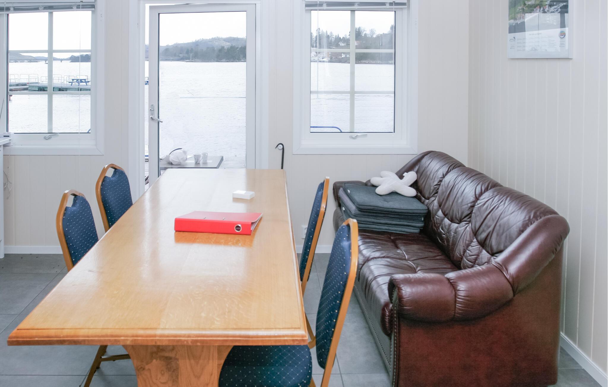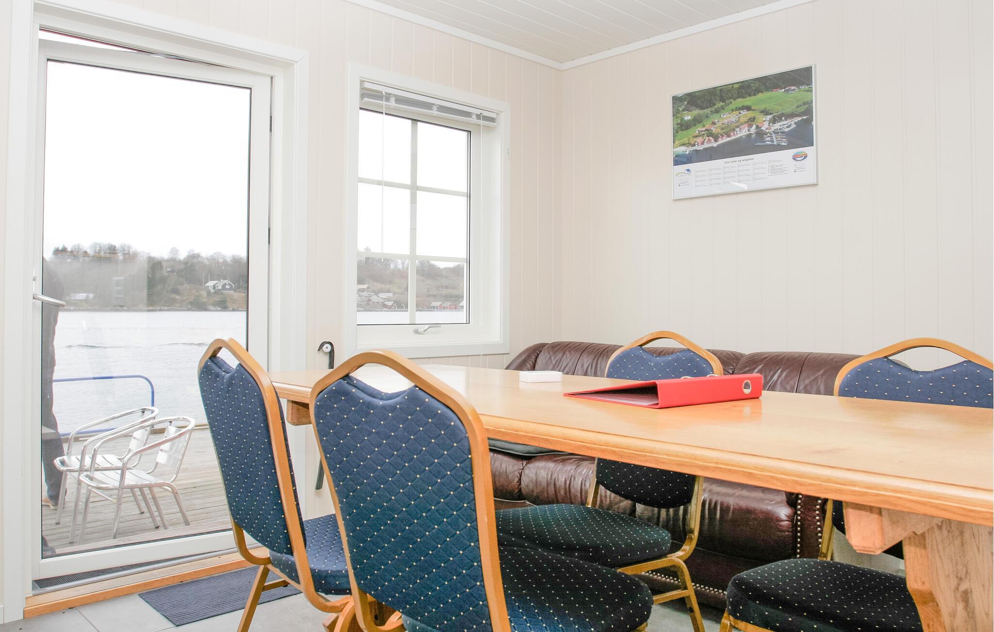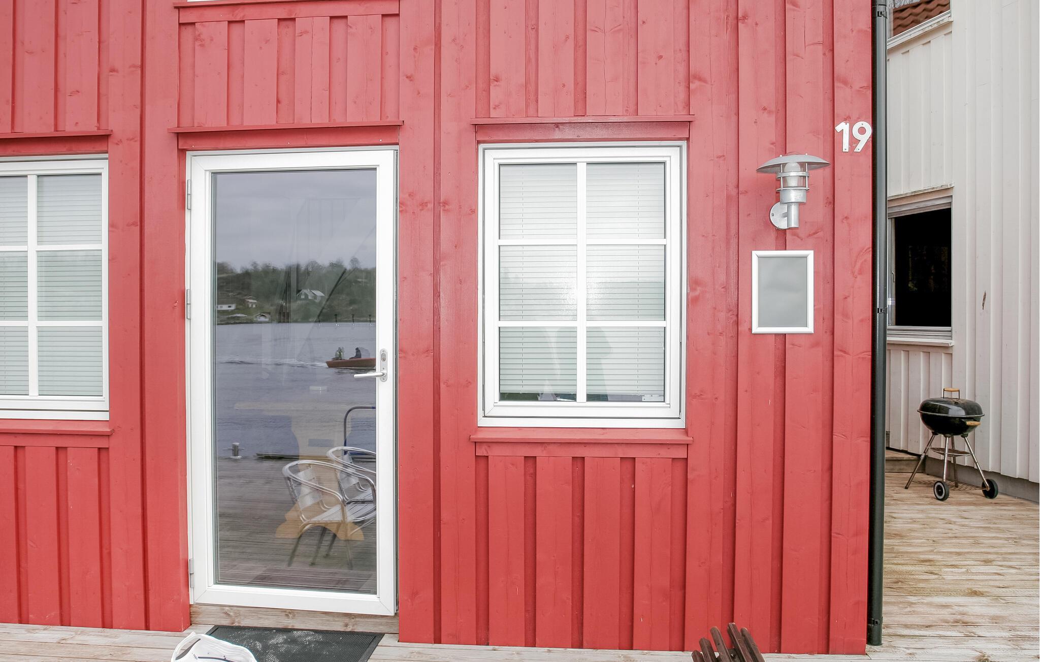 Treten Sie durch die Tür hinaus auf die Holzterrasse und stehen nur wenige Meter vom Wasser entfernt. Veranstalten Sie hier gesellige Grillabende und kommen Sie mit Ihren Nachbarn ins Gespräch. Springen Sie von der Terrasse ins Wasser oder werfen Ihre Angeln aus und genießen das Fjordpanorama, das vor Ihren Füßen liegt.