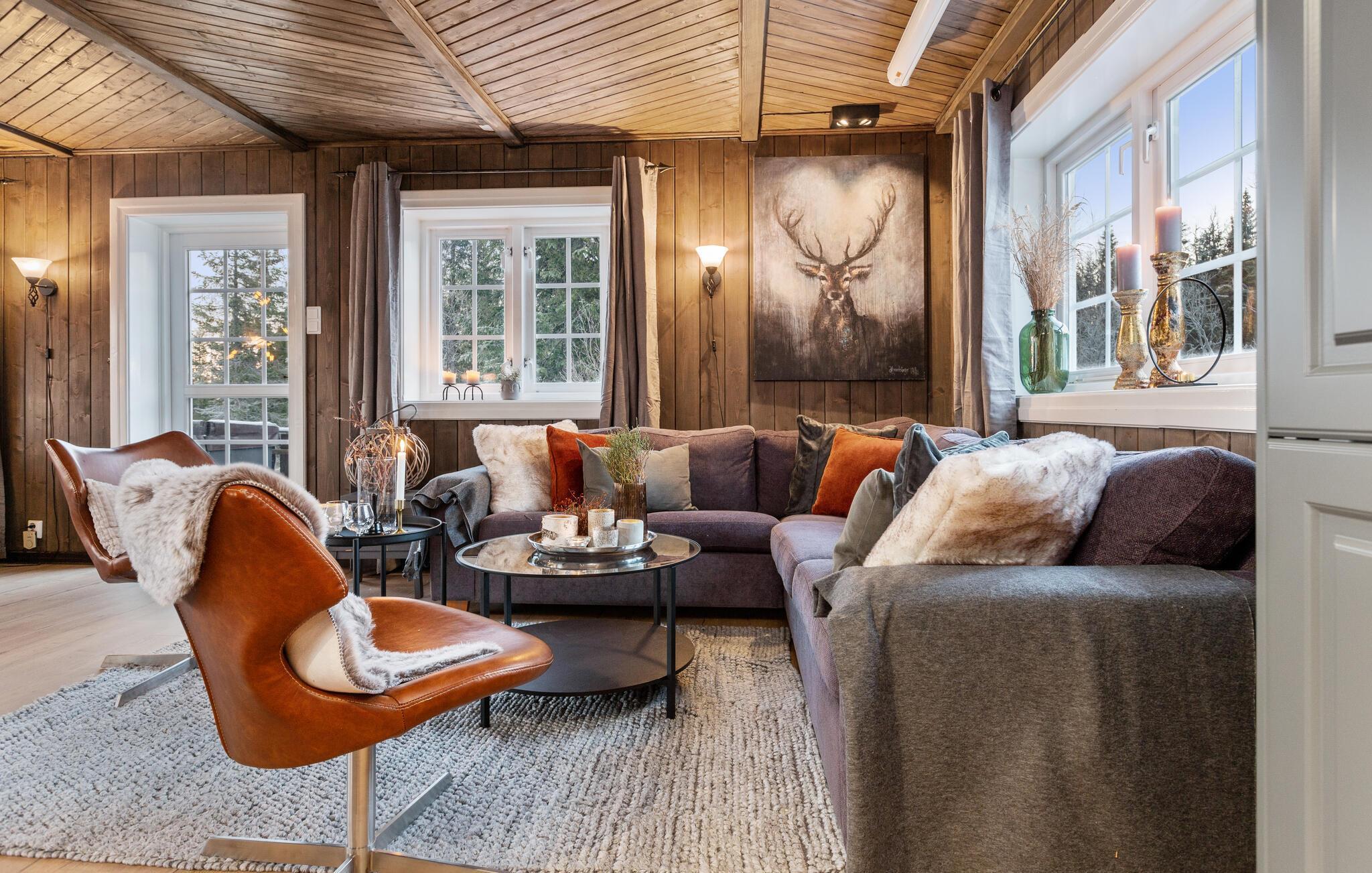 Im Außenbereich entfaltet sich der Charme der norwegischen Natur in seiner ganzen Pracht. Hier können Sie die Natur erkunden und die schöne Aussicht genießen. Wer noch mehr Erholung wünscht, hüpft in den bezaubernden Außen-Whirlpool und anschließend in die warme Sauna. Nutzen Sie die Gelegenheit, die Umgebung bei einem Tagesausflug zu erkunden. Unternehmen Sie beispielsweise eine Wanderung im Helvete Naturpark, wo Sie Nordeuropas größte Klamm bestaunen können. Im Winter wird Skeikampen zu einem Schnee- und Skiparadies für Jung und Alt.
