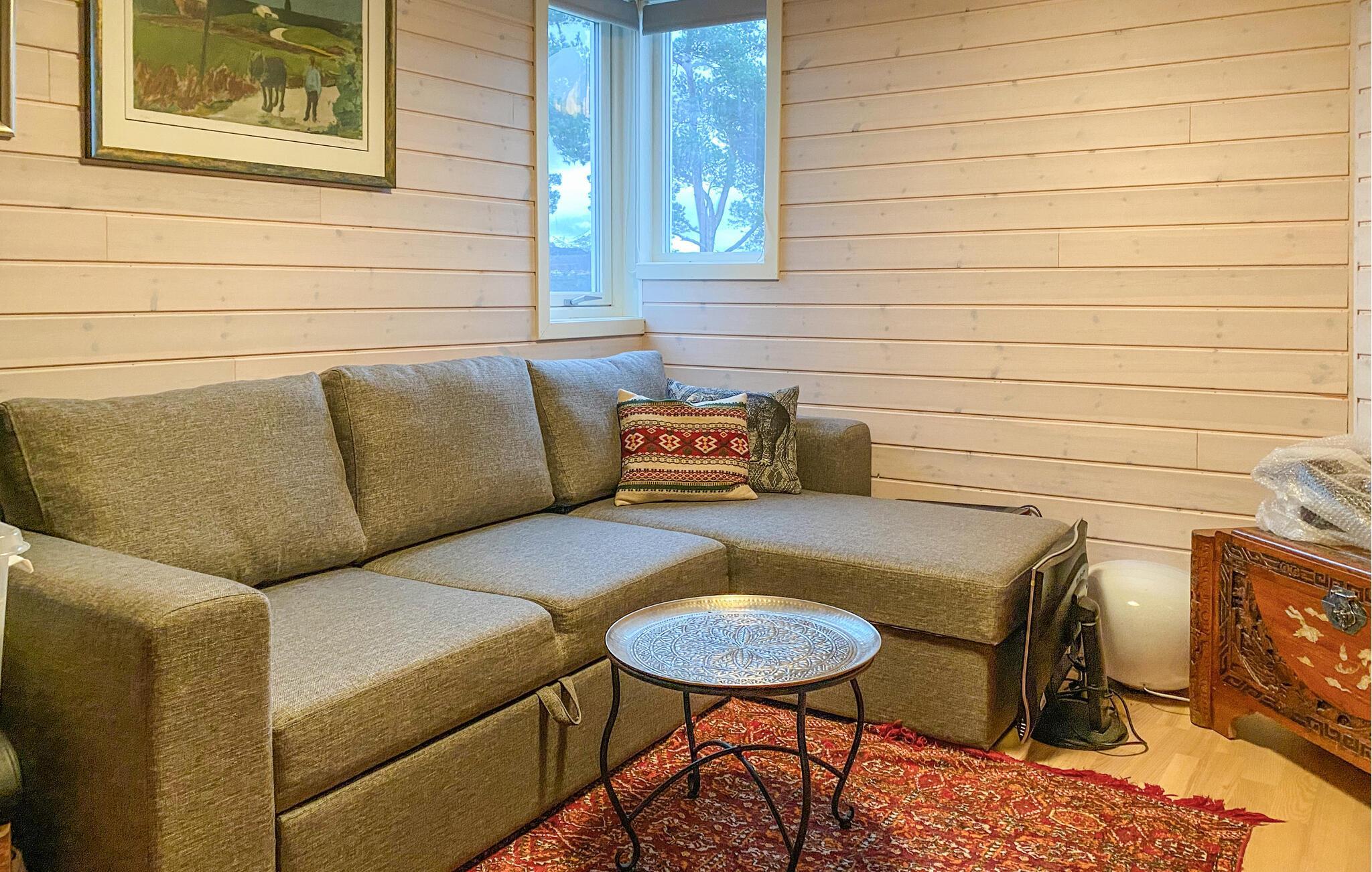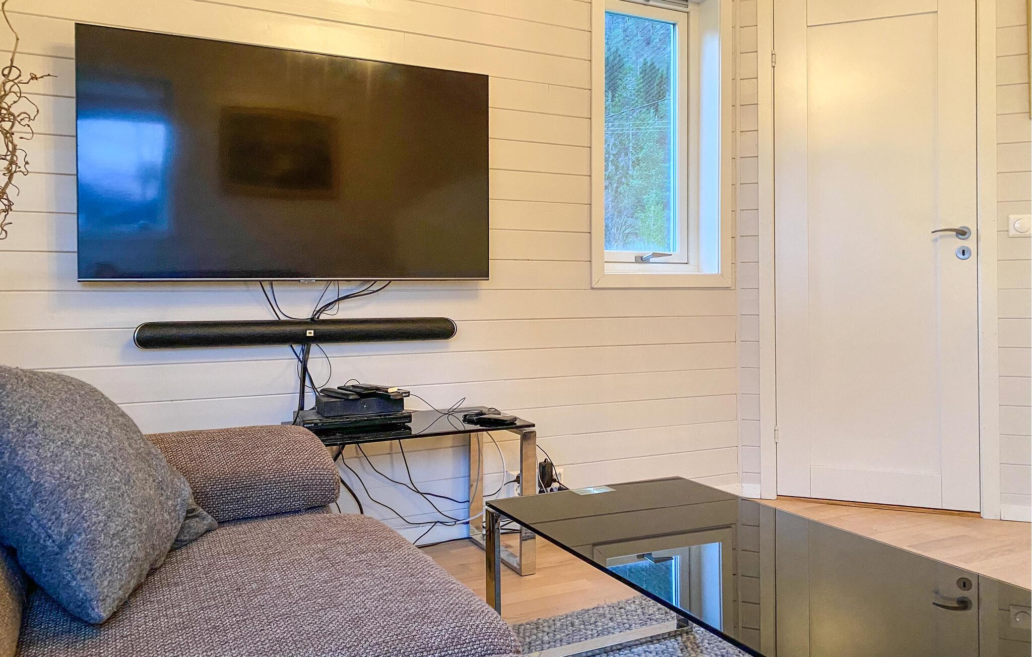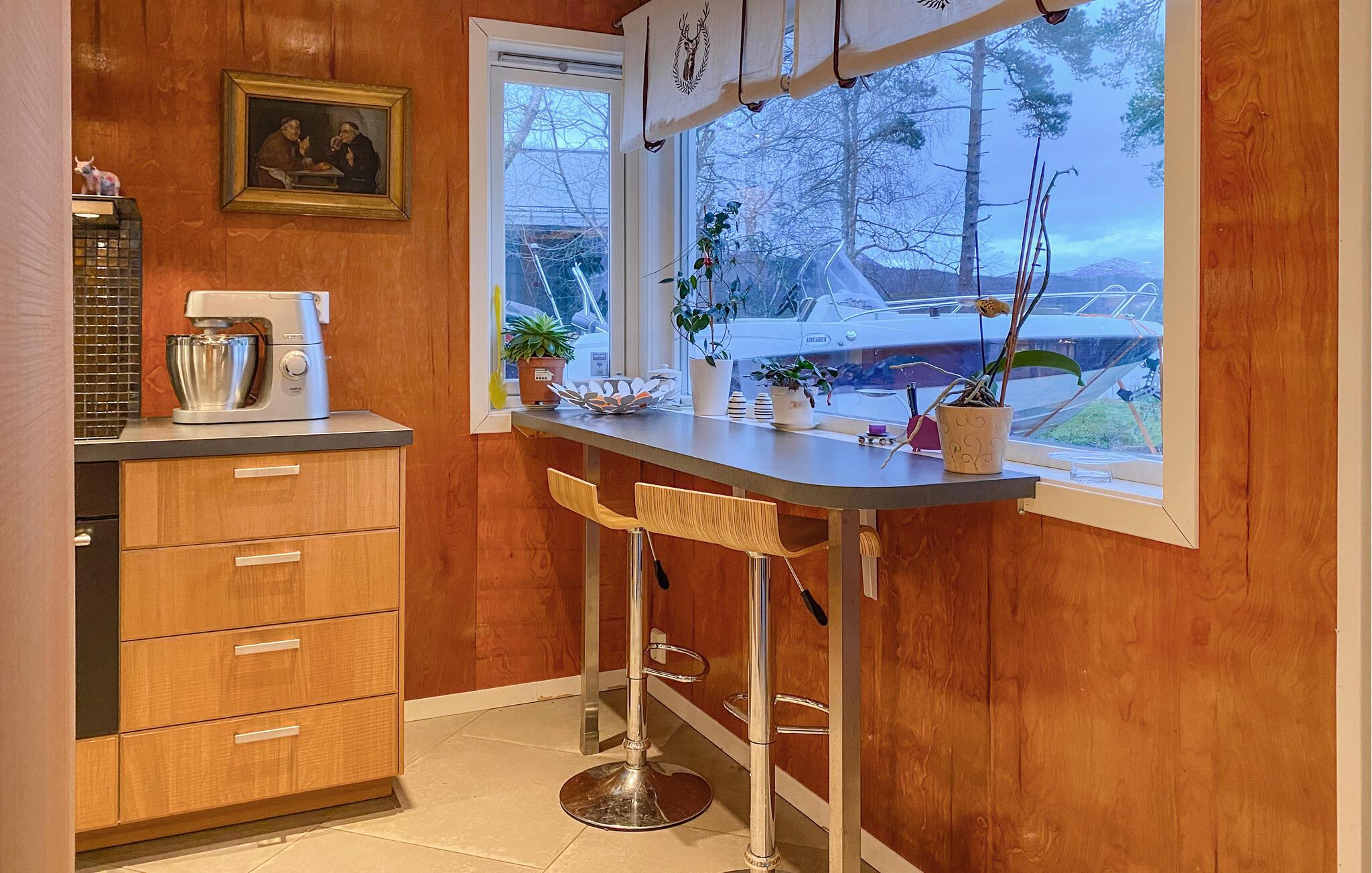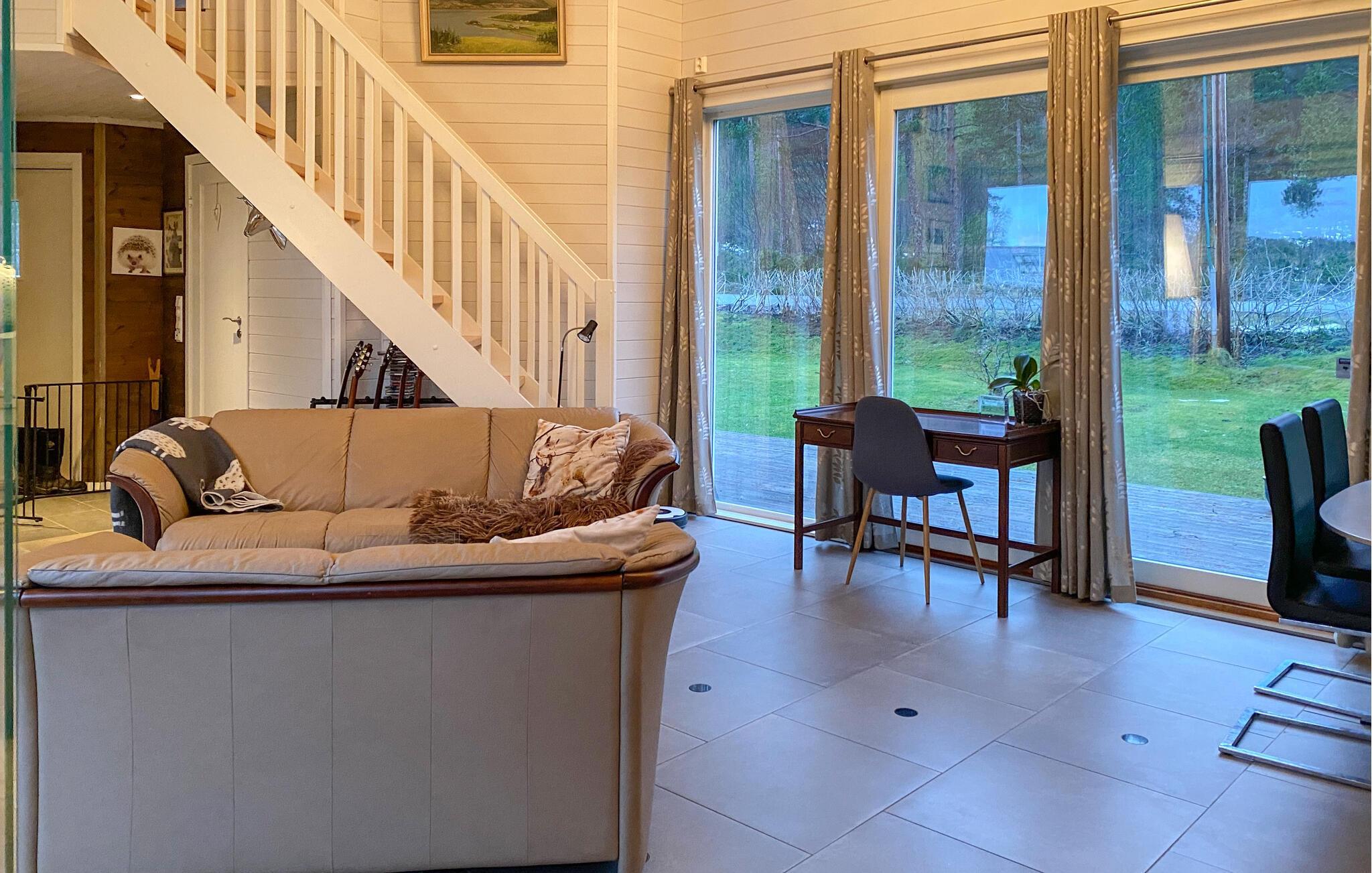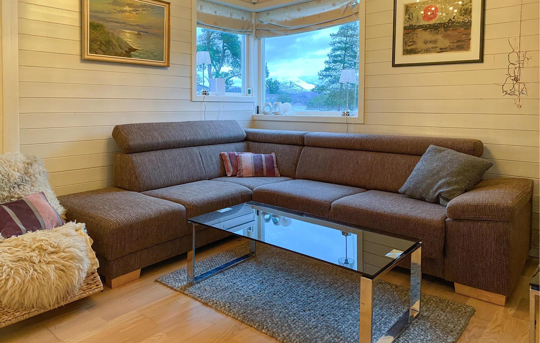 Mit einem traumhaften Blick auf die Berge und den Fjord lädt dieses großzügige Feriendomizil dazu ein, zur Ruhe zu kommen und sich vom Alltag zu erholen. Setzen Sie sich mit einem frisch gebrühten Kaffee ans Panoramafenster der behaglichen Küche und lassen Sie den Blick über die beeindruckende Landschaft schweifen. Entspannen Sie im gemütlichen Wohnzimmer, schauen Sie einen Film oder genießen Sie die wohlige Atmosphäre bei einem Glas Wein oder einer spannenden Lektüre.